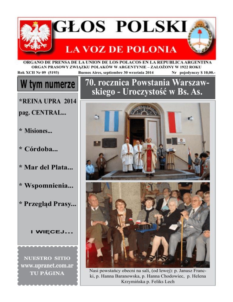 ORGAN PRASOWY ZWIĄZKU POLAKÓW W ARGENTYNIE – ZAŁOŻONY W 1922 ROKU Rok XCII Nr 09 (5193) Buenos Aires, septiembre 30 września 2014 Nr pojedynczy $ 10,00.- W tym numerze 70. rocznica Powstania Warszaw*REINA UPRA 2014 skiego - Uroczystość w Bs. As. pag. CENTRAL... * Misiones... * Córdoba... * Mar del Plata... * Wspomnienia... * Przegląd Prasy... i więcej... NUESTRO SITIO www.upranet.com.ar TU PÁGINA Nasi powstańcy obecni na sali, (od lewej): p. Janusz Francki, p. Hanna Baranowska, p. Hanna Chodowiec, p. Helena Krzymińska p. Feliks Lech Str. 2 Głos Polski Buenos Aires, Nr 09 / 2014 Conmemoración del 70 Aniversario del Levantamiento de Varsovia El domingo 31 de Agosto llevamos a cabo el acto de Conmemoración del Levantamiento de Varsovia en La Casa Polaca (Dom Polski). Previamente asistimos a la Misa en Nuestra Señora de Guadalupe para recordar a los caídos, realizar una ofrenda floral y llevar los estandartes para la ocasión. Todo el evento llevó gran esfuerzo y dedicación de cada una de las personas que participaron, tanto actuando como aquellos que estuvieron en cada detalle, luces, video, ambientación, etc... Y no faltó ninguno, hasta los más pequeños (zuchy) aportaron su parte, así como harcerze y harcerki que se esmeraron haciendo las viejas propagandas que se utilizaron durante la 2da Guerra. Realmente hay que destacar la emotividad que tuvo el evento para el público, como para los que estuvimos en la organización, y aún más para los que fueron el centro de este reconocimiento: Sra. Hanna Baranowska, Sra. Hanna Chodowiec, Sra. Helena Krzyminska, Sr. Janusz Francki y Sr. Feliks Lech, quienes participaron en el Levantamiento de Varsovia. Comparto algunas fotos y video con todos ustedes para que hablen por si solas y agreadezco por las mismas a Krysia Misa, Krysia Prazmowska y Maryś Prejc . Fuente: http://harcerstwoargentyna. blogspot.com.ar/ Czuwaj!!! (5193) (5193) Głos Polski Buenos Aires, Nr 09 / 2014 Str. 3 Str. 4 Głos Polski Buenos Aires, Nr 09 / 2014 (5193) IPN od lat prowadzi badania naukowe nad Polskim Państwem Podziemnym. Efektem tego są monumentalne prace, takie jak monografia Waldemara Grabowskiego „Polska tajna administraDzień Polskiego Państwa Podziemnego jest cja cywilna”, a także inne książki, liczne artykuły świętem państwowym, obchodzonym co roku w periodykach, materiały edukacyjne dla szkół. 27 września. Uchwalone zostało 11 września Walka formacji podziemnego państwa z okupan1998 r. przez Sejm RP. tami jest tematem konferencji, konkursów, wystaw. Poniżej przedstawiamy wybrane pozycje z dorobku IPN, poświęcone Polskiemu Państwu Podziemnemu. 27 września - Dzień Polskiego Państwa Podziemnego. Źródło: http://ipn.gov.pl/wydzial-prasowy/ komunikaty/dzien-polskiego-panstwapodziemnego 30 ta Rocznica Męczeńskiej Śmierci Bł. Ks. Jerzego Popiełuszki. 27 września 1939 roku w oblężonej przez Niemców Warszawie gen. Michał Tokarzewski-Karaszewicz utworzył wraz z grupą oficerów WP Służbę Zwycięstwu Polski – konspiracyjną organizację wojskową, mającą kontynuować walkę przeciwko obydwu okupantom. 4 grudnia 1939 roku gen. Sikorski powołał Związek Walki Zbrojnej z siedzibą w Paryżu jako organizację wojskową o charakterze apolitycznym i ogólnonarodowym. 14 lutego 1942 roku generał Władysław Sikorski przekształcił ZWZ w Armię Krajową (AK). Jednym z głównych zadań dowództwa stało się przyspieszenie akcji scalenia wszystkich grup wojskowych w jedną organizację podległą rządowi RP na uchodźstwie. Najważniejszym celem AK było prowadzenie walki z Niemcami (zgodnie z możliwościami i dostępnymi środkami) oraz przygotowywanie kadr, a następnie sformowanie jednostek wojskowych w celu jawnego wystąpienia przeciw okupantowi w najbardziej sprzyjającym momencie wojny. Tajne struktury podporządkowane rządowi emigracyjnemu nazywano po wojnie Polskim Państwem Podziemnym. Drugiego takiego państwa nie było w całej Europie. Kardynał Stefan Wyszyński, Prymas Polskiego Tysiąclecia mianował w czerwcu 1980 r. Bł. Ks. Jerzego Popiełuszkę Kapelanem Solidarności, ludzi pracy i walki o sprawiedliwość społeczną. Misja rozległa bardzo potrzebna, ponieważ miejscowości strajkujące Gdańsk, Szczecin, Warszawa, prosiły o msze św, szczególnie w intencji Ojczyzny i o inne duchowe usługi. Bł. Ks. Jerzy w swoim duszpasterstwie podkreślał podstawowe wartości duchowe, prawo do wolności każdego człowieka według własnego sumienia, prawo i obowiązek poznania prawdy historycznej własnego narodu. Wzajemną miłość i solidarność ażeby móc zwyciężyć Zło Dobrem. Misja duszpasterstwa Bł. Ks. Jerzego stawała się coraz bardziej niebezpieczną, szczególnie w latach stanu wojennego, kiedy komunistyczny rząd ( c.d. na str. 5) (5193) Głos Polski Buenos Aires, Nr 09 / 2014 ( ze str. 4) zerwał umowę zawartą z Solidarnością 8. IX 1980 r. w Gdańsku zerwaną 13. XII 1981 r. UB czyniło wszystko, ażeby wyciszyć duszpasterza Solidarności przez oszczerstwa, kłamstwa, prowokacje, stosowanie szykan, ale to nie odniosło skutku i powzięło inną Zbrodniczą Decyzję. Nastąpiło to 19. października, kiedy wracał do Warszawy z Bydgoszczy gdzie odprawił Mszę Św. ostatni raz w życiu. Samochód prowadzony przez W. Chrostowskiego został zatrzymany przez 3 funkcjonariuszy UB przebranych za milicjantów. Napastnicy (Grzegorz Piotrowski, Waldemar Chmielewski, Leszek Pękala) wyciągnęli Bł. Ks. Jerzego z samochodu, okrutnie Go pobili, ogłuszyli, związali, zakneblowali mu usta i wrzucili do bagażnika. Przed Toruniem ponownie go maltretowali aż do utraty przytomności. Następnie zatrzymali się przed Włocławkiem, przywiązali 11 kg. worek z kamieniami do Jego ciała i wrzucili do Wisły. Wielki niepokój, niepewność, troska i ból zraniły polskie serce w całym kraju. Minister Spraw Wewnętrznych, Gen. Kiszczak, ażeby uspokoić ludzi, wymienia publicznie 