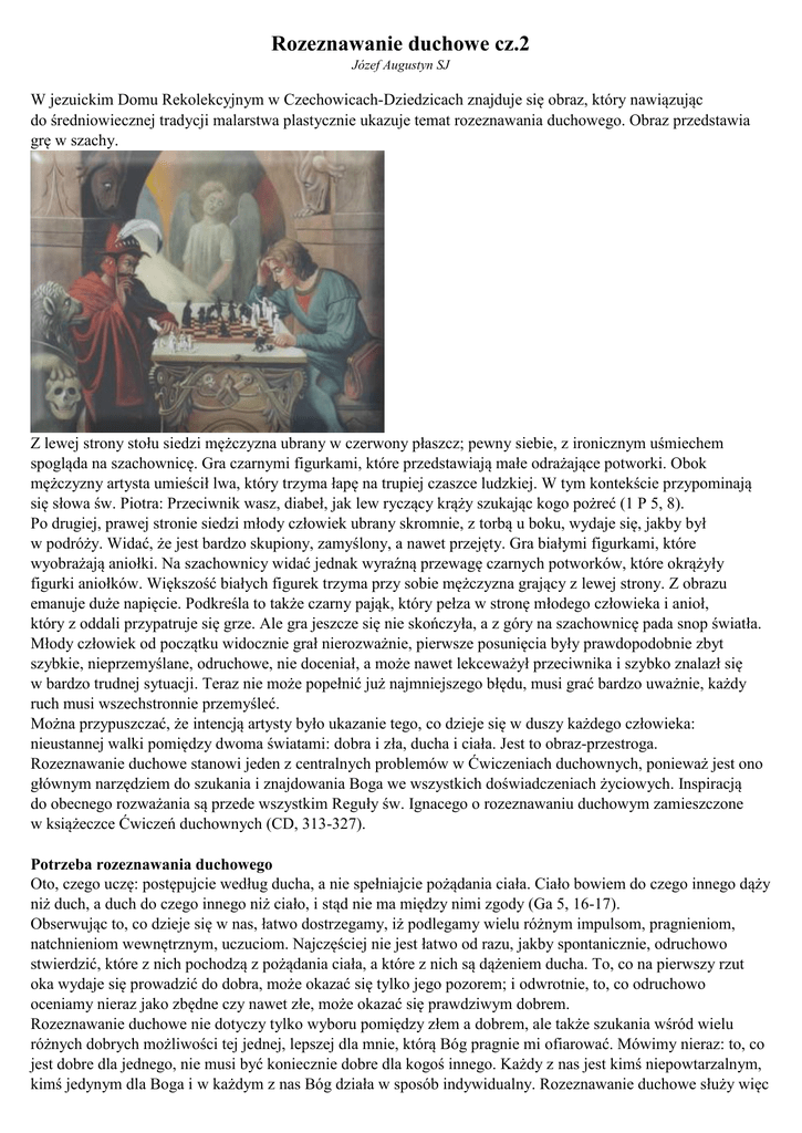 Rozeznawanie duchowe cz.2 Józef Augustyn SJ W jezuickim Domu Rekolekcyjnym w Czechowicach-Dziedzicach znajduje się obraz, który nawiązując do średniowiecznej tradycji malarstwa plastycznie ukazuje temat rozeznawania duchowego. Obraz przedstawia grę w szachy. Z lewej strony stołu siedzi mężczyzna ubrany w czerwony płaszcz; pewny siebie, z ironicznym uśmiechem spogląda na szachownicę. Gra czarnymi figurkami, które przedstawiają małe odrażające potworki. Obok mężczyzny artysta umieścił lwa, który trzyma łapę na trupiej czaszce ludzkiej. W tym kontekście przypominają się słowa św. Piotra: Przeciwnik wasz, diabeł, jak lew ryczący krąży szukając kogo pożreć (1 P 5, 8). Po drugiej, prawej stronie siedzi młody człowiek ubrany skromnie, z torbą u boku, wydaje się, jakby był w podróży. Widać, że jest bardzo skupiony, zamyślony, a nawet przejęty. Gra białymi figurkami, które wyobrażają aniołki. Na szachownicy widać jednak wyraźną przewagę czarnych potworków, które okrążyły figurki aniołków. Większość białych figurek trzyma przy sobie mężczyzna grający z lewej strony. Z obrazu emanuje duże napięcie. Podkreśla to także czarny pająk, który pełza w stronę młodego człowieka i anioł, który z oddali przypatruje się grze. Ale gra jeszcze się nie skończyła, a z góry na szachownicę pada snop światła. Młody człowiek od początku widocznie grał nierozważnie, pierwsze posunięcia były prawdopodobnie zbyt szybkie, nieprzemyślane, odruchowe, nie doceniał, a może nawet lekceważył przeciwnika i szybko znalazł się w bardzo trudnej sytuacji. Teraz nie może popełnić już najmniejszego błędu, musi grać bardzo uważnie, każdy ruch musi wszechstronnie przemyśleć. Można przypuszczać, że intencją artysty było ukazanie tego, co dzieje się w duszy każdego człowieka: nieustannej walki pomiędzy dwoma światami: dobra i zła, ducha i ciała. Jest to obraz-przestroga. Rozeznawanie duchowe stanowi jeden z centralnych problemów w Ćwiczeniach duchownych, ponieważ jest ono głównym narzędziem do szukania i znajdowania Boga we wszystkich doświadczeniach życiowych. Inspiracją do obecnego rozważania są przede wszystkim Reguły św. Ignacego o rozeznawaniu duchowym zamieszczone w książeczce Ćwiczeń duchownych (CD, 313-327). Potrzeba rozeznawania duchowego Oto, czego uczę: postępujcie według ducha, a nie spełniajcie pożądania ciała. Ciało bowiem do czego innego dąży niż duch, a duch do czego innego niż ciało, i stąd nie ma między nimi zgody (Ga 5, 16-17). Obserwując to, co dzieje się w nas, łatwo dostrzegamy, iż podlegamy wielu różnym impulsom, pragnieniom, natchnieniom wewnętrznym, uczuciom. Najczęściej nie jest łatwo od razu, jakby spontanicznie, odruchowo stwierdzić, które z nich pochodzą z pożądania ciała, a które z nich są dążeniem ducha. To, co na pierwszy rzut oka wydaje się prowadzić do dobra, może okazać się tylko jego pozorem; i odwrotnie, to, co odruchowo oceniamy nieraz jako zbędne czy nawet złe, może okazać się prawdziwym dobrem. Rozeznawanie duchowe nie dotyczy tylko wyboru pomiędzy złem a dobrem, ale także szukania wśród wielu różnych dobrych możliwości tej jednej, lepszej dla mnie, którą Bóg pragnie mi ofiarować. Mówimy nieraz: to, co jest dobre dla jednego, nie musi być koniecznie dobre dla kogoś innego. Każdy z nas jest kimś niepowtarzalnym, kimś jedynym dla Boga i w każdym z nas Bóg działa w sposób indywidualny. Rozeznawanie duchowe służy więc nie tylko do poznania i odrzucenia złych poruszeń wewnętrznych, ale także do odkrycia tych dobrych, ofiarowanych tylko mnie; poprzez nie właśnie Bóg we mnie działa. Stąd też zachęta i naleganie Słowa Bożego: Wszystko badajcie, a co szlachetne, zachowujcie. Unikajcie wszystkiego, co ma choćby pozór zła (1 Tes 5, 21). Podobną przestrogę daje nam także św. Jan: Umiłowani, nie dowierzajcie każdemu duchowi, ale badajcie duchy, czy są z Boga, gdyż wielu fałszywych proroków pojawiło się na świecie (1 J 4, 1). Prowadzenie życia duchowego nie polega na spekulowaniu myślowym, ale na podejmowaniu decyzji (N. Kotyła), na nieustannym opowiadaniu się po stronie człowieka duchowego w nas. Człowiek wierzący winien najpierw dostrzec całą gamę różnych poruszeń, skłonności i natchnień, które przepływają przez jego wnętrze najczęściej niezależnie od jego woli – dobre, aby je przyjmować, złe, aby je odrzucać (CD, 313). A oto jak sam św. Ignacy w jednym ze swoich listów uzasadnia potrzebę rozeznawania duchowego: Zdarza się często, że Pan działa na naszą duszę poruszając ją i przynaglając do wykonania takiej czy innej czynności. Przemawia w głębi duszy bez słów, pociągając ją całą do swojej Boskiej miłości w taki sposób, że nie możemy się oprzeć temu Boskiemu działaniu. (…) Ale tu możemy się często mylić, ponieważ po otrzymaniu takiej pociechy lub natchnienia dusza pozostaje w stanie radosnego uniesienia. Nieprzyjaciel zbliża się wówczas pod osłoną radości i jasnych barw, by nam dorzucić coś od siebie do tego, co otrzymaliśmy od Boga, Pana naszego i by wprowadzić do naszej duszy całkowity nieład i zamieszanie. Kiedy indziej znowu stara się pomniejszyć w nas działanie Boga przedstawiając nam różne trudności i niewygody, byleśmy tylko nie wypełnili całkowicie tego, co nam zostało ukazane. W tym wypadku konieczna jest znacznie większa uwaga niż w jakimkolwiek innym. Trudności w rozeznawaniu duchowym Dzisiejszy człowiek z powodu wielości zewnętrznych wrażeń, które docierają do niego poprzez wciągające środki audiowizualne, naraża się na życie poza sobą, poza swoim wnętrzem. Krzykliwa pstra kakofonia audiowizualnych informacji (A. Frossard), która zalewa współczesną cywilizację, zagłusza delikatny i wymagający ciszy – także zewnętrznej – świat doznań duchow