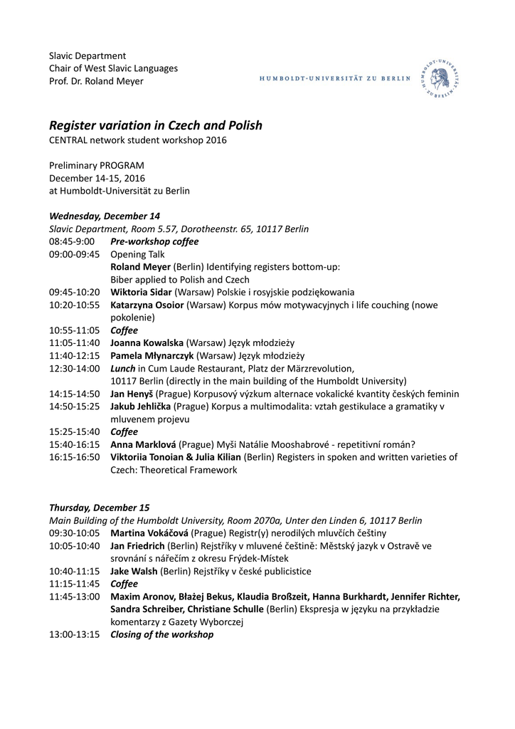 Slavic Department Chair of West Slavic Languages Prof. Dr. Roland Meyer Register variation in Czech and Polish CENTRAL network student workshop 2016 Preliminary PROGRAM December 14-15, 2016 at Humboldt-Universität zu Berlin Wednesday, December 14 Slavic Department, Room 5.57, Dorotheenstr. 65, 10117 Berlin 08:45-9:00 Pre-workshop coffee 09:00-09:45 Opening Talk Roland Meyer (Berlin) Identifying registers bottom-up: Biber applied to Polish and Czech 09:45-10:20 Wiktoria Sidar (Warsaw) Polskie i rosyjskie podziękowania 10:20-10:55 Katarzyna Osoior (Warsaw) Korpus mów motywacyjnych i life couching (nowe pokolenie) 10:55-11:05 Coffee 11:05-11:40 Joanna Kowalska (Warsaw) Język młodzieży 11:40-12:15 Pamela Młynarczyk (Warsaw) Język młodzieży 12:30-14:00 Lunch in Cum Laude Restaurant, Platz der Märzrevolution, 10117 Berlin (directly in the main building of the Humboldt University) 14:15-14:50 Jan Henyš (Prague) Korpusový výzkum alternace vokalické kvantity českých feminin 14:50-15:25 Jakub Jehlička (Prague) Korpus a multimodalita: vztah gestikulace a gramatiky v mluvenem projevu 15:25-15:40 Coffee 15:40-16:15 Anna Marklová (Prague) Myši Natálie Mooshabrové - repetitivní román? 16:15-16:50 Viktoriia Tonoian & Julia Kilian (Berlin) Registers in spoken and written varieties of Czech: Theoretical Framework Thursday, December 15 Main Building of the Humboldt University, Room 2070a, Unter den Linden 6, 10117 Berlin 09:30-10:05 Martina Vokáčová (Prague) Registr(y) nerodilých mluvčích češtiny 10:05-10:40 Jan Friedrich (Berlin) Rejstříky v mluvené češtině: Městský jazyk v Ostravě ve srovnání s nářečím z okresu Frýdek-Místek 10:40-11:15 Jake Walsh (Berlin) Rejstříky v české publicistice 11:15-11:45 Coffee 11:45-13:00 Maxim Aronov, Błażej Bekus, Klaudia Broßzeit, Hanna Burkhardt, Jennifer Richter, Sandra Schreiber, Christiane Schulle (Berlin) Ekspresja w języku na przykładzie komentarzy z Gazety Wyborczej 13:00-13:15 Closing of the workshop