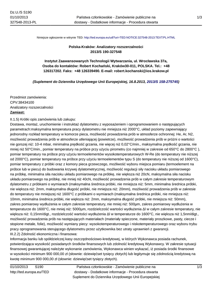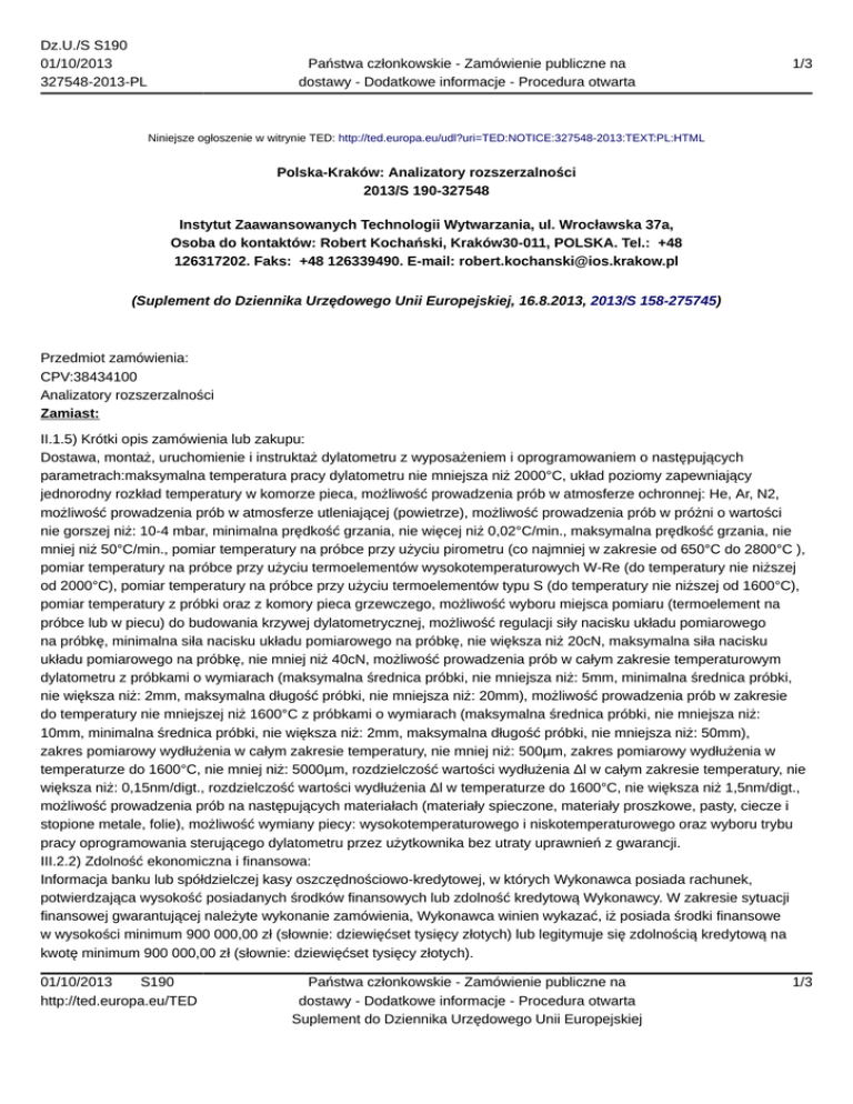 Dz.U./S S190 01/10/2013 327548-2013-PL Państwa członkowskie - Zamówienie publiczne na dostawy - Dodatkowe informacje - Procedura otwarta 1/3 Niniejsze ogłoszenie w witrynie TED: http://ted.europa.eu/udl?uri=TED:NOTICE:327548-2013:TEXT:PL:HTML Polska-Kraków: Analizatory rozszerzalności 2013/S 190-327548 Instytut Zaawansowanych Technologii Wytwarzania, ul. Wrocławska 37a, Osoba do kontaktów: Robert Kochański, Kraków30-011, POLSKA. Tel.: +48 126317202. Faks: +48 126339490. E-mail: [email protected] (Suplement do Dziennika Urzędowego Unii Europejskiej, 16.8.2013, 2013/S 158-275745) Przedmiot zamówienia: CPV:38434100 Analizatory rozszerzalności Zamiast: II.1.5) Krótki opis zamówienia lub zakupu: Dostawa, montaż, uruchomienie i instruktaż dylatometru z wyposażeniem i oprogramowaniem o następujących parametrach:maksymalna temperatura pracy dylatometru nie mniejsza niż 2000°C, układ poziomy zapewniający jednorodny rozkład temperatury w komorze pieca, możliwość prowadzenia prób w atmosferze ochronnej: He, Ar, N2, możliwość prowadzenia prób w atmosferze utleniającej (powietrze), możliwość prowadzenia prób w próżni o wartości nie gorszej niż: 10-4 mbar, minimalna prędkość grzania, nie więcej niż 0,02°C/min., maksymalna prędkość grzania, nie mniej niż 50°C/min., pomiar temperatury na próbce przy użyciu pirometru (co najmniej w zakresie od 650°C do 2800°C ), pomiar temperatury na próbce przy użyciu termoelementów wysokotemperaturowych W-Re (do temperatury nie niższej od 2000°C), pomiar temperatury na próbce przy użyciu termoelementów typu S (do temperatury nie niższej od 1600°C), pomiar temperatury z próbki oraz z komory pieca grzewczego, możliwość wyboru miejsca pomiaru (termoelement na próbce lub w piecu) do budowania krzywej dylatometrycznej, możliwość regulacji siły nacisku układu pomiarowego na próbkę, minimalna siła nacisku układu pomiarowego na próbkę, nie większa niż 20cN, maksymalna siła nacisku układu pomiarowego na próbkę, nie mniej niż 40cN, możliwość prowadzenia prób w całym zakresie temperaturowym dylatometru z próbkami o wymiarach (maksymalna średnica próbki, nie mniejsza niż: 5mm, minimalna średnica próbki, nie większa niż: 2mm, maksymalna długość próbki, nie mniejsza niż: 20mm), możliwość prowadzenia prób w zakresie do temperatury nie mniejszej niż 1600°C z próbkami o wymiarach (maksymalna średnica próbki, nie mniejsza niż: 10mm, minimalna średnica próbki, nie większa niż: 2mm, maksymalna długość próbki, nie mniejsza niż: 50mm), zakres pomiarowy wydłużenia w całym zakresie temperatury, nie mniej niż: 500µm, zakres pomiarowy wydłużenia w temperaturze do 1600°C, nie mniej niż: 5000µm, rozdzielczość wartości wydłużenia Δl w całym zakresie temperatury, nie większa niż: 0,15nm/digt., rozdzielczość wartości wydłużenia Δl w temperaturze do 1600°C, nie większa niż 1,5nm/digt., możliwość prowadzenia prób na następujących materiałach (materiały spieczone, materiały proszkowe, pasty, ciecze i stopione metale, folie), możliwość wymiany piecy: wysokotemperaturowego i niskotemperaturowego oraz wyboru trybu pracy oprogramowania sterującego dylatometru przez użytkownika bez utraty uprawnień z gwarancji. III.2.2) Zdolność ekonomiczna i finansowa: Informacja banku lub spółdzielczej kasy oszczędnościowo-kredytowej, w których Wykonawca posiada rachunek, potwierdzająca wysokość posiadanych środków finansowych lub zdolność kredytową Wykonawcy. W zakresie sytuacji finansowej gwarantującej należyte wykonanie zamówienia, Wykonawca winien wykazać, iż posiada środki finansowe w wysokości minimum 900 000,00 zł (słownie: dziewięćset tysięcy złotych) lub legitymuje się zdolnością kredytową na kwotę minimum 900 000,00 zł (słownie: dziewięćset tysięcy złotych). 01/10/2013 S190 http://ted.europa.eu/TED Państwa członkowskie - Zamówienie publiczne na dostawy - Dodatkowe informacje - Procedura otwarta Suplement do Dziennika Urzędowego Unii Europejskiej 1/3 Dz.U./S S190 01/10/2013 327548-2013-PL Państwa członkowskie - Zamówienie publiczne na dostawy - Dodatkowe informacje - Procedura otwarta 2/3 III.2.3) Kwalifikacje techniczne: W celu potwierdzenia warunku opisanego w pkt. 2 Rozdziału VIII SIWZ, Wykonawca składa wykaz zrealizowanych dostaw głównych zawierający informacje dotyczące odbiorców, przedmiotu i wartości, dat wykonania – według wzoru stanowiącego Załącznik Nr 4 do SIWZ, wraz z dowodami potwierdzającymi ich należyte wykonanie. UWAGA: Zgodnie z przepisem § 1 ust. 2 pkt. 1 i 3 Rozporządzenia Prezesa Rady Ministrów z dnia 19 lutego 2013 roku w sprawie rodzajów dokumentów, jakich może żądać zamawiający od wykonawcy, oraz form, w jakich te dokumenty mogą być składane (Dz.U. z dnia 19 lutego 2013 roku, poz. nr 231), jako dowody potwierdzające należyte wykonanie dostaw, Wykonawca załącza wystawione przez odbiorcę stosowne poświadczenie, a w przypadku niemożliwości uzyskania poświadczenia z przyczyn uzasadnionych o obiektywnym charakterze – składa stosowne oświadczenie lub dokumenty potwierdzające należyte wykonanie dostaw, określone w § 1 ust. 1 pkt 3 rozporządzenia Prezesa Rady Ministrów z dnia 30 grudnia 2009 r. w sprawie rodzajów dokumentów, jakich może żądać zamawiający od wykonawcy, oraz form, w jakich te dokumenty mogą być składane (Dz. U. Nr 226, poz. 1817). W zakresie posiadania wiedzy i doświadczenia niezbędnego do należytego wykonania zamówienia, Wykonawca winien wykazać, iż w okresie ostatnich trzech lat przed upływem terminu składania ofert, a jeżeli okres prowadzenia działalności jest krótszy – w tym okresie, wykonał przynajmniej dwie dostawy główne odpowiadające swoim rodzajem przedmiotowi zamówienia o łącznej wartości nie niższej niż 1 000 000,00 zł brutto (słownie: jeden milion złotych). Zamawiający za jed