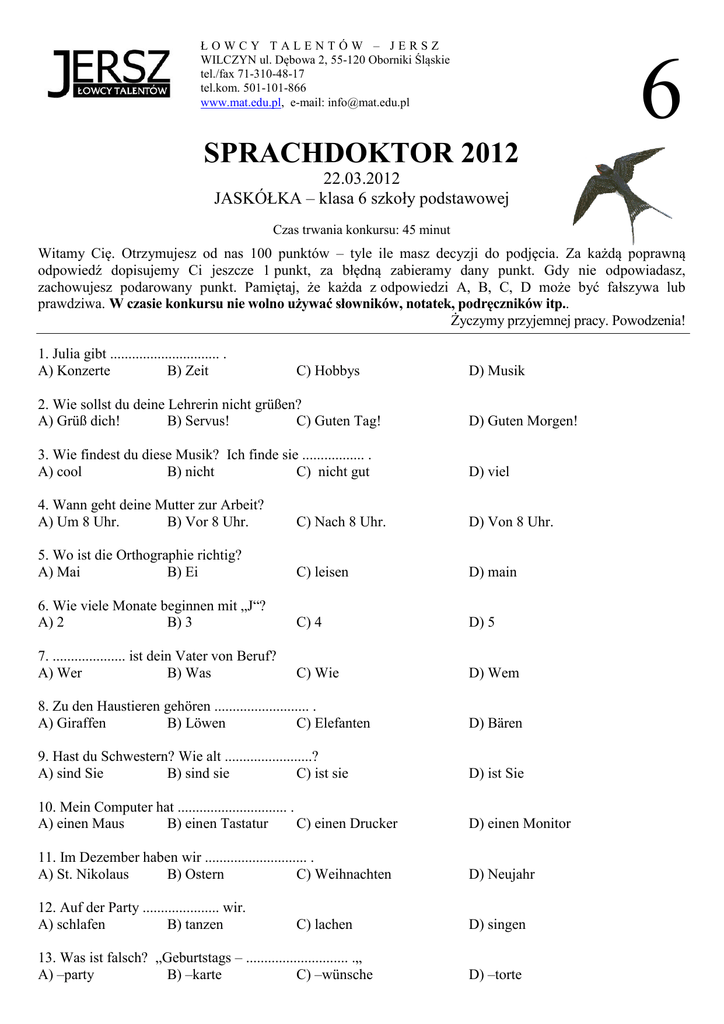 ŁOWCY TALENTÓW – JERSZ WILCZYN ul. Dębowa 2, 55-120 Oborniki Śląskie tel./fax 71-310-48-17 tel.kom. 501-101-866 www.mat.edu.pl, e-mail: [email protected] 6 SPRACHDOKTOR 2012 22.03.2012 JASKÓŁKA – klasa 6 szkoły podstawowej Czas trwania konkursu: 45 minut Witamy Cię. Otrzymujesz od nas 100 punktów – tyle ile masz decyzji do podjęcia. Za każdą poprawną odpowiedź dopisujemy Ci jeszcze 1 punkt, za błędną zabieramy dany punkt. Gdy nie odpowiadasz, zachowujesz podarowany punkt. Pamiętaj, że każda z odpowiedzi A, B, C, D może być fałszywa lub prawdziwa. W czasie konkursu nie wolno używać słowników, notatek, podręczników itp.. Życzymy przyjemnej pracy. Powodzenia! 1. Julia gibt .............................. . A) Konzerte B) Zeit C) Hobbys D) Musik 2. Wie sollst du deine Lehrerin nicht grüßen? A) Grüß dich! B) Servus! C) Guten Tag! D) Guten Morgen! 3. Wie findest du diese Musik? Ich finde sie ................. . A) cool B) nicht C) nicht gut D) viel 4. Wann geht deine Mutter zur Arbeit? A) Um 8 Uhr. B) Vor 8 Uhr. C) Nach 8 Uhr. D) Von 8 Uhr. 5. Wo ist die Orthographie richtig? A) Mai B) Ei C) leisen D) main 6. Wie viele Monate beginnen mit „J“? A) 2 B) 3 C) 4 D) 5 7. .................... ist dein Vater von Beruf? A) Wer B) Was C) Wie D) Wem 8. Zu den Haustieren gehören .......................... . A) Giraffen B) Löwen C) Elefanten D) Bären 9. Hast du Schwestern? Wie alt ........................? A) sind Sie B) sind sie C) ist sie D) ist Sie 10. Mein Computer hat .............................. . A) einen Maus B) einen Tastatur C) einen Drucker D) einen Monitor 11. Im Dezember haben wir ............................ . A) St. Nikolaus B) Ostern C) Weihnachten D) Neujahr 12. Auf der Party ..................... wir. A) schlafen B) tanzen D) singen C) lachen 13. Was ist falsch? „Geburtstags – ............................ .„ A) –party B) –karte C) –wünsche D) –torte 14. Meine Mutti macht ......................... . A) kaufen B) Kuchen C) Einkäufe D) Küchen 15. Der Winter ist ......................... . A) vor dem Sommer B) nach dem Herbst C) vom Sommer D) vor dem Frühling 16. Was ist falsch? A) die Buch D) die Lineal B) der Text C) der Kuli 17. Die Schüler haben Mathe am ............................. . A) Vormittag B) Montag C) Sonntag D) Februar 18. Anke hat eine Freundin. ................. Freundin ist Studentin. A) Ihre B) Deine C) Seine D) Unsere 19. Der Sportler ................... sehr lange im Stadion. A) trainiert B) läuft C) macht D) ist 20. Was passt nicht zusammen? A) fleißig – faul B) fleißig – dick C) klein – groß D) klein – alt 21. Was ist richtig? A) Sprich! C) Schreib! D) Sprecht! B) Lies! 22. Welche Formen sind falsch? A) der Vater, die Väter C) die Tochter, die Töchter B) die Mutter, die Mutter D) der Bruder, die Bruder 23. Habt ihr einen Hund? A) Ja, wir haben eine Katze. C) Ja, wir haben einen Hund. B) Ja, eine Katze. D) Ja, natürlich. 24. Wo steht „sich“ nicht richtig? A) freuen B) interessieren C) lernen D) spielen 25. Wohin möchtest du fahren? A) Ins Gebirge. B) Aufs Land. C) In die Stadt. D) Nach Hause. © Copyright by Łowcy Talentów – JERSZ, Wrocław 2012