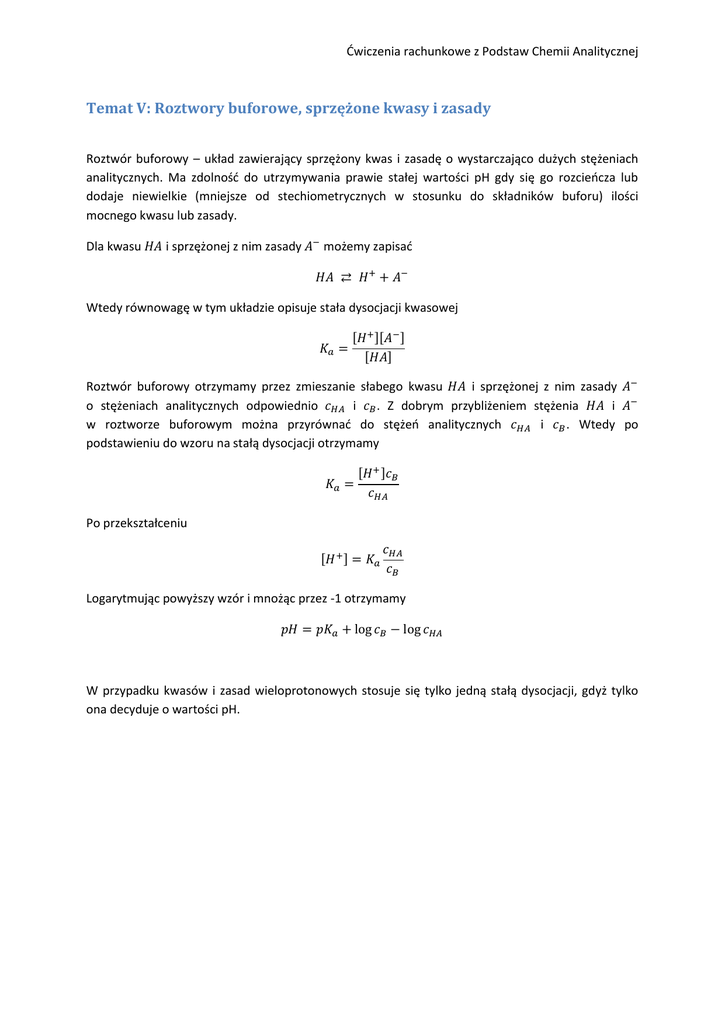 Ćwiczenia rachunkowe z Podstaw Chemii Analitycznej Temat V: Roztwory buforowe, sprzężone kwasy i zasady Roztwór buforowy – układ zawierający sprzężony kwas i zasadę o wystarczająco dużych stężeniach analitycznych. Ma zdolnośd do utrzymywania prawie stałej wartości pH gdy się go rozcieocza lub dodaje niewielkie (mniejsze od stechiometrycznych w stosunku do składników buforu) ilości mocnego kwasu lub zasady. Dla kwasu i sprzężonej z nim zasady możemy zapisad Wtedy równowagę w tym układzie opisuje stała dysocjacji kwasowej [ ][ [ ] ] Roztwór buforowy otrzymamy przez zmieszanie słabego kwasu i sprzężonej z nim zasady o stężeniach analitycznych odpowiednio i . Z dobrym przybliżeniem stężenia i w roztworze buforowym można przyrównad do stężeo analitycznych i . Wtedy po podstawieniu do wzoru na stałą dysocjacji otrzymamy [ ] Po przekształceniu [ ] Logarytmując powyższy wzór i mnożąc przez -1 otrzymamy W przypadku kwasów i zasad wieloprotonowych stosuje się tylko jedną stałą dysocjacji, gdyż tylko ona decyduje o wartości pH.