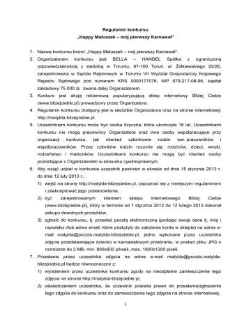 Regulamin konkursu „Happy Maluszek – mój pierwszy Karnawał” 1. Nazwa konkursu brzmi: „Happy Maluszek – mój pierwszy Karnawał”. 2. Organizatorem konkursu jest BELLA – HANDEL Spółka z ograniczoną odpowiedzialnością z siedzibą w Toruniu, 87-100 Toruń, ul. Żółkiewskiego 20/26, zarejestrowana w Sądzie Rejonowym w Toruniu VII Wydział Gospodarczy Krajowego Rejestru Sądowego pod numerem KRS 0000177076, NIP 879-217-08-96, kapitał zakładowy 75 000 zł, zwana dalej Organizatorem. 3. Konkurs jest akcją reklamową popularyzującą sklep internetowy Bliżej Ciebie (www.blizejciebie.pl) prowadzony przez Organizatora. 4. Regulamin konkursu dostępny jest w siedzibie Organizatora oraz na stronie internetowej: http://matylda-blizejciebie.pl. 5. Uczestnikiem konkursu może być osoba fizyczna, która ukończyła 18 lat. Uczestnikami konkursu nie mogą pracownicy Organizatora oraz inne osoby współpracujące przy organizacji konkursu, jak również członkowie rodzin ww. pracowników i współpracowników. Przez członków rodzin rozumie się: rodziców, dzieci, wnuki, rodzeństwo i małżonków. Uczestnikami konkursu nie mogą być również osoby pozostające z Organizatorem w stosunku cywilnoprawnym. 6. Aby wziąć udział w konkursie uczestnik powinien w okresie od dnia 15 stycznia 2013 r. do dnia 12 luty 2013 r.: 1) wejść na stronę http://matylda-blizejciebie.pl, zapoznać się z niniejszym regulaminem i zaakceptować jego postanowienia, 2) być zarejestrowanym klientem sklepu internetowego Bliżej Ciebie (www.blizejciebie.pl), który w terminie od 1 stycznia 2012 do 12 lutego 2013 dokonał zakupu dowolnych produktów, 3) zgłosić do konkursu, tj. przesłać pocztą elektroniczną (podając swoje dane tj. imię i nazwisko i/lub adres email, które posłużyły do założenia konta w sklepie) na adres email [email protected], jedno wykonane przez uczestnika zdjęcie przedstawiające dziecko w karnawałowym przebraniu, w postaci pliku JPG o rozmiarze do 2 MB, min. 800x600 pikseli, max. 1600x1200 pixeli. 7. Przesłanie przez uczestnika zdjęcia na adres e-mail [email protected] będzie równoznaczne z: 1) wyrażeniem przez uczestnika konkursu zgody na nieodpłatne zamieszczenie tego zdjęcia na stronie http://matylda-blizejciebie.pl, 2) oświadczeniem uczestnika, że uczestnik posiada prawo do przesłania/zgłoszenia tego zdjęcia do konkursu oraz do zamieszczenia tego zdjęcia na stronie internetowej, 1 3) oświadczeniem uczestnika, że przesłanie/zgłoszenie tego zdjęcia do udziału w konkursie oraz zamieszczenie tego zdjęcia na stronie internetowej nie narusza jakiegokolwiek prawa lub dobra jakichkolwiek osób, w tym w szczególności praw autorskich lub prawa do ochrony wizerunku. 8. Zabronione jest przesyłanie na adres e-mail [email protected] zdjęć: 1) wcześniej gdziekolwiek opublikowanych, 2) zawierających jakiekolwiek treści ksenofobiczne, rasistowskie, erotyczne, obraźliwe, wulgarne lub sprzeczne z prawem, zasadami współżycia społecznego bądź z dobrymi obyczajami, 3) naruszających jakiekolwiek prawa lub dobra jakichkolwiek osób, w tym w szczególności prawa autorskie lub prawa do ochrony wizerunku. 9. Przesłanie na adres e-mail [email protected] zdjęcia, o którym mowa ust. 8, lub inne naruszenie przez uczestnika postanowień niniejszego regulaminu wyklucza uczestnika z konkursu i uprawnia Organizatora do usunięcia zdjęcia zgłoszonego przez tego uczestnika ze strony http://matylda-blizejciebie.pl. 10. Organizator może usunąć zdjęcia ze strony http://matylda-blizejciebie.pl również w razie uzasadnionych wątpliwości, co do zgodności zgłoszenia tych zdjęć z postanowieniami ust. 8. 11. Zdjęcia przesłane na adres e-mail [email protected], jak również wszelkie inne materiały, treści lub informacje w postaci elektronicznej lub jakiekolwiek innej zgłoszone lub przekazane przez uczestników nie podlegają zwrotowi, także po zakończeniu konkursu. 12. Dodatkowym warunkiem uczestnictwa w konkursie jest wyrażenie przez uczestnika zgody na przetwarzanie jego danych osobowych w rozumieniu ustawy z dnia 29 sierpnia 1997 r. o ochronie danych osobowych (Dz. U. z 2002 r. Nr 101, poz. 926 ze zm.) w celach przeprowadzenia konkursu, w tym wyłonienia zwycięzców, przyznania i rozliczania nagród. Organizator informuje: 1) odbiorcami danych będą pracownicy oraz współpracownicy Organizatora biorący udział w organizacji i prowadzeniu konkursu, 2) uczestnik konkursu ma prawo dostępu do treści swoich danych oraz ich poprawiania, 3) podanie danych osobowych jest dobrowolne. 13. Spośród zdjęć przesłanych na adres e-mail [email protected] powołane przez Organizatora jury wybierze 8 najlepszych zdjęć, w tym zdobywcę pierwszego, drugiego i trzeciego miejsca oraz 5 zdobywców nagród pocieszenia. Dokonując wyboru jury weźmie pod uwagę takie kryteria jak zgodność z wymaganą 2 tematyką (dziecko w karnawałowym przebraniu/stylizacji), estetyka, oryginalność i inne walory wizualne i artystyczne zdjęcia. 14. Uczestnicy, którzy przesłali wybrane przez jury zdjęcia, otrzymają następujące nagrody: 1) I miejsce – karta podarunkowa o wartości 200 zł brutto do realizacji w sklepie internetowym Bliżej Ciebie do wykorzystania w terminie do 1 czerwca 2013, 2) II miejsce – karta podarunkowa o wartości 150 zł brutto do realizacji w sklepie internetowym Bliżej Ciebie do wykorzystania w terminie do 1 czerwca 2013, 3) III miejsce - karta podarunkowa o wartości 100 zł brutto do realizacji w sklepie internetowym Bliżej Ciebie do wykorzystania w terminie do 1 czerwca 2013, 4) 5 nagród pocieszenia – książek Pawła Zawitkowskiego „Mamo Tato co Ty na to 3” oraz krem pielęgnacyjny Bella Baby Happy Natural Care – wartość zestawu 52,70 zł brutto każdy. 15. Wyniki konkursu zostaną opublikowane w terminie do dnia 19 luty 2013 r. na stronie http://matylda-blizejciebie.pl. 16. Nagrody zostaną dostarczone zwycięz