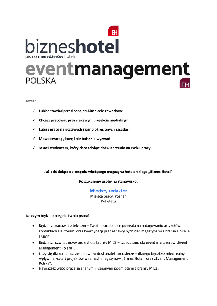 Jeżeli: Lubisz stawiać przed sobą ambitne cele zawodowe Chcesz pracować przy ciekawym projekcie medialnym Lubisz pracę na uczciwych i jasno określonych zasadach Masz otwartą głowę i nie boisz się wyzwań Jesteś studentem, który chce zdobyć doświadczenie na rynku pracy Już dziś dołącz do zespołu wiodącego magazynu hotelarskiego „Biznes Hotel” Poszukujemy osoby na stanowisko: Młodszy redaktor Miejsce pracy: Poznań Pół etatu Na czym będzie polegała Twoja praca? Będziesz pracować z tekstem – Twoja praca będzie polegała na redagowaniu artykułów, kontaktach z autorami oraz koordynacji prac redakcyjnych nad magazynami z branży HoReCa i MICE. Będziesz rozwijać nowy projekt dla branży MICE – czasopismo dla event managerów „Event Management Polska”. Liczy się dla nas praca zespołowa w doskonałej atmosferze – dlatego będziesz mieć realny wpływ na kształt projektów w ramach magazynów „Biznes Hotel” oraz „Event Management Polska”. Nawiążesz współpracę ze znanymi i uznanymi podmiotami z branży MICE. Będziesz dla nas idealnym kandydatem jeśli: potrafisz pracować z tekstem, masz lekkie pióro, dobrze znasz zasady języka polskiego i potrafisz stosować je w praktyce, masz własną inicjatywę, a ambicja każe Ci sięgać po więcej, jesteś pogodną i dobrze zorganizowaną osobą, dla której ważna jest praca zespołowa, zależy Ci na podjęciu długoterminowej współpracy – Twoje zadowolenie z pracy jest dla nas bardzo ważne! Dla nas liczysz się Ty! Oferujemy Ci: umowę o pracę, opartą na atrakcyjnym i przejrzystym systemie wynagradzania (nie praktykujemy tzw. umów śmieciowych), prywatną opiekę medyczną, możliwość wpływania na wiodące projekty w branży MICE. Nie wysyłaj listu motywacyjnego, potrzebujemy tylko Twoje CV wraz ze zgodą na przetwarzanie danych osobowych na potrzeby procesu rekrutacyjnego. Spiesz się – rekrutacja trwa tylko do 23 grudnia! Im szybciej prześlesz swoje CV, tym prędzej będziemy w stanie zaprosić Cię na rozmowę rekrutacyjną – zapraszamy! Swoje zgłoszenie kieruj na adres: [email protected]