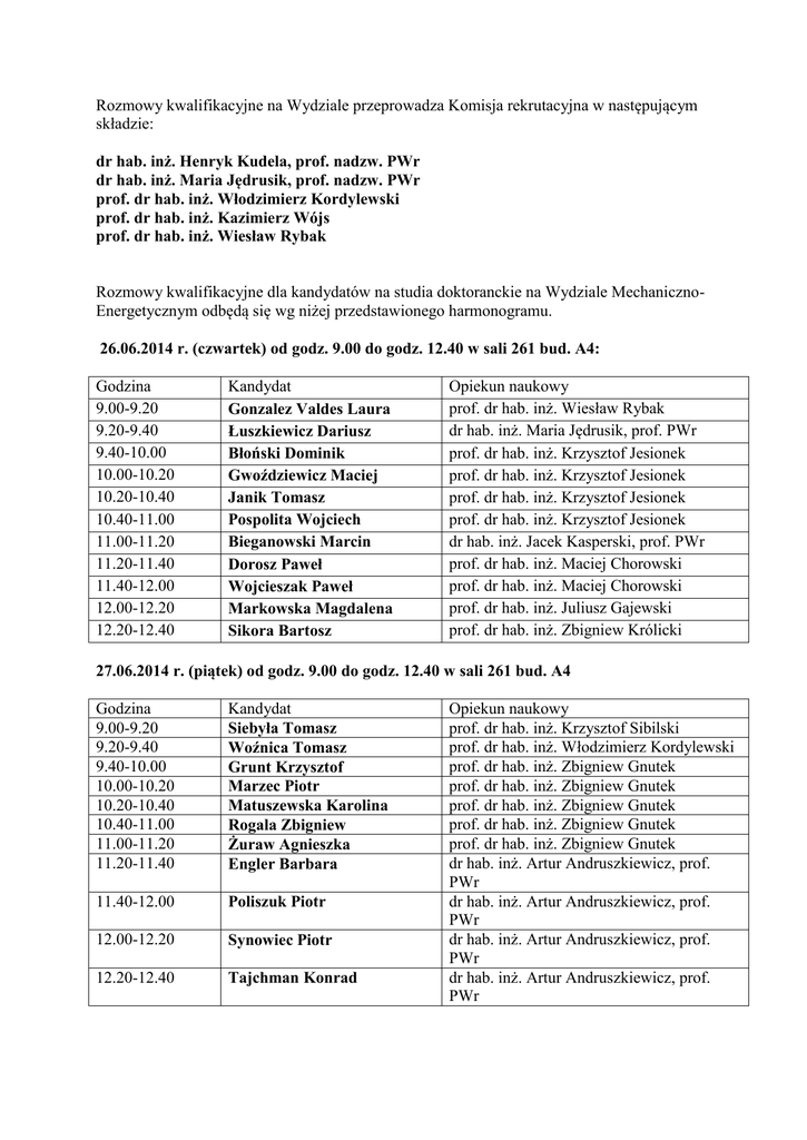 Rozmowy kwalifikacyjne na Wydziale przeprowadza Komisja rekrutacyjna w następującym składzie: dr hab. inż. Henryk Kudela, prof. nadzw. PWr dr hab. inż. Maria Jędrusik, prof. nadzw. PWr prof. dr hab. inż. Włodzimierz Kordylewski prof. dr hab. inż. Kazimierz Wójs prof. dr hab. inż. Wiesław Rybak Rozmowy kwalifikacyjne dla kandydatów na studia doktoranckie na Wydziale MechanicznoEnergetycznym odbędą się wg niżej przedstawionego harmonogramu. 26.06.2014 r. (czwartek) od godz. 9.00 do godz. 12.40 w sali 261 bud. A4: Godzina 9.00-9.20 9.20-9.40 9.40-10.00 10.00-10.20 10.20-10.40 10.40-11.00 11.00-11.20 11.20-11.40 11.40-12.00 12.00-12.20 12.20-12.40 Kandydat Gonzalez Valdes Laura Łuszkiewicz Dariusz Błoński Dominik Gwoździewicz Maciej Janik Tomasz Pospolita Wojciech Bieganowski Marcin Dorosz Paweł Wojcieszak Paweł Markowska Magdalena Sikora Bartosz Opiekun naukowy prof. dr hab. inż. Wiesław Rybak dr hab. inż. Maria Jędrusik, prof. PWr prof. dr hab. inż. Krzysztof Jesionek prof. dr hab. inż. Krzysztof Jesionek prof. dr hab. inż. Krzysztof Jesionek prof. dr hab. inż. Krzysztof Jesionek dr hab. inż. Jacek Kasperski, prof. PWr prof. dr hab. inż. Maciej Chorowski prof. dr hab. inż. Maciej Chorowski prof. dr hab. inż. Juliusz Gajewski prof. dr hab. inż. Zbigniew Królicki 27.06.2014 r. (piątek) od godz. 9.00 do godz. 12.40 w sali 261 bud. A4 Godzina 9.00-9.20 9.20-9.40 9.40-10.00 10.00-10.20 10.20-10.40 10.40-11.00 11.00-11.20 11.20-11.40 Kandydat Siebyła Tomasz Woźnica Tomasz Grunt Krzysztof Marzec Piotr Matuszewska Karolina Rogala Zbigniew Żuraw Agnieszka Engler Barbara 11.40-12.00 Poliszuk Piotr 12.00-12.20 Synowiec Piotr 12.20-12.40 Tajchman Konrad Opiekun naukowy prof. dr hab. inż. Krzysztof Sibilski prof. dr hab. inż. Włodzimierz Kordylewski prof. dr hab. inż. Zbigniew Gnutek prof. dr hab. inż. Zbigniew Gnutek prof. dr hab. inż. Zbigniew Gnutek prof. dr hab. inż. Zbigniew Gnutek prof. dr hab. inż. Zbigniew Gnutek dr hab. inż. Artur Andruszkiewicz, prof. PWr dr hab. inż. Artur Andruszkiewicz, prof. PWr dr hab. inż. Artur Andruszkiewicz, prof. PWr dr hab. inż. Artur Andruszkiewicz, prof. PWr