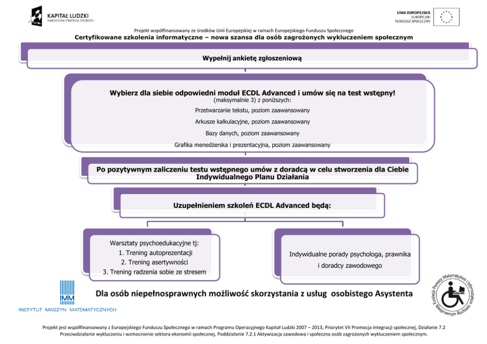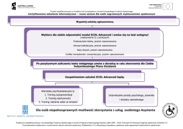 Projekt współfinansowany ze środków Unii Europejskiej w ramach Europejskiego Funduszu Społecznego Certyfikowane szkolenia informatyczne – nowa szansa dla osób zagrożonych wykluczeniem społecznym Wypełnij ankietę zgłoszeniową Wybierz dla siebie odpowiedni moduł ECDL Advanced i umów się na test wstępny! (maksymalnie 3) z poniższych: Przetwarzanie tekstu, poziom zaawansowany Arkusze kalkulacyjne, poziom zaawansowany Bazy danych, poziom zaawansowany Grafika menedżerska i prezentacyjna, poziom zaawansowany Po pozytywnym zaliczeniu testu wstępnego umów z doradcą w celu stworzenia dla Ciebie Indywidualnego Planu Działania Uzupełnieniem szkoleń ECDL Advanced będą: Warsztaty psychoedukacyjne tj: 1. Trening autoprezentacji 2. Trening asertywności 3. Trening radzenia sobie ze stresem Indywidualne porady psychologa, prawnika i doradcy zawodowego Dla osób niepełnosprawnych możliwośd skorzystania z usług osobistego Asystenta Projekt jest współfinansowany z Europejskiego Funduszu Społecznego w ramach Programu Operacyjnego Kapitał Ludzki 2007 – 2013, Priorytet VII Promocja integracji społecznej, Działanie 7.2 Przeciwdziałanie wykluczeniu i wzmocnienie sektora ekonomii społecznej, Poddziałanie 7.2.1 Aktywizacja zawodowa i społeczna osób zagrożonych wykluczeniem społecznym.