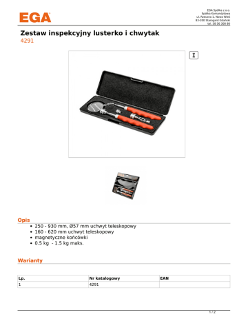 EGA Spółka z o.o. Spółka Komandytowa ul. Rzeczna 1, Nowa Wieś 83-200 Starogard Gdański tel. 58 56 300 80 Zestaw inspekcyjny lusterko i chwytak 4291 Opis 250 - 930 mm, Ø57 mm uchwyt teleskopowy 160 - 620 mm uchwyt teleskopowy magnetyczne końcówki 0.5 kg - 1.5 kg maks. Warianty Lp. Nr katalogowy 1 4291 EAN 1/2 EGA Spółka z o.o. Spółka Komandytowa ul. Rzeczna 1, Nowa Wieś 83-200 Starogard Gdański tel. 58 56 300 80 2/2 Powered by TCPDF (www.tcpdf.org)