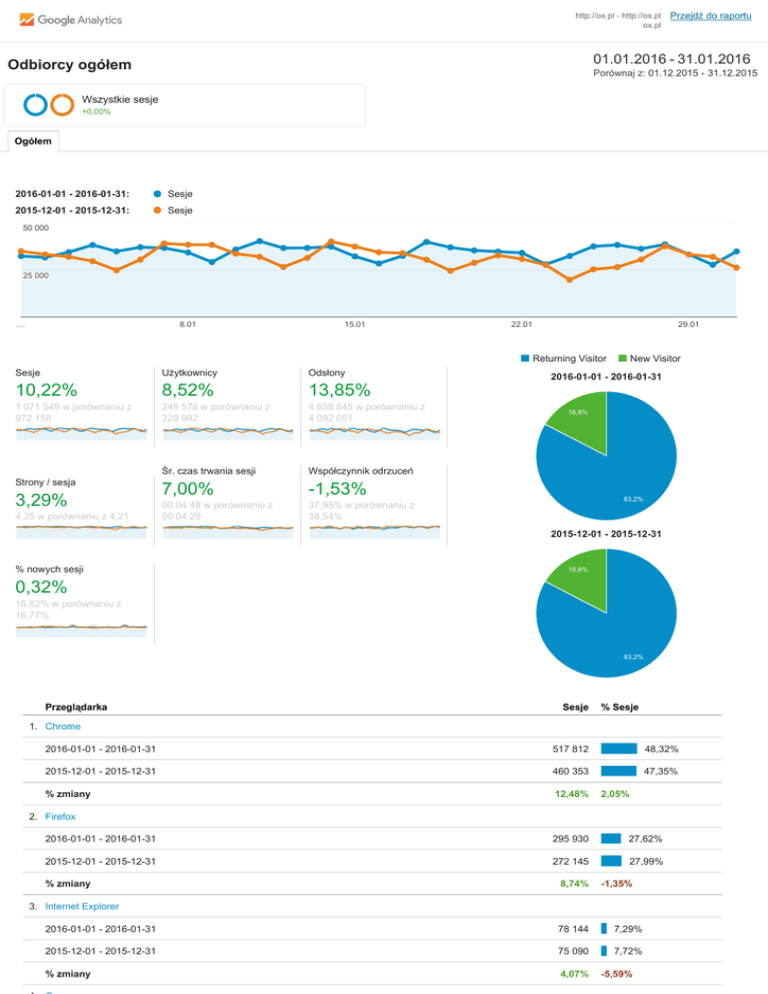 http://ox.pl http://ox.pl ox.pl Przejdź do raportu 01.01.2016 31.01.2016 Odbiorcy ogółem Porównaj z: 01.12.2015 31.12.2015 Wszystkie sesje +0,00% Ogółem 20160101 20160131: Sesje 20151201 20151231: Sesje 50 000 25 000 … 8.01 15.01 22.01 29.01 Returning Visitor Sesje Użytkownicy Odsłony 10,22% 8,52% 13,85% 1 071 549 w porównaniu z 972 158 249 578 w porównaniu z 229 992 4 658 845 w porównaniu z 4 092 051 Śr. czas trwania sesji Współczynnik odrzuceń 7,00% 1,53% 00:04:48 w porównaniu z 00:04:29 37,95% w porównaniu z 38,54% Strony / sesja 3,29% 4,35 w porównaniu z 4,21 New Visitor 20160101 20160131 16,8% 83,2% 20151201 20151231 % nowych sesji 16,8% 0,32% 16,82% w porównaniu z 16,77% 83,2% Przeglądarka Sesje % Sesje 1. Chrome 20160101 20160131 517 812 48,32% 20151201 20151231 460 353 47,35% % zmiany 12,48% 2,05% 2. Firefox 20160101 20160131 295 930 27,62% 20151201 20151231 272 145 27,99% % zmiany 8,74% 1,35% 3. Internet Explorer 20160101 20160131 78 144 7,29% 20151201 20151231 75 090 7,72% % zmiany 4,07% 5,59% 4. Opera 20160101 20160131 64 206 5,99% 20151201 20151231 57 153 5,88% % zmiany 12,34% 1,92% 5. Safari 20160101 20160131 51 455 4,80% 20151201 20151231 46 333 4,77% % zmiany 11,05% 0,75% 6. Android Browser 20160101 20160131 44 702 4,17% 20151201 20151231 44 260 4,55% % zmiany 1,00% 8,37% 7. Edge 20160101 20160131 9 385 0,88% 20151201 20151231 6 959 0,72% % zmiany 34,86% 22,35% 8. Opera Mini 20160101 20160131 4 248 0,40% 20151201 20151231 4 652 0,48% % zmiany 8,68% 17,15% 9. Safari (inapp) 20160101 20160131 2 195 0,20% 20151201 20151231 2 010 0,21% % zmiany 9,20% 0,93% 10. Maxthon 20160101 20160131 1 812 0,17% 20151201 20151231 1 588 0,16% % zmiany 14,11% © 2016 Google 3,52%