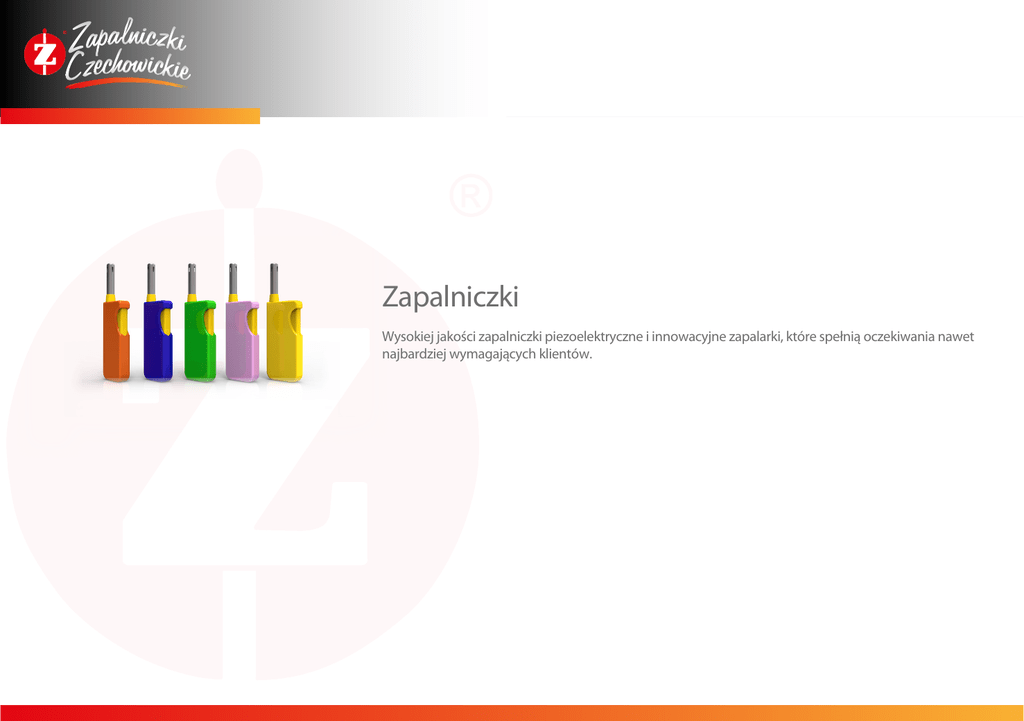 Zapalniczki Wysokiej jakości zapalniczki piezoelektryczne i innowacyjne zapalarki, które spełnią oczekiwania nawet najbardziej wymagających klientów. Zapalniczki ZAPALARKA KRÓTKA 09077 ZAPALARKA KRÓTKA 09077 Zapalarka krótka jest przeznaczona do zastosowań domowych. Wykonana z wysokiej jakości przeźroczystego polimerujest bezpieczna i łatwa w użyciu. Doskonale spisuje się w każdym domu. Dane podstawowe Dane logistyczne Wymiar zapalniczki - Ilość w displayu 20 Wymiar displaya - Ilość w kartonie - Ilość gazu - Ilość na palecie - Zapalniczki ZAPALARKA KRÓTKA 09078 ZAPALARKA KRÓTKA 09078 Zapalarka krótka jest przeznaczona do zastosowań domowych. Wykonana z wysokiej jakości kolorowego polimerujest bezpieczna i łatwa w użyciu. Potrzebna w każdym domu. Dane podstawowe Dane logistyczne Wymiar zapalniczki - Ilość w displayu 20 Wymiar displaya - Ilość w kartonie - Ilość gazu - Ilość na palecie - Zapalniczki ZAPALARKA TELESKOPOWA 09089 ZAPALARKA TELESK. 09089 Zapalarka teleskopowa jest przeznaczona do zastosowań domowych. Wykonana z przeźroczystego polimeru jest bezpieczna, łatwa w użyciu i praktyczna. Innowacyjny, funkcjonalny produkt do domu i nie tylko. Dane podstawowe Dane logistyczne Wymiar zapalniczki - Ilość w displayu 25 Wymiar displaya - Ilość w kartonie - Ilość gazu - Ilość na palecie - Zapalniczki ZAPALNICZKA HU01 ZAPALNICZKA HU01 Zapalniczka piezoelektryczna powstała z myślą o najbardziej wymagających klientach. Wykonana z wysokiej jakości przeźroczystego polimeru jest bezpieczna, wygodna i łatwa w użyciu. Najwyższa jakość i nowoczesny design. Dane podstawowe Dane logistyczne Wymiar zapalniczki - Ilość w displayu 50 Wymiar displaya - Ilość w kartonie - Ilość gazu - Ilość na palecie - Zapalniczki ZAPALNICZKA HU21-HU26 ZAPALNICZKA HU21-HU26 Zapalniczka piezoelektryczna powstała z myślą o najbardziej wymagających klientach. Wykonana z wysokiej jakości kolorowego polimeru jest bezpieczna, wygodna i łatwa w użyciu. Piękne wzornictwo i jakość bez kompromisów. Dane podstawowe Dane logistyczne Wymiar zapalniczki - Ilość w displayu 50 Wymiar displaya - Ilość w kartonie - Ilość gazu - Ilość na palecie -