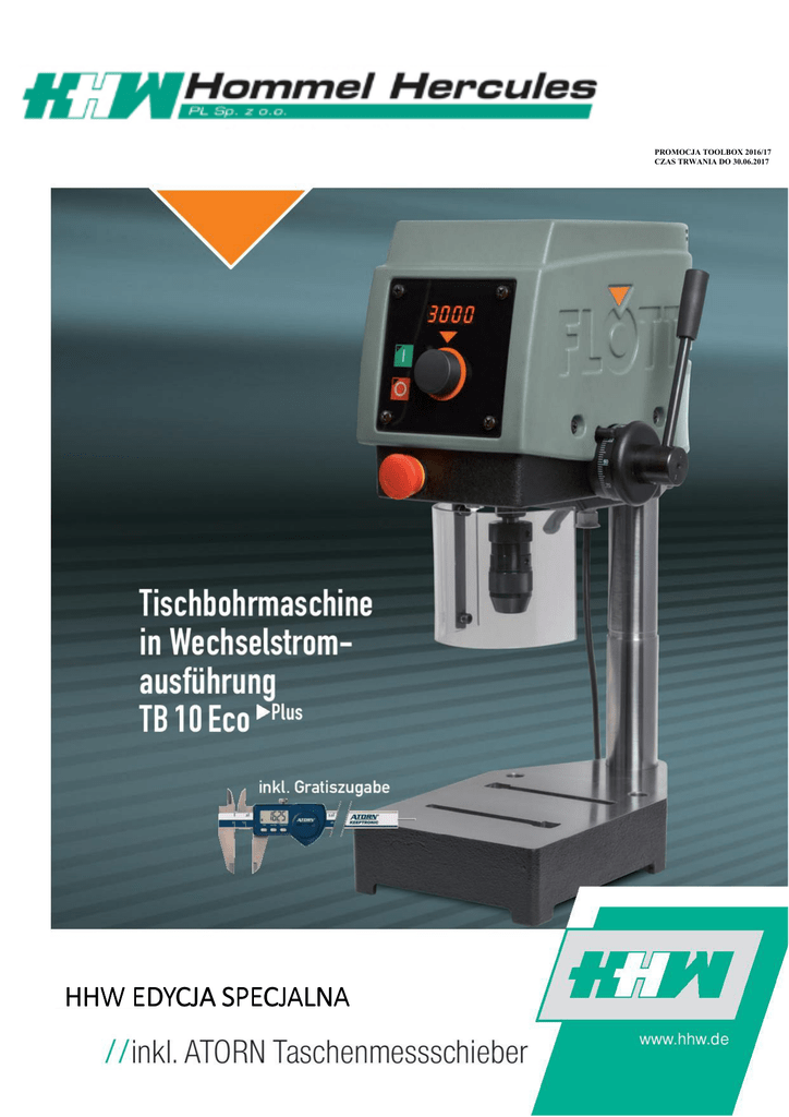 PROMOCJA TOOLBOX 2016/17 CZAS TRWANIA DO 30.06.2017 HHW EDYCJA SPECJALNA Dane Techniczne: Wrzeciono Wskazania liczby obrotów Wskazania głębokości otworu Posów Średnica stali Średnica aluminium B16 cyfrowe skala manualny 12 mm 20 mm Drewno miękkie 40 mm Głębokość wierconego otworu 50 mm Wyładunek 180 mm Średnica kolumny 50 mm Użytkowa powierzchnia robocza ( szer x dł) 300 x 200 mm Waga 30 kg Wymiary maszyny ( szer, gł, wys) 400 x 248x460 mm Regulacja wys. głowicy Wielkość rowków teowych manualna ilość 2, odstęp 100 mm szer.12 mm x 20 mm Wrzeciono/stopka 105-245 mm Prąd zmienny silnika 230 V 0,45 kW Bezstopniowa regulacja obrotu wrzeciona 250-3000 1/min Ogranicznik głębokości wiercenia szybki, nastawny pierścień zderzakowy