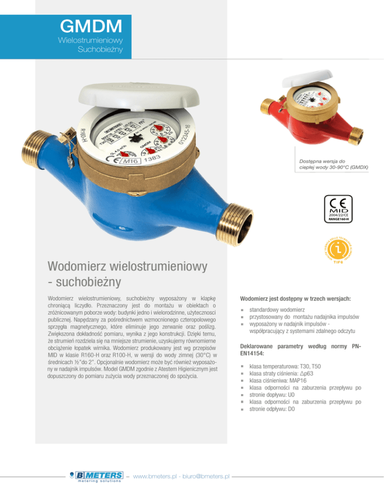 GMDM Wielostrumieniowy Suchobieżny Dostępna wersja do ciepłej wody 30-90°C (GMDX) MID 2004/22/CE RANGE160-H Wodomierz wielostrumieniowy - suchobieżny Wodomierz wielostrumieniowy, suchobieżny wyposażony w klapkę chroniącą liczydło. Przeznaczony jest do montażu w obiektach o zróżnicowanym poborze wody: budynki jedno i wielorodzinne, użytecznosci publicznej. Napędzany za pośrednictwem wzmocnionego czteropolowego sprzęgła magnetycznego, które eliminuje jego zerwanie oraz poślizg. Zwiększona dokładność pomiaru, wynika z jego konstrukcji. Dzięki temu, że strumień rozdziela się na mniejsze strumienie, uzyskujemy równomierne obciążenie łopatek wirnika. Wodomierz produkowany jest wg przepisów MID w klasie R160-H oraz R100-H, w wersji do wody zimnej (30°C) w średnicach ½’’do 2’’. Opcjonalnie wodomierz może być również wyposażony w nadajnik impulsów. Model GMDM zgodnie z Atestem Higienicznym jest dopuszczony do pomiaru zużycia wody przeznaczonej do spożycia. metering solutions www.bmeters.pl - [email protected] Wodomierz jest dostępny w trzech wersjach: standardowy wodomierz przystosowany do montażu nadajnika impulsów wyposażony w nadajnik impulsów współpracujący z systemami zdalnego odczytu Deklarowane parametry według normy PNEN14154: klasa temperaturowa: T30, T50 klasa straty ciśnienia: Δp63 klasa ciśnieniwa: MAP16 klasa odporności na zaburzenia przepływu po stronie dopływu: U0 klasa odporności na zaburzenia przepływu po stronie odpływu: D0 Suchobieżny, wielostrumieniowy MID R160-H lub R100-H, Zimna woda 30°C Charakterystyka techniczna Średnica mm in DN m³/h 3,125 Q4 Q3 Pośredni strumień objętości R160-H Pośredni strumień objętości R100-H Q2 40 50 (3/4”) (1") (1 1/4") (1 1/2") (2") 5 7,875 12,5 20 31,25 Zawias Pokrywka Hinge Lid Brass sealing ring Ruchoma uszczelka m³/h 2,5 4 6,3 10 16 25 Holding ring l/h 25 40 63 100 160 250 O.R. Gasket 25 39,38 62,5 100 156,25 l/h 15,63 Q1 Q2 Minimalny strumień objętości R100-H 32 Glass Uszczelka Oring Minimalny strumień objętości R160-H 25 Sliding gasket Ciągły strumień objętości (1/2") 20 Lead Przeciążeniowy strumień objętości 15 Q1 l/h 40 63 100 160 256 400 l/h 25 40 63 100 160 250 l/h Czułość Totalising mechanism Uszczelka Oring O.R. Gasket Mechanism case Wirnik Vane wheel Pivot Rozdzielnik strumieni Uszczelka Oring Vane wheel case 6 6 10 10 20 O.R. Gasket Adjusting bolt 20 Filtr Strainer Uszczelka - Gasket l Minimalny odczyt Adjusting screw 0,05 Filtr Brass body Strainer Maksymalny odczyt m³ Maksymalne ciśnienie pracy bar 99.999 999.999 16 metr bar Pozycje montażowe Wymiary i waga 1 9 0,9 8 0,8 7 0,7 6 0,6 5 0,5 4 0,4 3 0,3 2 0,2 1 0,1 Ø15 Ø20 Ø25 Ø40 Ø32 Ø50 00 0 Średnica mm in 15 (1/2") 20 (3/4") 25 (1") 32 (1"1/4) 40 (1"1/2) 50 (2") L mm 145-165-190 190 260 260 300 300 I mm 225-245-270 290 360 380 440 460 H mm 109 111 117 117 153 172 B mm 100 100 104 104 126 160 D (Gwint) mm 3/4" 1" 1"1/4 1"1/2 2" 2"1/2 kg 1,35 1,45 2,04 2,11 4,58 7,25 Waga 10 Gwint - EN ISO 228-1:2000 DN50 dostępny w wersji kołnierzowej zgodnie z ISO 7005-2 / EN 1092-2 PN16 3 5 7 10 15 12 3 30 25 B D H L I Możliwość wyposażenia wodomierza w nadajnik impulsu www.bmeters.pl - [email protected] 20 metering solutions