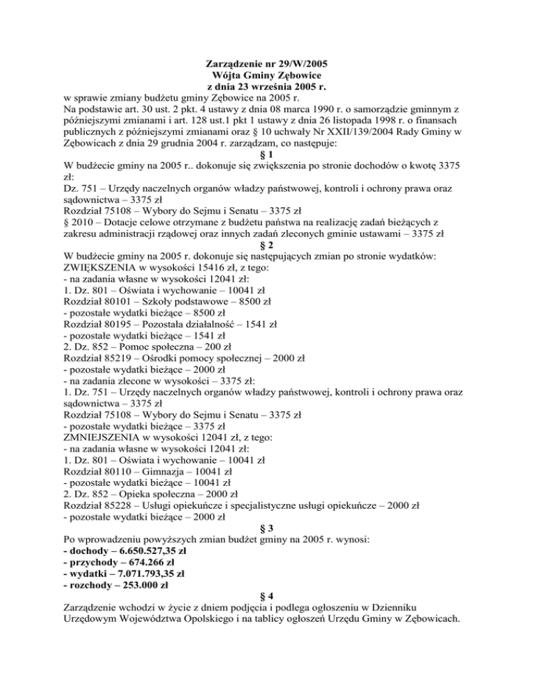 Zarządzenie nr 29/W/2005 Wójta Gminy Zębowice z dnia 23 września 2005 r. w sprawie zmiany budżetu gminy Zębowice na 2005 r. Na podstawie art. 30 ust. 2 pkt. 4 ustawy z dnia 08 marca 1990 r. o samorządzie gminnym z późniejszymi zmianami i art. 128 ust.1 pkt 1 ustawy z dnia 26 listopada 1998 r. o finansach publicznych z późniejszymi zmianami oraz § 10 uchwały Nr XXII/139/2004 Rady Gminy w Zębowicach z dnia 29 grudnia 2004 r. zarządzam, co następuje: §1 W budżecie gminy na 2005 r.. dokonuje się zwiększenia po stronie dochodów o kwotę 3375 zł: Dz. 751 – Urzędy naczelnych organów władzy państwowej, kontroli i ochrony prawa oraz sądownictwa – 3375 zł Rozdział 75108 – Wybory do Sejmu i Senatu – 3375 zł § 2010 – Dotacje celowe otrzymane z budżetu państwa na realizację zadań bieżących z zakresu administracji rządowej oraz innych zadań zleconych gminie ustawami – 3375 zł §2 W budżecie gminy na 2005 r. dokonuje się następujących zmian po stronie wydatków: ZWIĘKSZENIA w wysokości 15416 zł, z tego: - na zadania własne w wysokości 12041 zł: 1. Dz. 801 – Oświata i wychowanie – 10041 zł Rozdział 80101 – Szkoły podstawowe – 8500 zł - pozostałe wydatki bieżące – 8500 zł Rozdział 80195 – Pozostała działalność – 1541 zł - pozostałe wydatki bieżące – 1541 zł 2. Dz. 852 – Pomoc społeczna – 200 zł Rozdział 85219 – Ośrodki pomocy społecznej – 2000 zł - pozostałe wydatki bieżące – 2000 zł - na zadania zlecone w wysokości – 3375 zł: 1. Dz. 751 – Urzędy naczelnych organów władzy państwowej, kontroli i ochrony prawa oraz sądownictwa – 3375 zł Rozdział 75108 – Wybory do Sejmu i Senatu – 3375 zł - pozostałe wydatki bieżące – 3375 zł ZMNIEJSZENIA w wysokości 12041 zł, z tego: - na zadania własne w wysokości 12041 zł: 1. Dz. 801 – Oświata i wychowanie – 10041 zł Rozdział 80110 – Gimnazja – 10041 zł - pozostałe wydatki bieżące – 10041 zł 2. Dz. 852 – Opieka społeczna – 2000 zł Rozdział 85228 – Usługi opiekuńcze i specjalistyczne usługi opiekuńcze – 2000 zł - pozostałe wydatki bieżące – 2000 zł §3 Po wprowadzeniu powyższych zmian budżet gminy na 2005 r. wynosi: - dochody – 6.650.527,35 zł - przychody – 674.266 zł - wydatki – 7.071.793,35 zł - rozchody – 253.000 zł §4 Zarządzenie wchodzi w życie z dniem podjęcia i podlega ogłoszeniu w Dzienniku Urzędowym Województwa Opolskiego i na tablicy ogłoszeń Urzędu Gminy w Zębowicach.
