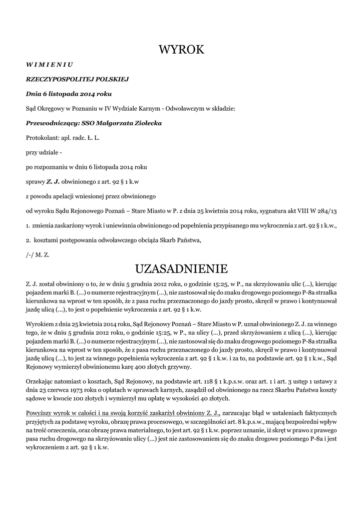 WYROK WIMIENIU RZECZYPOSPOLITEJ POLSKIEJ Dnia 6 listopada 2014 roku Sąd Okręgowy w Poznaniu w IV Wydziale Karnym - Odwoławczym w składzie: Przewodniczący: SSO Małgorzata Ziołecka Protokolant: apl. radc. Ł. L. przy udziale po rozpoznaniu w dniu 6 listopada 2014 roku sprawy Z. J. obwinionego z art. 92 § 1 k.w z powodu apelacji wniesionej przez obwinionego od wyroku Sądu Rejonowego Poznań – Stare Miasto w P. z dnia 25 kwietnia 2014 roku, sygnatura akt VIII W 284/13 1. zmienia zaskarżony wyrok i uniewinnia obwinionego od popełnienia przypisanego mu wykroczenia z art. 92 § 1 k.w., 2. kosztami postępowania odwoławczego obciąża Skarb Państwa, /-/ M. Z. UZASADNIENIE Z. J. został obwiniony o to, że w dniu 5 grudnia 2012 roku, o godzinie 15:25, w P., na skrzyżowaniu ulic (...), kierując pojazdem marki B. (...) o numerze rejestracyjnym (...), nie zastosował się do znaku drogowego poziomego P-8a strzałka kierunkowa na wprost w ten sposób, że z pasa ruchu przeznaczonego do jazdy prosto, skręcił w prawo i kontynuował jazdę ulicą (...), to jest o popełnienie wykroczenia z art. 92 § 1 k.w. Wyrokiem z dnia 25 kwietnia 2014 roku, Sąd Rejonowy Poznań – Stare Miasto w P. uznał obwinionego Z. J. za winnego tego, że w dniu 5 grudnia 2012 roku, o godzinie 15:25, w P., na ulicy (...), przed skrzyżowaniem z ulicą (...), kierując pojazdem marki B. (...) o numerze rejestracyjnym (...), nie zastosował się do znaku drogowego poziomego P-8a strzałka kierunkowa na wprost w ten sposób, że z pasa ruchu przeznaczonego do jazdy prosto, skręcił w prawo i kontynuował jazdę ulicą (...), to jest za winnego popełnienia wykroczenia z art. 92 § 1 k.w. i za to, na podstawie art. 92 § 1 k.w., Sąd Rejonowy wymierzył obwinionemu karę 400 złotych grzywny. Orzekając natomiast o kosztach, Sąd Rejonowy, na podstawie art. 118 § 1 k.p.s.w. oraz art. 1 i art. 3 ustęp 1 ustawy z dnia 23 czerwca 1973 roku o opłatach w sprawach karnych, zasądził od obwinionego na rzecz Skarbu Państwa koszty sądowe w kwocie 100 złotych i wymierzył mu opłatę w wysokości 40 złotych. Powyższy wyrok w całości i na swoją korzyść zaskarżył obwiniony Z. J., zarzucając błąd w ustaleniach faktycznych przyjętych za podstawę wyroku, obrazę prawa procesowego, w szczególności art. 8 k.p.s.w., mającą bezpośredni wpływ na treść orzeczenia, oraz obrazę prawa materialnego, to jest art. 92 § 1 k.w. poprzez uznanie, iż skręt w prawo z prawego pasa ruchu drogowego na skrzyżowaniu ulicy (...) jest nie zastosowaniem się do znaku drogowe poziomego P-8a i jest wykroczeniem z art. 92 § 1 k.w. Wskazując na powyższe skarżący wniósł o uniewinnienie go od zarzutu popełnienia wykroczenia art. 92 § 1 k.w. w całości. Sąd Okręgowy zważył, co następuje: Apelacja obwinionego i jej wniosek końcowy o uniewinnienie Z. J. w pełni zasługiwał na uwzględnienie. Na wstępie niniejszych rozważań koniecznym jest wskazanie, że treść przepisu art. 92 § 1 k.w. jest jednoznaczna. Przepis ten penalizuje niezastosowanie się, między innymi, do znaku drogowego. Zachowanie sprawcy polega zatem na braku podporządkowania się dyrektywie płynącej ze znaku lub sygnału drogowego (por. R. A. Stefański: Wykroczenia drogowe. Komentarz. Kraków 2005, s. 389). Jest niewątpliwe, że każdy znak zawiera konkretną informację dla uczestnika ruchu drogowego niezależnie od tego, czy umownie zostanie zaliczony do kategorii znaków ostrzegawczych, zakazu lub nakazu. Część tych znaków, obok informacji, wyraża również nakaz lub zakaz określonego zachowania się skierowany do konkretnego uczestnika ruchu drogowego. W przedmiotowej sprawie Z. J. został obwiniony o popełnienie opisanego wyżej wykroczenia z art. 92 § 1 k.w., przy czym czyn jego miał polegać na tym, że obwiniony, będąc na skrzyżowaniu, nie zastosował się do znaku poziomowego P-8a w ten sposób, że będąc już na tym skrzyżowaniu z pasa ruchu przeznaczonego do jazdy na wprost skręcił w prawo i kontynuował jazdę w nowo obranym kierunku. Jednak Sąd Rejonowy, uznając Z. J. za winnego popełnienia zarzucanego mu wykroczenia z art. 92 § 1 k.w., dokonał modyfikacji opisu zachowania obwinionego. Po przeprowadzeniu postępowania dowodowego Sąd I instancji doszedł bowiem do wniosku, że obwiniony przed skrzyżowaniem (ulicy (...) z ulicą (...) w P.) skręcił w prawo i kontynuował jazdę ulica (...). Tak ustalony przez Sąd Rejonowy stan faktyczny sprawy, mający zresztą swe odzwierciedlenie w opisie czynu, przypisanego obwinionemu ostatecznie w punkcie 1 części rozstrzygającej wyroku, wyklucza możliwość uznania, że takim zachowaniem Z. J. wyczerpał znamiona wykroczenia o którym mowa w art. 92 § 1 k.w. Przede wszystkim zauważyć należy, iż w myśl regulacji zawartych w ustawie z dnia 20 czerwca 1997 roku Prawo o ruchu drogowym, skręt w prawo jest zmianą kierunku jazdy. Wynika to z art. 22 ustęp 3 wyżej powołanej ustawy. Skręt w prawo jest zatem manewrem polegającym na kontynuowaniu jazdy w innym, niż dotychczasowym kierunku, niewynikającym jedynie z przebiegu drogi, a zależnym od woli kierującego pojazdem. Jeżeli zatem tak, to wykonany przez obwinionego przed skrzyżowaniem manewr nie mógł zostać uznany przez Sąd I instancji mianem skrętu w prawo, a jedynie za zmianę przez obwinionego pasa ruchu. Ten ostatni manewr polega bowiem na zmianie położenia pojazdu w stosunku do krawędzi lub osi jezdni przy utrzymaniu ruchu na tej samej jezdni. Jest to zmiana podłużnego pasa jezdni wystarczającego do ruchu jednego rzędu pojazdów wielośladowych, najczęściej wykonywanym przed wlotem na skrzyżowanie (tak Ryszard A. S., Prawo o ruchu drogowym. Komentarz). Skoro zatem, a co wynika z poczynionych przez Sąd Rejonowy ustaleń faktycznych, Z. J. przed „wlotem” na skrzyżowanie, „skręcił w prawo”, to dokonał on jedynie zmiany pasa ruchu - ze środkowego na prawy. Prze
