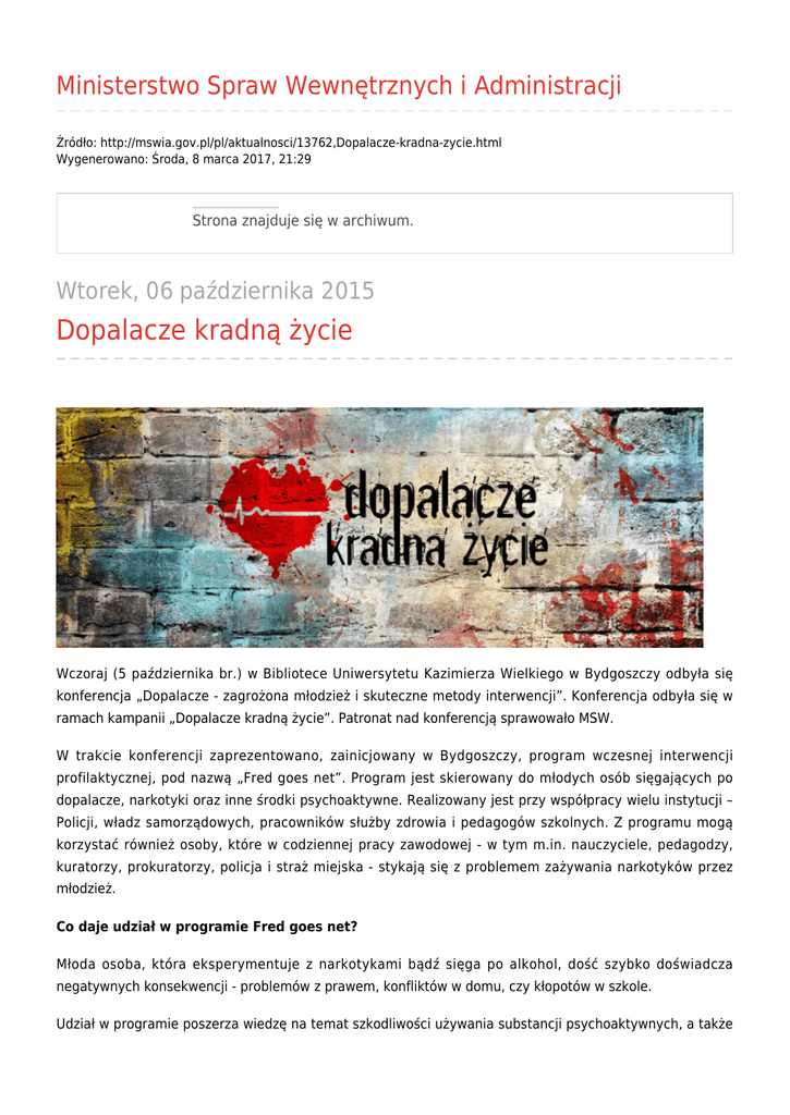 Ministerstwo Spraw Wewnętrznych i Administracji Źródło: http://mswia.gov.pl/pl/aktualnosci/13762,Dopalacze-kradna-zycie.html Wygenerowano: Środa, 8 marca 2017, 21:29 Strona znajduje się w archiwum. Wtorek, 06 października 2015 Dopalacze kradną życie Wczoraj (5 października br.) w Bibliotece Uniwersytetu Kazimierza Wielkiego w Bydgoszczy odbyła się konferencja „Dopalacze - zagrożona młodzież i skuteczne metody interwencji”. Konferencja odbyła się w ramach kampanii „Dopalacze kradną życie”. Patronat nad konferencją sprawowało MSW. W trakcie konferencji zaprezentowano, zainicjowany w Bydgoszczy, program wczesnej interwencji profilaktycznej, pod nazwą „Fred goes net”. Program jest skierowany do młodych osób sięgających po dopalacze, narkotyki oraz inne środki psychoaktywne. Realizowany jest przy współpracy wielu instytucji – Policji, władz samorządowych, pracowników służby zdrowia i pedagogów szkolnych. Z programu mogą korzystać również osoby, które w codziennej pracy zawodowej - w tym m.in. nauczyciele, pedagodzy, kuratorzy, prokuratorzy, policja i straż miejska - stykają się z problemem zażywania narkotyków przez młodzież. Co daje udział w programie Fred goes net? Młoda osoba, która eksperymentuje z narkotykami bądź sięga po alkohol, dość szybko doświadcza negatywnych konsekwencji - problemów z prawem, konfliktów w domu, czy kłopotów w szkole. Udział w programie poszerza wiedzę na temat szkodliwości używania substancji psychoaktywnych, a także pozwala krytycznie spojrzeć na problem uzależnień. W trakcie konferencji MSW przyznało wyróżnienia policjantom Wydziałów Prewencji z Bydgoszczy, Gdańska, Nakła i Opola, którzy są szczególnie zaangażowani w realizację programu „Fred goes net”. Kampania „Dopalacze kradną życie” Kampania „Dopalacze kradną życie” to nazwa akcji profilaktycznej MSW, zainaugurowana 29 lipca w MSW, kiedy to został podpisany pakt przeciwko dopalaczom. Do akcji dołączyło wiele osób m.in. przedstawiciele mediów, środowiska naukowe, sportowcy - oraz instytucji i organizacji pozarządowych. Akcję promuje spot „Taki z Ciebie mocarz”, a jej ambasadorami są Marcin Gortat i Jurek Owsiak. - Kampania „Dopalacze kradną życie” jest rozpoznawalna wśród Polaków. Aż 39% respondentów biorących udział w badaniu „Opinie na temat profilaktyki i przeciwdziałania zażywaniu dopalaczy” przeprowadzonego na zlecenie MSW zadeklarowało znajomość akcji – podkreślają przedstawiciele MSW. Dodajmy, że głównym źródłem wiedzy o kampanii dla większości była telewizja. Natomiast osoby do 34. roku życia o kampanii dowiadywały się najczęściej z internetu. - Według zdecydowanej większości Polaków za edukację młodzieży w zakresie zagrożeń związanych z dopalaczami, w pierwszej kolejności odpowiadają rodzice, a następnie szkoła – wynika także z badania przeprowadzonego przez Ipsos. W konferencji „Dopalacze - zagrożona młodzież i skuteczne metody interwencji” wzięli udział przedstawiciele MSW. Honorowy patronat nad konferencją objęła minister Teresa Piotrowska. Wszystkie informacje dotyczące kampanii skierowanych na walkę z dopalaczami i narkotykami można znaleźć na stronie internetowej www.dopalaczekradnazycie.pl