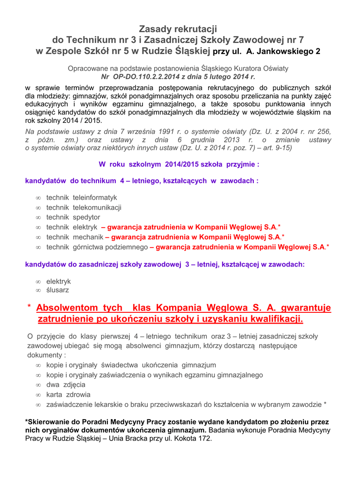 Zasady rekrutacji do Technikum nr 3 i Zasadniczej Szkoły Zawodowej nr 7 w Zespole Szkół nr 5 w Rudzie Śląskiej przy ul. A. Jankowskiego 2 Opracowane na podstawie postanowienia Śląskiego Kuratora Oświaty Nr OP-DO.110.2.2.2014 z dnia 5 lutego 2014 r. w sprawie terminów przeprowadzania postępowania rekrutacyjnego do publicznych szkół dla młodzieży: gimnazjów, szkół ponadgimnazjalnych oraz sposobu przeliczania na punkty zajęć edukacyjnych i wyników egzaminu gimnazjalnego, a także sposobu punktowania innych osiągnięć kandydatów do szkół ponadgimnazjalnych dla młodzieży w województwie śląskim na rok szkolny 2014 / 2015. Na podstawie ustawy z dnia 7 września 1991 r. o systemie oświaty (Dz. U. z 2004 r. nr 256, z późn. zm.) oraz ustawy z dnia 6 grudnia 2013 r. o zmianie ustawy o systemie oświaty oraz niektórych innych ustaw (Dz. U. z 2014 r. poz. 7) – art. 9-15) W roku szkolnym 2014/2015 szkoła przyjmie : kandydatów do technikum 4 – letniego, kształcących w zawodach : • • • • • • technik technik technik technik technik technik teleinformatyk telekomunikacji spedytor elektryk – gwarancja zatrudnienia w Kompanii Węglowej S.A.* mechanik – gwarancja zatrudnienia w Kompanii Węglowej S.A.* górnictwa podziemnego – gwarancja zatrudnienia w Kompanii Węglowej S.A.* kandydatów do zasadniczej szkoły zawodowej 3 – letniej, kształcącej w zawodach: • • elektryk ślusarz * Absolwentom tych klas Kompania Węglowa S. A. gwarantuje zatrudnienie po ukończeniu szkoły i uzyskaniu kwalifikacji. O przyjęcie do klasy pierwszej 4 – letniego technikum oraz 3 – letniej zasadniczej szkoły zawodowej ubiegać się mogą absolwenci gimnazjum, którzy dostarczą następujące dokumenty : • kopie i oryginały świadectwa ukończenia gimnazjum • kopie i oryginały zaświadczenia o wynikach egzaminu gimnazjalnego • dwa zdjęcia • karta zdrowia • zaświadczenie lekarskie o braku przeciwwskazań do kształcenia w wybranym zawodzie * *Skierowanie do Poradni Medycyny Pracy zostanie wydane kandydatom po złożeniu przez nich oryginałów dokumentów ukończenia gimnazjum. Badania wykonuje Poradnia Medycyny Pracy w Rudzie Śląskiej – Unia Bracka przy ul. Kokota 172. Zasady rekrutacji do technikum i zasadniczej szkoły zawodowej 1. Przy rekrutacji bierze się pod uwagę: • oceny uzyskane w gimnazjum z języka polskiego i trzech innych przedmiotów ustalonych dla poszczególnych oddziałów; Zasady przeliczania ocen na punkty • celujący 19 punktów bardzo dobry 16 punktów dobry 13 punktów dostateczny 9 punktów dopuszczający 0 punktów Szczególne osiągnięcia ucznia: Osiągnięcia Punktacja maksymalna Świadectwo ukończenia gimnazjum z wyróżnieniem 5 punktów Udział w finale wojewódzkim konkursów przedmiotowych organizowanych przez Kuratorów Oświaty -za jeden tytuł -10 punktów, -za dwa i więcej tytułów - dodatkowo 2 punkty 12 punktów Osiągnięcia sportowe, artystyczne (indywidualne lub zespołowe) lub konkursy inne, co najmniej na szczeblu powiatowym. Przyjmuje się zasadę przyznawania punktów za jedno najwyżej punktowane osiągnięcie. 5 punktów Propozycja punktacji za konkursy: I miejsce lub tytuł laureata - 5 pkt II miejsce lub tytuł finalisty - 4 pkt III miejsce lub wyróżnienie - 3 pkt Stałe zaangażowanie w pracę społeczną w charakterze wolontariusza wymienione na świadectwie ukończenia gimnazjum 2 punkty Absolwenci zwolnieni z egzaminu gimnazjalnego przez Dyrektora Okręgowej Komisji Egzaminacyjnej Kandydat uzyskuje dodatkowo liczbę punktów za oceny z języka polskiego i trzech wybranych obowiązkowych zajęć edukacyjnych otrzymanych na świadectwie ukończenia gimnazjum. Uwaga: Dodatkowa liczba punktów za oceny z trzech wybranych obowiązkowych zajęć edukacyjnych dotyczy zajęć wskazanych przez szkołę przy naborze do wybranego oddziału. Egzamin gimnazjalny Przeliczanie na punkty wyników egzaminu gimnazjalnego: • • język polski – 0,2 punktu za każdy uzyskany procent, historia i wiedza o społeczeństwie – 100 punktów maksymalnie 20 punktów maksymalnie 20 punktów • • • 0,2 punktu za każdy uzyskany procent, matematyka – 0,2 punktu za każdy uzyskany procent, przedmioty przyrodnicze – 0,2 punktu za każdy uzyskany procent, język obcy nowożytny – 0,2 punktu za każdy uzyskany procent. maksymalnie 20 punktów maksymalnie 20 punktów maksymalnie 20 punktów Uwaga: W rekrutacji brane są pod uwagę wyniki egzaminu gimnazjalnego z zakresu języka obcego nowożytnego na poziomie podstawowym. Maksymalna ilość punktów uzyskanych w wyniku rekrutacji 200 punktów 2. Laureaci konkursów przedmiotowych organizowanych przez Śląskiego Kuratora Oświaty, laureaci konkursów przedmiotowych organizowanych przez Kuratorów Oświaty w innych województwach wymienianych w zasadach rekrutacji poszczególnych Kuratoriów Oświaty, laureaci i finaliści, których program obejmuje w całości lub poszerza treści podstawy programowej co najmniej jednego przedmiotu, laureaci i finaliści olimpiad przedmiotowych ogłaszanych przez Ministerstwo Edukacji Narodowej przyjmowani są do wybranej szkoły ponadgimnazjalnej niezależnie od kryteriów podanych w poprzednich punktach. 3. Zajęcia edukacyjne (przedmioty szkolne) brane pod uwagę przy rekrutacji do poszczególnych oddziałów przedmioty Klasa – zawód • • technik teleinformatyk technik telekomunikacji • technik spedytor • technik górnictwa podziemnego - kierunek z gwarancją pracy • • • • język polski język obcy matematyka informatyka • • • • • • • • język polski język obcy matematyka informatyka język polski język obcy matematyka geografia • • • • język polski język obcy matematyka geografia • technik elektryk - kierunek z gwarancją pracy • technik mechanik – kierunek z gwarancją pracy • • • • język polski język obcy matematyka zajęcia techniczne • • • 