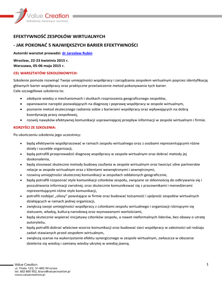 EFEKTYWNOŚĆ ZESPOŁÓW WIRTUALNYCH - JAK POKONAĆ 5 NAJWIĘKSZYCH BARIER EFEKTYWNOŚCI Autorski warsztat prowadzi: dr Jarosław Rubin Wrocław, 22-23 kwietnia 2015 r. Warszawa, 05-06 maja 2015 r. CEL WARSZTATÓW SZKOLENIOWYCH: Szkolenie pomoże rozwinąć Twoje umiejętności współpracy i zarządzania zespołem wirtualnym poprzez identyfikację głównych barier współpracy oraz praktyczne przećwiczenie metod pokonywania tych barier. Cele szczegółowe szkolenia to: zdobycie wiedzy o mechanizmach i skutkach rozproszenia geograficznego zespołów, opanowanie narzędzi pozwalających na diagnozę i poprawę współpracy w zespole wirtualnym, poznanie metod skutecznego radzenia sobie z barierami współpracy oraz wpływających na dobrą koordynację pracy zespołowej, rozwój nawyków efektywnej komunikacji usprawniającej przepływ informacji w zespole wirtualnym i firmie. KORZYŚCI ZE SZKOLENIA: Po ukończeniu szkolenia jego uczestnicy: będą efektywnie współpracować w ramach zespołu wirtualnego oraz z osobami reprezentującymi różne działy i szczeble organizacji, będą potrafili przeprowadzić diagnozę współpracy w zespole wirtualnym oraz dobrać metody jej doskonalenia, będą stosować skuteczne metody budowy zaufania w zespole wirtualnym oraz tworzyć silne partnerskie relacje w zespole wirtualnym oraz z klientami wewnętrznymi i zewnętrznymi, rozwiną umiejętności skutecznej komunikacji w zespołach oddalonych geograficznie, będą potrafili rozpoznać style komunikacji członków zespołu, związane ze skłonnością do odkrywania się i poszukiwania informacji zwrotnej, oraz skutecznie komunikować się z pracownikami i menedżerami reprezentującymi różne style komunikacji, potrafili rozbijać „silosy” powstające w firmie oraz budować tożsamość i spójność zespołów wirtualnych działających w ramach jednej organizacji, zwiększą swoje umiejętności współpracy z członkami zespołu wirtualnego i organizacji różniącymi się statusem, władzą, kulturą narodową oraz wyznawanymi wartościami, będą skutecznie wspierać inicjatywy członków zespołu, a nawet nieformalnych liderów, bez obawy o utratę autorytetu, będą potrafili dobrać właściwe wzorce komunikacji oraz budować sieci współpracy w zależności od rodzaju zadań stawianych przed zespołem wirtualnym, zwiększą szanse na wykorzystanie efektu synergicznego w zespole wirtualnym, zwłaszcza w obszarze dzielenia się wiedzą i zamiany wiedzy ukrytej w wiedzę jawną. 1 METODYKA: ćwiczenia, praca indywidualna i grupowa, gry i symulacje, odgrywanie ról, dyskusja moderowana, wykład. PROGRAM: 1. Istota współpracy w zespołach wirtualnych o Charakterystyka zespołu wirtualnego – pros & cons, o Pięć kryteriów rozproszenia geograficznego zespołu (dystans, strefa czasowa, izolacja, lokalizacja, nierównowaga) – mechanizmy i skutki rozproszenia geograficznego, o Efektywna współpraca zespołów wirtualnych – cykl sukcesu zespołów wirtualnych – analiza i wnioski. 2. Analiza potencjału zespołu wirtualnego o Diagnoza dysfunkcji zespołu wirtualnego – metoda badania zespołów wirtualnych – przyjrzyj się Twojemu zespołowi i wyciągnij wnioski, o Piramida efektywności zespołu wirtualnego i jej fundament, o Brak zaufania – Pierwsza bariera efektywności zespołów wirtualnych. o Jak można zbudować zaufanie w zespole wirtualnym – burza mózgów. 3. Partnerskie relacje w wielokulturowej organizacji i zespołach wirtualnych o Gra biznesowa „Eksperci” – praktyczna identyfikacja barier porozumienia w zespole wirtualnym, o Druga bariera efektywności – różnice kulturowe, o Metody unikania sytuacji trudnych w ramach zespołów wirtualnych, o Bariera semantyczna w pracy zespołów wirtualnych - różnice w znaczeniu wyrażeń, o Jak radzić sobie z różnicami kulturowymi, kiedy nie jesteśmy ekspertami od wielokulturowości. 4. Od komunikacji do relacji i efektywnej współpracy o Efektywne sieci komunikacji – według jakiego wzorca ma przebiegać komunikacja w zespole wirtualnych – gra biznesowa – dyskusja i wnioski, o Typologia stylów komunikacji związana z odkrywaniem się i poszukiwaniem informacji zwrotnej – diagnoza własnego stylu komunikacji, o Charakterystyka czterech stylów komunikacji (ślepy, ukryty, zamknięty, otwarty) w odniesieniu do pracowników i menedżerów oraz bariery związanej z komunikacją międzystylową, o Narzędzia komunikacji budujące relacja: komunikat JA, model pełnej ekspresji, hamulec zachowań niepożądanych, informacja zwrotna. Metody rozmowy z osobami o różnych stylach komunikacji. o Trening komunikacji międzystylowej nastawionej na zwiększenie efektywności zespołów wirtualnych. 5. Relacje ponad granicami o Bunkry funkcjonalne kontra sieci współpracy w organizacjach – gra biznesowa „Zanieczyszczanie jeziora”, o Przyczyny powstawania bunkrów funkcjonalnych i silosów komunikacyjnych w organizacji – bariera czwarta, 2 o Radzenie sobie z silosami za pomocą określenia i jasne komunikowania głównego celu firmy, Cechy głównego celu firmy. Czym jest a czym nie jest główny cel firmy – różnica między głównym celem a wizją czy celami ilościowymi, o „Nieoczekiwane korzyści”, czyli efekt synergii w ramach współpracy w zespole - ćwiczenie, o Efekt synergiczny w zarządzaniu wiedzą, o Metody dzielenia się wiedzą w zespole wirtualnym w świetle koncepcji zarządzania wiedzą ukrytą i jawną. Spirala SECI (Socjalizacja, Eksternalizacja, Kombinacja i Internalizacja). 6. W kierunku mistrzowskich relacji o Kwestia odległości w zespołach wirtualnych – omówienie najnowszych wyników badań dotyczących efektywności zespołów rozproszonych geograficznie, o Radzenie sobie z odległością w zespołach wirtualnych – dyskusja i rekomendacje, Zależność wyników zespołu od jakości procesów zorientowanych na zadania . o Wartości budujące i utrudniające współ