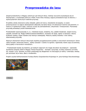 Przeprowadzka do lasu Zespół przedszkolny w Węgoju zakończył cykl leśnych lekcji, metody nauczania wywodzącej się ze Skandynawii, a rozwiniętej twórczo w Walii. Przez kilka miesięcy zajęcia prowadzone były na dworze, z wykorzystaniem okolicznych walorów przyrody. W pobliżu szkoły stworzono Leśny Zakątek, gdzie od marca, niezależnie od pogody, w czasie przeznaczonym na zajęcia obowiązkowe odbywały się leśne lekcje. W zalesionym terenie nad jeziorem, w trakcie 2-4 godzinnych zajęć, maluchy uczyły się samodzielności, aktywności i kreatywności. Poznawały przyrodę prowadząc proste doświadczenia. Przedszkolaki wykorzystywały m. in.: metalowe taczki, wiaderka, liny, pałatki biwakowe, wiązki trzciny, szpadle, konewki itp. Mogły „bezkarnie” wchodzić do wody, taplać w kałużach i błocie, budować szałasy, kopać stawek oraz tworzyć wodospady. Maluchy sadziły drzewka i inne rośliny, obserwowały przyrodę. Ważnym elementem leśnych lekcji było wspólne przygotowywanie posiłku w warunkach terenowych. Dzieci robiły kanapki, bananowe desery , piekły szaszłyki i ciastka na ognisku. Ugotowały nawet zupę szczawiową, którą zjadły w harcerskich menażkach. – Przedszkolaki bawiły się świetnie, po każdych zajęciach nie mogły doczekać się kolejnych – opowiada dyrektorka Zespołu Szkół w Węgoju Teresa Kacperska. – Kontakt z przyrodą, na który stawiamy od wielu lat, rozwija i uczy. Sprawia, że dzieci pozbywają się obojętności na otaczające je rośliny i zwierzęta, wiedzą jak zachować się w lesie, dbać o środowisko. Projekt uzyskał dofinansowanie Fundacji Banku Gospodarstwa Krajowego im. Jana Kantego Steczkowskiego. Drukuj