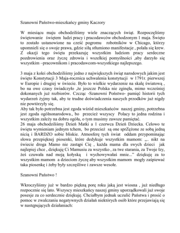 Szanowni Państwo-mieszkańcy gminy Kaczory W miesiącu maju obchodziliśmy wiele znaczących świąt. Rozpoczęliśmy świętowanie świętem ludzi pracy i pracodawców obchodzonym 1 maja. Święto to zostało ustanowione na cześć pogromu robotników w Chicago, którzy upomnieli się o swoje prawa, gdzie siłą stłumiono manifestacje , polała się krew. Z okazji tego święta przekazuję wszystkim ludziom pracy serdeczne pozdrowienia oraz życzę zdrowia i wszelkiej pomyślności ,aby darzyło się wszystkim –pracownikom i pracodawcom-wszystkiego najlepszego. 3 maja z kolei obchodziliśmy jedno z największych świąt narodowych jakim jest święto Konstytucji 3 Maja-rocznica uchwalenia konstytucji w 1791r. pierwszej w Europie i drugiej w świecie. Było to wielkie wydarzenie na skalę światową , bo na owe czasy świadczyło ,że jeszcze Polska nie zginęła, mimo wcześniej dokonanych już rozbiorów. Czcząc -Szanowni Poństwo- pamięć historii tych wydarzeń żyjmy tak, aby te trudne doświadczenia naszych przodków już nigdy nie powtórzyły się. Aby tak było potrzebna jest zgoda wśród mieszkańców naszej gminy, potrzebna jest zgoda ogólnonarodowa., bo przecież wszyscy Polacy to jedna rodzina i wszystkim zależy na dobru ogółu, o tym musimy zawsze pamiętać. 26 maja obchodziliśmy Dzień Matki a 1 czerwca Dzień Dziecka. Celowo te święta wymieniam jednym tchem, bo przecież są one sprZężone ze sobą jedną nicią i BARDZO sobie bliskie. Atmosferę tych świat oddam przypominając słowa przepięknej piosenki, które dedykuje wszystkim mamom: „.. nikt na świecie droga Mamo nie zastąpi Cię , każda mama dla swych dzieci jak najlepiej chce , dziękuję Ci Mamusiu za wszystko , za twe starania, za Twoje łzy, żeś czuwała nad moją kołyską i wychowywałaś mnie...” dziękuję za to wszystkim mamom a dzieciom życzę aby wszystkim mamom mogły zaśpiewać taka piosenkę i żeby były szczęśliwe i zawsze wesołe. Szanowni Państwo ! Wkroczyliśmy już w bardzo piękną porę roku jaką jest wiosna , już niedługo rozpocznie się lato. Wszyscy mieszkańcy naszej gminy uporządkowali już swoje posesje za co serdecznie dziękuję. Chciałbym jednak uczulić Państwa i prosić o pomoc w zwalczaniu negatywnych działań niektórych osób które przejawiają się w następujących działaniach: -podlewanie ogródków i trawników domowych może spowodować braki w dostawie wody do niektórych mieszkań , dlatego powinniśmy starać się tak gospodarować wodą , aby takie zagrożenia nie powstawały . Najlepiej jeśli zachodzi potrzeba ,podlewać w godzinach 23:00 do 5:00. Kto będzie podlewał w innych godzinach , zwłaszcza w okresie wielkiej suszy będzie działał przeciwko sobie i innych mieszkańców . Chcę podkreślić, że np. w Kaczorach do celów bytowych pobierane jest około 500m sześciennych wody na dobę, hydrofornia jest w stanie zabezpieczyć do 1300 m sześciennych na dobę a w niektórych przypadkach nie starcza zwłaszcza przy zbyt intensywnym pobraniu. Dlatego apel do wszystkich mieszkańców aby zwracać uwagę tym którzy nie stosują się do powyższego. -apeluję również do mieszkańców aby nie byli obojętni wobec niszczenia mienia, które jest własnością gminy, czyli nas wszystkich a więc przystanków, niszczenie kwietników, urządzeń sportowych, bądź wyposażeń na placach szkolnych i przedszkolnych. Grupa osób , którzy niszczą jest niewielka ale skutki są widoczne i rażą nas wszystkich. -zwracam się z prośba do wszystkich użytkowników dróg o rozwagę , zwłaszcza do użytkowników motocykli, którzy popisują się swoimi umiejętnościami na ulicach miejscowości i innych drogach. Na drogach powinniśmy się zachowywać tak aby inni użytkownicy dróg czuli się bezpiecznie. W tym miejscu apeluję również do policji aby na tym punkcie była szczególnie uczulona. Szanowni Państwo! Na terenie gminy są realizowane bądź będą w najbliższym czasie następujące inwestycje: -zakończono następny etap budowy dróg i chodników w miejscowości Dziembówku -wyremontowano szatnię sportową w Dzimbowie -rozpoczęto budowę dróg w Dziembowie (droga k/sali i w kierunku łak) -rozstrzygnięto przetarg na budowę dróg w Morzewie (ul. Kościelna i k/szkoły) oraz drogi w Rzadkowie (od posesji sołtysa w kierunku Równopola) -oczekujemy na rozstrzygnięcie wniosku złożonego w Urzędzie Marszałkowskim odnośnie budowy drogi w Morzewie ul.równoległej i do ul. Kościelnej i bruku i drogi do Rzadkowa. -przygotowujemy przetarg na rozbudowę Szkoły w Dziembowie oraz salę gimnastyczną . Myślę, że oprócz wymienionych inwestycji jeszcze w tym roku będziemy realizować inne, o tym na bieżąco będę informował naszych mieszkańców. Drodzy Mieszkańcy! W związku z tym , że dzień 27 maja jest Dniem Samorządu Terytorialnego a przecież samorząd tworzą wszyscy mieszkańcy naszej gminy , dlatego chcę podkreślić , że tych lat od kiedy powstały samorządy terytorialne (1990r) nie przespaliśmy , nasze osiągnięcia i sukcesy są coraz bardziej doceniane przez nas samych a z zazdrością spostrzegaj na nas mieszkańcy innych gmin. Na te osiągnięcia i sukcesy pracowali wszyscy mieszkańcy naszej gminy i możemy być z tego dumni. Chcę jeszcze raz podkreślić , że nie wiele jest gminw Polsce tego typu aby była w 100% zwodociągowana , skanalizowana i zgazyfikowana jeśli jeszcze do tego dodamy wysoki poziom oświaty ( nowe szkoły i przedszkola ), kultury (we wszystkich miejscowościach Domy Kultury), sport (trzy stadiony z trybunami) w każdej miejscowości boiska.), ciągła poprawa dróg i chodników to są osiągnięcia , których nie łatwo będzie osiągnąć innym. Uważam ,że osiągnęliśmy wiele, ale to nie znaczy , że nie mamy co robić , jest jeszcze wiele do zrobienia i jestem pewien, że razem pokonamy wszystkie trudności. Dziękuję wszystkim naszym mieszkańcom za zaangażowan