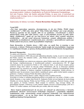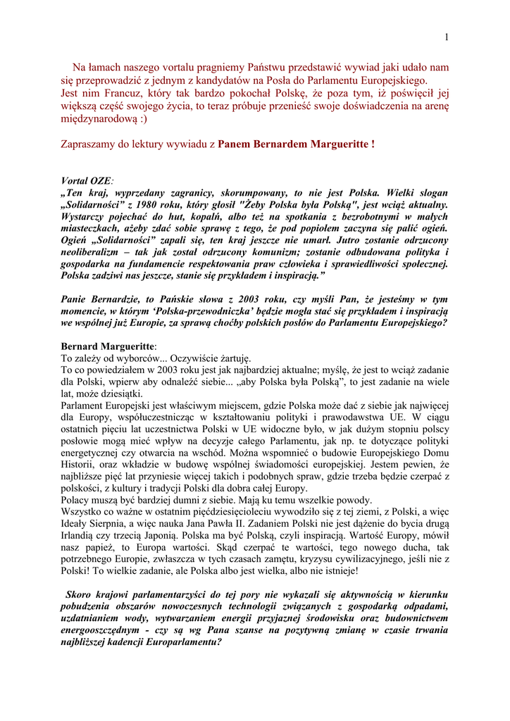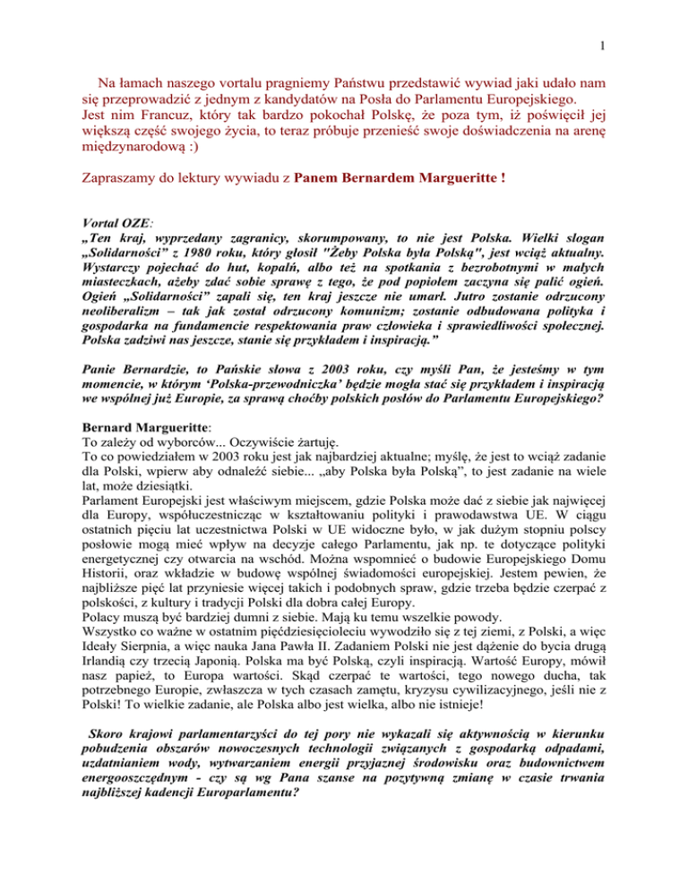 1 Na łamach naszego vortalu pragniemy Państwu przedstawić wywiad jaki udało nam się przeprowadzić z jednym z kandydatów na Posła do Parlamentu Europejskiego. Jest nim Francuz, który tak bardzo pokochał Polskę, że poza tym, iż poświęcił jej większą część swojego życia, to teraz próbuje przenieść swoje doświadczenia na arenę międzynarodową :) Zapraszamy do lektury wywiadu z Panem Bernardem Margueritte ! Vortal OZE: „Ten kraj, wyprzedany zagranicy, skorumpowany, to nie jest Polska. Wielki slogan „Solidarności” z 1980 roku, który głosił "Żeby Polska była Polską", jest wciąż aktualny. Wystarczy pojechać do hut, kopalń, albo też na spotkania z bezrobotnymi w małych miasteczkach, ażeby zdać sobie sprawę z tego, że pod popiołem zaczyna się palić ogień. Ogień „Solidarności” zapali się, ten kraj jeszcze nie umarł. Jutro zostanie odrzucony neoliberalizm – tak jak został odrzucony komunizm; zostanie odbudowana polityka i gospodarka na fundamencie respektowania praw człowieka i sprawiedliwości społecznej. Polska zadziwi nas jeszcze, stanie się przykładem i inspiracją.” Panie Bernardzie, to Pańskie słowa z 2003 roku, czy myśli Pan, że jesteśmy w tym momencie, w którym ‘Polska-przewodniczka’ będzie mogła stać się przykładem i inspiracją we wspólnej już Europie, za sprawą choćby polskich posłów do Parlamentu Europejskiego? Bernard Margueritte: To zależy od wyborców... Oczywiście żartuję. To co powiedziałem w 2003 roku jest jak najbardziej aktualne; myślę, że jest to wciąż zadanie dla Polski, wpierw aby odnaleźć siebie... „aby Polska była Polską”, to jest zadanie na wiele lat, może dziesiątki. Parlament Europejski jest właściwym miejscem, gdzie Polska może dać z siebie jak najwięcej dla Europy, współuczestnicząc w kształtowaniu polityki i prawodawstwa UE. W ciągu ostatnich pięciu lat uczestnictwa Polski w UE widoczne było, w jak dużym stopniu polscy posłowie mogą mieć wpływ na decyzje całego Parlamentu, jak np. te dotyczące polityki energetycznej czy otwarcia na wschód. Można wspomnieć o budowie Europejskiego Domu Historii, oraz wkładzie w budowę wspólnej świadomości europejskiej. Jestem pewien, że najbliższe pięć lat przyniesie więcej takich i podobnych spraw, gdzie trzeba będzie czerpać z polskości, z kultury i tradycji Polski dla dobra całej Europy. Polacy muszą być bardziej dumni z siebie. Mają ku temu wszelkie powody. Wszystko co ważne w ostatnim pięćdziesięcioleciu wywodziło się z tej ziemi, z Polski, a więc Ideały Sierpnia, a więc nauka Jana Pawła II. Zadaniem Polski nie jest dążenie do bycia drugą Irlandią czy trzecią Japonią. Polska ma być Polską, czyli inspiracją. Wartość Europy, mówił nasz papież, to Europa wartości. Skąd czerpać te wartości, tego nowego ducha, tak potrzebnego Europie, zwłaszcza w tych czasach zamętu, kryzysu cywilizacyjnego, jeśli nie z Polski! To wielkie zadanie, ale Polska albo jest wielka, albo nie istnieje! Skoro krajowi parlamentarzyści do tej pory nie wykazali się aktywnością w kierunku pobudzenia obszarów nowoczesnych technologii związanych z gospodarką odpadami, uzdatnianiem wody, wytwarzaniem energii przyjaznej środowisku oraz budownictwem energooszczędnym - czy są wg Pana szanse na pozytywną zmianę w czasie trwania najbliższej kadencji Europarlamentu? 2 Jednym z priorytetów mojej działalności jako europosła będzie ochrona środowiska naturalnego. W tej dziedzinie toczą się aktywne prace w parlamencie, także związane z walką z ociepleniem klimatycznym. Nawet jeśli dotychczas nie było takiej bezpośredniej inicjatywy ze strony polskich posłów dot. nowoczesnych technologii w dziedzinie środowiska, mam zamiar się w te prace włączyć. Patrząc z perspektywy europejskiej łatwiej widać, w sposób bardziej klarowny, jak kluczowe są sprawy związane z ochroną środowiska. Tu nie ma wyboru. Chodzi o ocalenie naszej ziemi, o zabezpieczenie przyszłości naszych dzieci. Proszę powiedzieć, czy wydaje się Panu, że polskim posłom, starczy hartu ducha i umiejętności wznoszenia się nad podziałami, aby w obliczu sprzecznych euro-interesów, stanowić wspólny, polski front w walce o realizowanie swoich koncepcji i projektów? Z którymi z europosłów byłby Pan w stanie taki front tworzyć? Nie mam wątpliwości, że na pewno znajdą się posłowie, z którymi będę współpracować. Europejska Partia Ludowa (Chrześcijańska Demokracja), której stanę się członkiem jest największą frakcją w Parlamencie, więc mam nadzieję, że wspólnie z innymi polskimi posłami, (których większość z polskiej 50-tki też będzie z ramienia tej grupy) uda nam się utworzyć front międzynarodowy i przekonać do swoich koncepcji większość parlamentarną. Istnieje Klub Polski, klub wszystkich polskich europosłów. Zbiera się raz na miesiąc w Strasburgu. Ale Klub Polski to nie spotkania raz na miesiąc, „klub polski”, każdy musi mieć w swoim sercu i w każdej sekundzie. Są przecież znakomici europosłowie, niezależnie od przynależności partyjnej, jak Saryusz-Wolski, Buzek, Rosati, Siekierski czy inni. Zarówno Pańskie światowe obycie, jak i swobodne poruszanie się w kalejdoskopie kulturowych i mentalnych różnic, pozwalają niewątpliwie na bardziej wnikliwą analizę przyczyn polskich zaniedbań zarówno w obrębie rozwijania rynku nowoczesnych technologii, ale także wciąż niskiej świadomości ekologicznej. Proszę powiedzieć jak przyspieszyć taką mentalną przemianę, by bezinteresowna dbałość zarówno o jakość przyrody, ale także jakość życia naszych ‘braci mniejszych’ była wrośnięta w świadomość nowoczesnego człowieka. Przyszłość zależy tu od współdziałania organizacji pozarządowych (i ich aktywności również internetowej), mediów i systemu edukacyjnego. Wszyscy razem muszą uwrażliwiać społeczeń