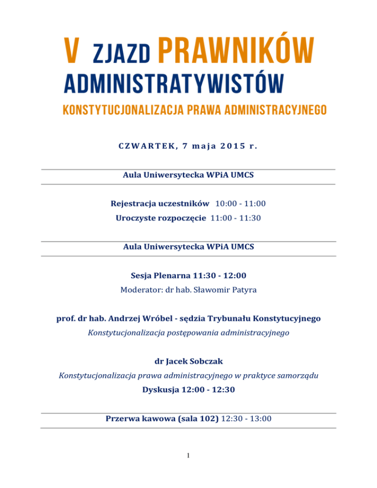 CZWARTEK, 7 maja 2015 r. Aula Uniwersytecka WPiA UMCS Rejestracja uczestników 10:00 - 11:00 Uroczyste rozpoczęcie 11:00 - 11:30 Aula Uniwersytecka WPiA UMCS Sesja Plenarna 11:30 - 12:00 Moderator: dr hab. Sławomir Patyra prof. dr hab. Andrzej Wróbel - sędzia Trybunału Konstytucyjnego Konstytucjonalizacja postępowania administracyjnego dr Jacek Sobczak Konstytucjonalizacja prawa administracyjnego w praktyce samorządu Dyskusja 12:00 - 12:30 Przerwa kawowa (sala 102) 12:30 - 13:00 1 SALA 106 SALA 108 Panel I Panel II 13:00 - 14:00 13:00 - 14:00 Moderator: dr Marta Grzeszczuk Moderator: dr Maciej Podleśny mgr Michał Koszowski (UJ) dr Mariusz Krawczyk (UJ) Konstytucjonalizacja sytuacji osoby Sądowoadministracyjny wymiar uzależnionej sprawiedliwości a jego wymiar konstytucyjny mgr Jakub Mrożek (UWr) mgr Jacek Piecha (UW) Wpływ Konstytucji RP na ustrojowy kształt Sprzeciw organu administracji publicznej polskiego sądownictwa a postępowanie administracyjne. Ewelina Janas (UMCS) Refleksje na tle konstytucyjnych środków Skarga konstytucyjna w postępowaniu ochrony praw i wolności sądowoadministracyjnym Aneta Majewska (UMCS) - rozważania de lege ferenda Konstytucyjna zasada dwuinstancyjności Daria Wójcik (WSB Radom) postępowania administracyjnego Zasada pogłębiania zaufania obywateli Maciej Synowicz (UW) do władzy publicznej Konstytucyjność zasady »in dubio pro w świetle Konstytucji RP tributario« a orzecznictwo sądów mgr Natalia Rysz (UJ) administracyjnych Możliwość wzruszenia decyzji mgr Wiktor Trybka (UWr) administracyjnej jako skutek wyroku Nabycie praw w drodze decyzji Trybunału Konstytucyjnego orzekającego administracyjnej a zasada demokratycznego o niekonstytucyjności aktu prawnego państwa prawnego mgr Paweł Kędzierski (UMCS) i praworządności w świetle orzecznictwa Samorządy zawodowe sądowego w świetle art. 17 ust. 1 Konstytucji RP mgr Łukasz Dziamski (UW) Hubert Kostecki (UMCS) Prawo zakładania uczelni niepublicznych Projekt ustawy o nieodpłatnej pomocy a polska regulacja konstytucyjna prawnej i informacji prawnej w kontekście na przestrzeni lat 1920-2005 konstytucyjnej zasady demokratycznego państwa prawa 2 mgr Łukasz Dzida (UMCS) Zakres obowiązywania zasady »lex retro non agit« na gruncie prawa administracyjnego w świetle orzecznictwa Trybunału Konstytucyjnego Dyskusja 14:00 - 14:30 Dyskusja 14:00 - 14:30 Obiad 14:30 - 15:30 Obiad 14:30 - 15:30 (Bazylia, (Bazylia, Wydział Humanistyczny UMCS) Wydział Humanistyczny UMCS) Panel III Panel IV 15:30 - 16:30 15:30 - 16:30 Moderator: dr Grzegorz Lubeńczuk Moderator: dr Emil Kruk mgr Tomasz Śliwak (UWr) mgr Michał Skóra (UR) Kontrola tworzenia Specyfika zatrudnienia i stosowania lokalnego prawa podatkowego w służbie cywilnej - wybrane zagadnienia w świetle Konstytucji RP Maciej Koziński (UMK) Jakub Kalinowski, Konstytucyjne podstawy dostępu do Aleksandra Koniewicz (UMCS) informacji publicznej Służba cywilna w Polsce Malwina Walenda (UAM) – ideały a rzeczywistość. Analiza problemu Odszkodowanie z tytułu szkody wyrządzonej oraz postulaty de lege lata przez niezgodne z prawem działanie lub mgr Anna Hnatów (UAM) zaniechanie przy wykonywaniu władzy Milcząca interpretacja publicznej jako przychód uzyskany przez a zasada zaufania obywateli do państwa spółkę podlegający opodatkowaniu – Małgorzata Kuczera (UR) o absurdach polskiego prawa i konieczności Sądowa ochrona samodzielności jednostek interwencji Trybunału Konstytucyjnego samorządu terytorialnego mgr Paulina Daniluk, Mateusz Bałuka, Dawid Kościołko mgr Małgorzata Pietrzak (UMCS) (UMCS) Upowszechnianie i stwarzanie równego Dostęp do informacji publicznej w świetle dostępu do dóbr kultury jako obowiązek orzecznictwa Trybunału Konstytucyjnego organów administracji państwowej 3 Piotr Adamski (UWr) Piotr Kobylski, Angelika Koman (UMCS) Decentralizacja finansów publicznych Koncepcja budowy służby cywilnej a finanse jednostek samorządu terytorialnego a Konstytucja RP mgr Kamila Surowiecka (UWr) Dwuinstancyjność postępowania administracyjnego jako podstawowy element ochrony konstytucyjnie gwarantowanych wolności i praw obywateli Dyskusja 16:30 - 17:00 Dyskusja 16:30 - 17:00 17:00 17:00 Zakończenie Zakończenie pierwszego dnia obrad pierwszego dnia obrad 4 PIĄTEK, 8 maja 2015 r. Rejestracja uczestników 9:00 - 10:00 SALA 110 SALA 106 Panel I Panel II 10:00 - 11:00 10:00 - 11:00 Moderator: dr Dorota Lebowa Moderator: dr Jakub Kosowski Justyna Świerczek (KUL) mgr Piotr Stanisław Kapusta (UWr) Środki nadzoru oraz ich realizacja Odpowiedzialność za szkodę legalną na nad działalnością samorządu terytorialnego przykładzie instytucji wywłaszczenia - mgr Marta Mulawa (UMCS) gwarancje konstytucyjne i regulacje ustawowe Wpływ nadzoru sprawowanego przez Kamil Galas (UJ) Regionalne Izby Obrachunkowe na kondycję Niekonstytucyjność procesu finansową jednostek samorządu terytorialnego sądowoadminstracyjnego prowadzonego mgr Sebastian Gajewski (UW) na skutek zastosowania art. 58 § 4 p.p.s.a. Konstytucyjny model kształtowania granic i art. 199 § 1 pkt 1 k.p.c. jednostek samorządu terytorialnego mgr Adrian Sypnicki (KUL) mgr Izabela Laurent (UMCS) Wpływ orzecznictwa Trybunału Konstytucyjnego Instytucja mandatu wolnego na zwrot wywłaszczonych nieruchomości a dyscyplinowanie radnych j.s.t. mgr Katarzyna Malinowska (UWr) mgr Paulina Daniluk (UMCS) Realizacja konstytucyjnej zasady kontroli Konstytucjonalizacja Komisji Nadzoru sądowej Finansowego - postulaty de lege ferenda w postępowaniu antymonopolowym Adrian Łaga (UG) Tomasz Drab, Mariusz Królicki (UMCS) Akt prawa miejscowego. Zagadnienie jego Wpływ zasady decentralizacji władzy publicznej klasyfikacji i publikacji zawartej w Konstytucji RP w wojewódzkim dzienniku urzędowym na jakość administracji publicznej mgr Kacper Lewandowski (KUL) Maria Baranowska, Izabela Cąkała Skutki orzecznictwa TK dla Polskiego Związku (UM
