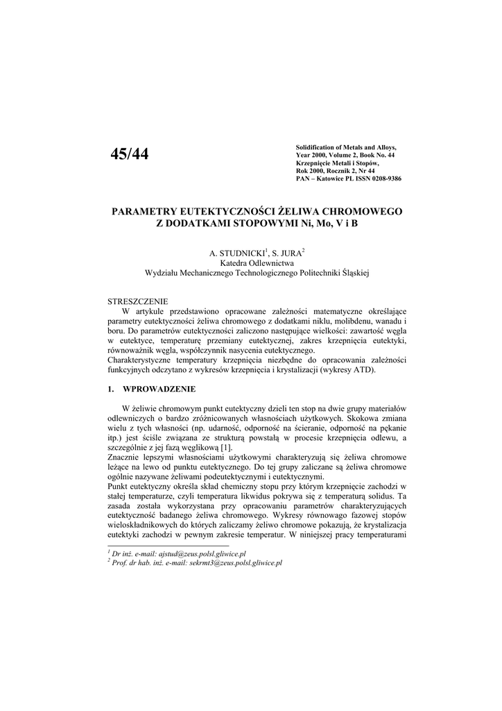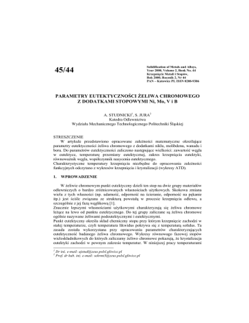45/44 Solidification of Metals and Alloys, Year 2000, Volume 2, Book No. 44 Krzepnięcie Metali i Stopów, Rok 2000, Rocznik 2, Nr 44 PAN – Katowice PL ISSN 0208-9386 PARAMETRY EUTEKTYCZNOŚCI ŻELIWA CHROMOWEGO Z DODATKAMI STOPOWYMI Ni, Mo, V i B A. STUDNICKI1, S. JURA2 Katedra Odlewnictwa Wydziału Mechanicznego Technologicznego Politechniki Śląskiej STRESZCZENIE W artykule przedstawiono opracowane zależności matematyczne określające parametry eutektyczności żeliwa chromowego z dodatkami niklu, molibdenu, wanadu i boru. Do parametrów eutektyczności zaliczono następujące wielkości: zawartość węgla w eutektyce, temperaturę przemiany eutektycznej, zakres krzepnięcia eutektyki, równoważnik węgla, współczynnik nasycenia eutektycznego. Charakterystyczne temperatury krzepnięcia niezbędne do opracowania zależności funkcyjnych odczytano z wykresów krzepnięcia i krystalizacji (wykresy ATD). 1. WPROWADZENIE W żeliwie chromowym punkt eutektyczny dzieli ten stop na dwie grupy materiałów odlewniczych o bardzo zróżnicowanych własnościach użytkowych. Skokowa zmiana wielu z tych własności (np. udarność, odporność na ścieranie, odporność na pękanie itp.) jest ściśle związana ze strukturą powstałą w procesie krzepnięcia odlewu, a szczególnie z jej fazą węglikową [1]. Znacznie lepszymi własnościami użytkowymi charakteryzują się żeliwa chromowe leżące na lewo od punktu eutektycznego. Do tej grupy zaliczane są żeliwa chromowe ogólnie nazywane żeliwami podeutektycznymi i eutektycznymi. Punkt eutektyczny określa skład chemiczny stopu przy którym krzepnięcie zachodzi w stałej temperaturze, czyli temperatura likwidus pokrywa się z temperaturą solidus. Ta zasada została wykorzystana przy opracowaniu parametrów charakteryzujących eutektyczność badanego żeliwa chromowego. Wykresy równowago fazowej stopów wieloskładnikowych do których zaliczamy żeliwo chromowe pokazują, że krystalizacja eutektyki zachodzi w pewnym zakresie temperatur. W niniejszej pracy temperaturami 1 2 Dr inż. e-mail: [email protected] Prof. dr hab. inż. e-mail: [email protected] 336 granicznymi reakcji eutektycznej są temperatury oznaczone przez TS1 i TS2. Temperatury te określono na wykresach ATD badanego żeliwa chromowego. Występują one w punktach maksymalnego efektu cieplnego początku i końca krystalizacji eutektyki. Opisane zależnościami matematycznymi temperatury krzepnięcia TL, TS1 i TS2 [2,3] wykorzystano do opracowania parametrów eutektyczności badanego żeliwa chromowego. W pracy określono następujące parametry eutektyczności żeliwa chromowego: zawartość węgla w eutektyce Ceut [% wag.], temperatura przemiany eutektycznej TE [oC], zakres krzepnięcia eutektyki ∆TE [oC], równoważnik węgla CE [% wag.], współczynnik nasycenia eutektycznego SC [ ]. 2. ZAWARTOŚĆ WĘGLA W EUTEKTYCE, TEMPERATURA PRZEMIANY EUTEKTYCZNEJ I ZAKRES KRZEPNIĘCIA EUTEKTYKI W żeliwie chromowym do jednoznacznego opisu położenia punktu eutektycznego niezbędne są trzy parametry, dwa parametry temperaturowe i jeden dotyczący zawartości węgla w żeliwie eutektycznym. Taki opis wiąże się z klasycznym patrzeniem na wykres fazowy i porównywaniem go do układu żelazo-węgiel. Temperatury określają położenie punktu eutektycznego „w pionie” tj. na osi temperatury a zawartość węgla w eutektyce '‘w poziomie" tj. na osi zawartości węgla w żeliwie. Na rys.1 na fragmencie wykresu fazowego żeliwa chromowego pokazano te trzy parametry definiujące położenie punktu eutektycznego. temperatura [ o C] 1400 1380 TL 1360 1340 1320 1300 TS1 1280 1260 1240 TE 1220 1200 1180 1160 ∆TE TS2 1140 1120 1.6 1.8 2 2.2 2.4 2.6 2.8 3 3.2 3.4 3.6 zawartość węgla [% wag.] Ceut Rys.1. Parametry opisujące położenie punktu eutektycznego żeliwa chromowego Fig.1. Parameters of eutectic point position of chromium cast iron 337 Zawartość węgla w eutektyce żeliwa chromowego Do wyznaczenia zawartości węgla w eutektyce (Ceut) badanego żeliwa chromowego wykorzystano równani opisujące temperaturę likwidus TL i temperaturę solidus 1 TS1. Dla żeliwa chromowego eutektycznego spełniona musi być następująca zależność: TL – TS1 = 0 (1) Podstawiając za TL równanie 1[3] i za TS1 równanie 2[3] uzyskujemy zależność: 387–85.91⋅C–5.33⋅Cr–3.36⋅Ni+0.51⋅Mo–7.83⋅V–139.13⋅B–0.49⋅SL=0 (2) Następnie podzielono obie strony równania 2 przez współczynnik kierunkowy przy zmiennej C. Zawartość węgla w eutektyce opisuje wtedy następujące równanie: Ceut=4.5–0.062⋅Cr–0.0391⋅Ni+0.0059⋅Mo–0.0911⋅V–1.6195⋅B–0.0057⋅SL (3) Dla badanego żeliwa chromowego wszystkie analizowane pierwiastki stopowe oprócz molibdenu obniżają zawartość węgla w eutektyce czyli przesuwają punkt eutektyczny w lewo w stronę mniejszej zawartości węgla. Przegrzanie żeliwa ukryte w parametrze SL również wpływa na obniżenie węgla w eutektyce. Równanie 3 potwierdza bardzo silne działanie boru na zmianę węgla w eutektyce. Pierwiastek ten dodawany w małych ilościach może znacznie zmienić strukturę żeliwa chromowego. Temperatura przemiany eutektycznej żeliwa chromowego Temperaturę przemiany eutektycznej (TE) lub początek tej przemiany określa temperatura solidus 1 (TS1) opisana równaniem 2[3]. TE=TS1 (4) TE=1200+2.17⋅Cr–10.75⋅Ni–3.41⋅Mo+2.33⋅V–56.47⋅B (5) Na zmianę temperatury przemiany eutektycznej można oddziaływać w obu kierunkach poprzez wprowadzane dodatki stopowe. Do podwyższenia temperatury należy zwiększyć zawartość takich pierwiastków jak chrom i wanad. Silnie na obniżenie temperatury przemiany eutektycznej działa bor. Wprowadzenie 1 % boru powoduje obniżenie temperatury o 56 oC. Zakres temperatur przemiany eutektycznej Zakres temperatur przemiany eutektycznej określają graniczne temperatury TS1 (równanie 2[3]) i TS2 (równanie 3[3]): ∆TE=TS1–TS2 (6) ∆TE=46–1