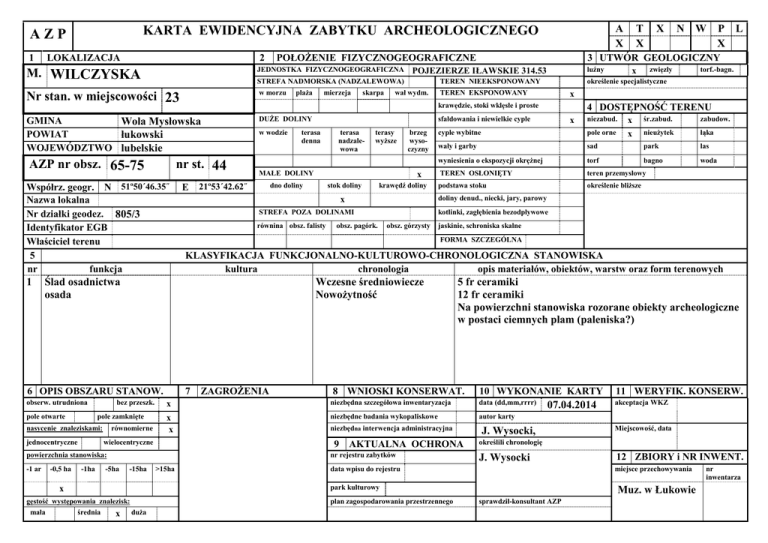 1 LOKALIZACJA 2 POŁOŻENIE FIZYCZNOGEOGRAFICZNE M. WILCZYSKA JEDNOSTKA FIZYCZNOGEOGRAFICZNA Nr stan. w miejscowości 23 w morzu GMINA Wola Mysłowska POWIAT łukowski WOJEWÓDZTWO lubelskie DUŻE DOLINY bez przeszk. pole zamknięte pole otwarte równomierne nasycenie znaleziskami: jednocentryczne -5ha TEREN EKSPONOWANY terasa denna terasa nadzalewowa terasy wyższe MAŁE DOLINY x dno doliny 21º53´42.62˝ brzeg wysoczyzny stok doliny krawędź doliny obsz. pagórk. x gęstość występowania znalezisk: mała średnia x duża torf.-bagn. 4 DOSTĘPNOŚĆ TERENU śr.zabud. zabudow. nieużytek łąka sad park las wyniesienia o ekspozycji okrężnej torf bagno woda TEREN OSŁONIĘTY teren przemysłowy podstawa stoku określenie bliższe x niezabud. cyple wybitne pole orne wały i garby x x kotlinki, zagłębienia bezodpływowe obsz. górzysty jaskinie, schroniska skalne FORMA SZCZEGÓLNA KLASYFIKACJA FUNKCJONALNO-KULTUROWO-CHRONOLOGICZNA STANOWISKA kultura chronologia opis materiałów, obiektów, warstw oraz form terenowych ZAGROŻENIA 5 fr ceramiki 12 fr ceramiki Na powierzchni stanowiska rozorane obiekty archeologiczne w postaci ciemnych plam (paleniska?) 10 WYKONANIE KARTY 11 WERYFIK. KONSERW. niezbędna szczegółowa inwentaryzacja 8 WNIOSKI KONSERWAT. data (dd,mm,rrrr) akceptacja WKZ x x niezbędne badania wykopaliskowe autor karty niezbędna interwencja administracyjna 9 AKTUALNA OCHRONA nr rejestru zabytków -15ha zwięzły x doliny denud., niecki, jary, parowy x równina obsz. falisty P L X x sfałdowania i niewielkie cyple STREFA POZA DOLINAMI 7 wielocentryczne -1ha wał wydm. N W x powierzchnia stanowiska: -0,5 ha skarpa Wczesne średniowiecze Nowożytność 6 OPIS OBSZARU STANOW. -1 ar E w wodzie Ślad osadnictwa osada obserw. utrudniona mierzeja X określenie specjalistyczne TEREN NIEEKSPONOWANY krawędzie, stoki wklęsłe i proste nr st. 44 Współrz. geogr. N 51º50´46.35˝ Nazwa lokalna Nr działki geodez. 805/3 Identyfikator EGB Właściciel terenu 5 nr funkcja plaża T X 3 UTWÓR GEOLOGICZNY luźny POJEZIERZE IŁAWSKIE 314.53 STREFA NADMORSKA (NADZALEWOWA) AZP nr obsz. 65-75 1 A X KARTA EWIDENCYJNA ZABYTKU ARCHEOLOGICZNEGO AZP >15ha 07.04.2014 J. Wysocki, J. Wysocki data wpisu do rejestru 12 ZBIORY i NR INWENT. miejsce przechowywania Muz. w Łukowie park kulturowy plan zagospodarowania przestrzennego Miejscowość, data określili chronologię sprawdził-konsultant AZP nr inwentarza 13 MAPA W SKALI 1:10.000 – UKŁAD WSPÓŁRZĘDNYCH KARTOGRAF. godło arkusza (nr i nazwa) X 446204,59 15 DOKUMENTACJA 16 LITERATURA 17 INNE DANE U 1992 669355,59 Wilczyska – osada w dawnej Ziemi Stężyckiej. Kościół i parafia istY niały już w 1506 roku. Właścicielem dóbr był wówczas Jan Ciołek. Dokumentacja: W. Talarek, Studium wartości kulturowych gminy Wola Mysłowska - zabytki archeologiczne, Warszawa 1996 Brak informacji o zdeponowaniu materiałów z badań w 1996 roku. (liczne fr. ceramiki w tym 2 fr z XIV wieku) Materiały z badań 2006 – Muzeum PP w Białej Podlaskiej, nr inw.: A/14 817 (12 fr ceramiki późnośredniowiecznej i nowożytnej, 1 fr ceramiki OWR, 5 fr ceramiki późnośredniowiecznej (XIIIw)) 14 HISTORIA BADAŃ STANOWISKA (rok/ rodzaj badań/ autor i instytucja) 1996 2006 2014 Powierzchniowe do studium Powierzchniowe AZP Powierzchniowe W. Talarek M. Bienia, E. Niedźwiedź, M. Bienia „IZIS” J. Wysocki