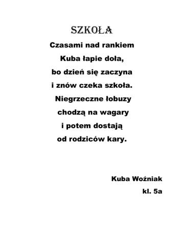 szkoŁa Czasami nad rankiem Kuba łapie doła, bo dzień się zaczyna i znów czeka szkoła. Niegrzeczne łobuzy chodzą na wagary i potem dostają od rodziców kary. Kuba Woźniak kl. 5a