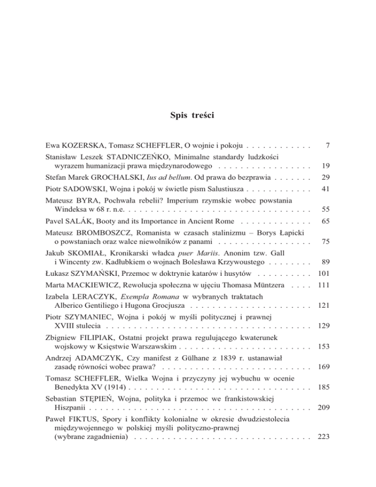 Spis treœci Ewa KOZERSKA, Tomasz SCHEFFLER, O wojnie i pokoju . . . . . . . . . . . . 7 Stanis³aw Leszek STADNICZEÑKO, Minimalne standardy ludzkoœci wyrazem humanizacji prawa miêdzynarodowego . . . . . . . . . . . . . . . . . 19 Stefan Marek GROCHALSKI, Ius ad bellum. Od prawa do bezprawia . . . . . . . 29 Piotr SADOWSKI, Wojna i pokój w œwietle pism Salustiusza . . . . . . . . . . . . 41 Mateusz BYRA, Pochwa³a rebelii? Imperium rzymskie wobec powstania Windeksa w 68 r. n.e. . . . . . . . . . . . . . . . . . . . . . . . . . . . . . . . . . 55 Pavel SALÁK, Booty and its Importance in Ancient Rome . . . . . . . . . . . . . 65 Mateusz BROMBOSZCZ, Romanista w czasach stalinizmu – Borys £apicki o powstaniach oraz walce niewolników z panami . . . . . . . . . . . . . . . . . 75 Jakub SKOMIA£, Kronikarski w³adca puer Mariis. Anonim tzw. Gall i Wincenty zw. Kad³ubkiem o wojnach Boles³awa Krzywoustego . . . . . . . . 89 £ukasz SZYMAÑSKI, Przemoc w doktrynie katarów i husytów . . . . . . . . . . 101 Marta MACKIEWICZ, Rewolucja spo³eczna w ujêciu Thomasa Müntzera . . . . 111 Izabela LERACZYK, Exempla Romana w wybranych traktatach Alberico Gentiliego i Hugona Grocjusza . . . . . . . . . . . . . . . . . . . . . . 121 Piotr SZYMANIEC, Wojna i pokój w myœli politycznej i prawnej XVIII stulecia . . . . . . . . . . . . . . . . . . . . . . . . . . . . . . . . . . . . . 129 Zbigniew FILIPIAK, Ostatni projekt prawa reguluj¹cego kwaterunek wojskowy w Ksiêstwie Warszawskim . . . . . . . . . . . . . . . . . . . . . . . . 153 Andrzej ADAMCZYK, Czy manifest z Gülhane z 1839 r. ustanawia³ zasadê równoœci wobec prawa? . . . . . . . . . . . . . . . . . . . . . . . . . . . 169 Tomasz SCHEFFLER, Wielka Wojna i przyczyny jej wybuchu w ocenie Benedykta XV (1914) . . . . . . . . . . . . . . . . . . . . . . . . . . . . . . . . . 185 Sebastian STÊPIEÑ, Wojna, polityka i przemoc we frankistowskiej Hiszpanii . . . . . . . . . . . . . . . . . . . . . . . . . . . . . . . . . . . . . . . . 209 Pawe³ FIKTUS, Spory i konflikty kolonialne w okresie dwudziestolecia miêdzywojennego w polskiej myœli polityczno-prawnej (wybrane zagadnienia) . . . . . . . . . . . . . . . . . . . . . . . . . . . . . . . . 223 Sebastian KWIECIEÑ, Przepisy prawa przemys³owego z 1927 r. ograniczaj¹ce prawo wykonywania przemys³u z uwagi na zagro¿enie bezpieczeñstwa pañstwa . . . . . . . . . . . . . . . . . . . . . . . . . . . . . . £ukasz MACHAJ, Zjednoczona Europa w pogl¹dach Konrada Adenauera . . . . Edyta SOKALSKA, Pojêcie genocydu w dyskursie miêdzynarodowym w pierwszej po³owie XX w. . . . . . . . . . . . . . . . . . . . . . . . . . . . . Józef KOREDCZUK, Odpowiedzialnoœæ karna za s³u¿bê w obcym wojsku w œwietle polskich XX-wiecznych kodyfikacji karnych . . . . . . . . . . . . . Justyna CELEJ, Rola miêdzynarodowych trybuna³ów karnych w realizacji odpowiedzialnoœci karnej jednostki za zbrodnie i przestêpstwa miêdzynarodowe w tradycji europejskiej . . . . . . . . . . . . . . . . . . . . . Justyna STADNICZEÑKO-SINICA, Wybrane zagadnienia dotycz¹ce dzia³añ OBWE na rzecz pokoju w Europie . . . . . . . . . . . . . . . . . . . . . . . . Rados³aw ANTONÓW, Wspó³czesny terroryzm jako wojna asymetryczna . . . Said EDAICH, Europe and the tradition of War. The Case of Iraqi Wars . . . . . Andrzej SZYMAÑSKI, Wojna, której wygraæ siê nie da³o. Dzia³alnoœæ Wojewódzkiej Komisji do Walki ze Spekulacj¹ w województwie p³ockim w latach 1981–1987 (na podstawie dokumentów z Archiwum Pañstwowego w P³ocku) . . . . . . . . . . . . . . . . . . . . . . . . . . . . . . Anna TUNIA, Spokój publiczny – wartoœæ chroniona w czasach pokoju. Studium na tle przepisów prawa wykroczeñ . . . . . . . . . . . . . . . . . . . Bronis³aw SITEK, Dissertation on the property in the European philosophy and legal culture . . . . . . . . . . . . . . . . . . . . . . . . . . . . . . . . . . . . 239 . 251 . 263 . 277 . 291 . 311 . 319 . 331 . 355 . 377 . 389