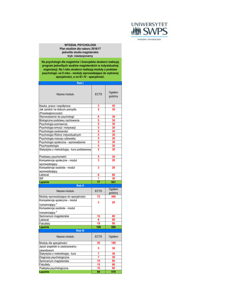 WYDZIAŁ PSYCHOLOGII Plan studiów dla naboru 2016/17 jednolite studia magisterskie tryb: niestacjonarny Na psychologii dla magistrów i licencjatów studenci realizują program jednolitych studiów magisterskich w indywidualnej organizacji. Na I roku studenci realizują moduły z podstaw psychologii, na II roku - moduły wprowadzające do wybranej specjalności, a na III i IV - specjalność. Rok I Nazwa modułu ECTS Ogółem godziny Nauka, praca i współpraca Jak zarobić na dobrym pomyśle (Przedsiębiorczość) Wprowadzenie do psychologii Biologiczne podstawy zachowania Psychologia poznawcza Psychologia emocji i motywacji Psychologia osobowości Psychologia Różnic indywidualnych Psychologia rozwoju człowieka Psychologia społeczna - wprowadzenie Psychopatologia Statystyka z metodologią - kurs podstawowy 3 5 45 30 6 5 5 5 5 5 5 5 5 5 36 30 30 30 30 30 30 30 30 30 Podstawy psychometrii Kompetencje społeczne - moduł wprowadzający Kompetencje osobiste - moduł wprowadzający Lektorat WF Łącznie Rok II 5 3 30 20 3 20 6 1 77 60 30 541 Nazwa modułu Moduły wprowadzające do specjalności Kompetencje społeczne - moduł rozszerzający a Kompetencje osobiste - moduł rozszerzający b Seminarium magisterskie Lektorat Fakultety Łącznie Rok III Nazwa modułu Moduły dla specjalności Język angielski w zastosowaniu zawodowym Statystyka z metodologią - kurs Diagnoza psychologiczna Seminarium magisterskie Fakultety Praktyka psychologiczna Łącznie 72 Ogółem godziny 360 3 20 10 6 18 109 60 60 90 590 ECTS Ogółem 30 180 5 30 7 7 10 15 10 84 30 30 60 90 90 510 ECTS Rok IV (7 semestr) Nazwa modułu ECTS Ogółem Summa psychologiae Etyka zawodowa psychologa Praktyka psychologiczna Aktywność naukowa lub społeczna 7 7 10 30 30 90 Łącznie 30 150 SUMA 300 1791 6 a - realizują studenci specjalności Psychologia kliniczna i zdrowia oraz Psychologia kształtowania i modyfikacji zachowania b - realizują studenci specjalności Psychologia zmiany WYDZIAŁ PSYCHOLOGII Szczegółowy Plan Modułów Specjalnościowych 2016/17 jednolite studia magisterskie tryb: niestacjonarny Specjalność PSYCHOLOGIA KSZTAŁTOWANIA I MODYFIKACJI ZACHOWANIA (program dla magistrów i licencjatów) Rok II (moduły wprowadzające do specjalności) Nazwa modułu ECTS Ogółem godziny 6 30 Zdrowie psychiczne 6 30 Sztuka pomagania 6 30 Stres życiowy 6 30 Bliskie związki 6 30 Dobre starzenie się 6 30 Opieka i wychowanie 6 30 Rozwój osobisty 6 30 Kryzys emocjonalny 6 30 Trudności w uczeniu się 6 30 Zdrowy styl życia 6 30 Seksualność 6 30 Lęk, depresja i uzależnienia Łącznie 72 360 Rok III Nazwa modułu ECTS Ogółem godziny 5 30 Środowisko a zachowanie 5 30 Podstawy stosowanej analizy zachowania 5 30 Typowy i nietypowy rozwój dziecka 5 30 Terapia behawioralna dysfunkcji rozwojowych 5 30 Psychologia behawioralna w środowisku edukacyjnym 5 30 Zmiana zachowań własnych Łączna liczba godzin 30 180 SUMA 102 540
