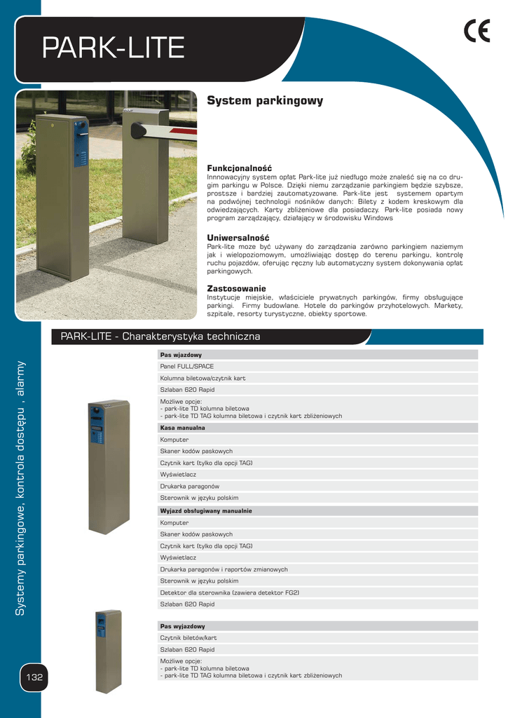 PARK-LITE System parkingowy Funkcjonalność Innnowacyjny system opłat Park-lite już niedługo może znaleść się na co drugim parkingu w Polsce. Dzięki niemu zarządzanie parkingiem będzie szybsze, prostsze i bardziej zautomatyzowane. Park-lite jest systemem opartym na podwójnej technologii nośników danych: Bilety z kodem kreskowym dla odwiedzających. Karty zbliżeniowe dla posiadaczy. Park-lite posiada nowy program zarządzający, działający w środowisku Windows Uniwersalność Park-lite moze być używany do zarządzania zarówno parkingiem naziemym jak i wielopoziomowym, umożliwiając dostęp do terenu parkingu, kontrolę ruchu pojazdów, oferując ręczny lub automatyczny system dokonywania opłat parkingowych. Zastosowanie Instytucje miejskie, właściciele prywatnych parkingów, firmy obsługujące parkingi. Firmy budowlane. Hotele do parkingów przyhotelowych. Markety, szpitale, resorty turystyczne, obiekty sportowe. PARK-LITE - Charakterystyka techniczna Systemy parkingowe, kontrola dostępu , alarmy Pas wjazdowy Panel FULL/SPACE Kolumna biletowa/czytnik kart Szlaban 620 Rapid Możliwe opcje: - park-lite TD kolumna biletowa - park-lite TD TAG kolumna biletowa i czytnik kart zbliżeniowych Kasa manualna Komputer Skaner kodów paskowych Czytnik kart (tylko dla opcji TAG) Wyświetlacz Drukarka paragonów Sterownik w języku polskim Wyjazd obsługiwany manualnie Komputer Skaner kodów paskowych Czytnik kart (tylko dla opcji TAG) Wyświetlacz Drukarka paragonów i raportów zmianowych Sterownik w języku polskim Detektor dla sterownika (zawiera detektor FG2) Szlaban 620 Rapid Pas wyjazdowy Czytnik biletów/kart Szlaban 620 Rapid 132 Możliwe opcje: - park-lite TD kolumna biletowa - park-lite TD TAG kolumna biletowa i czytnik kart zbliżeniowych