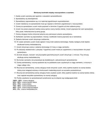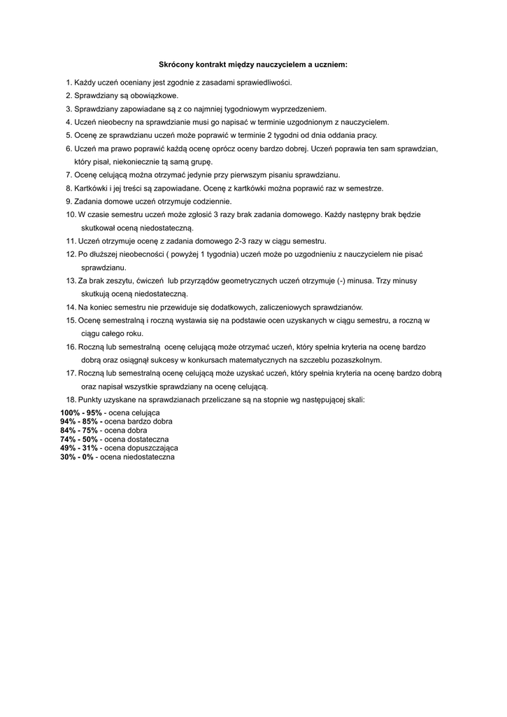 Skrócony kontrakt między nauczycielem a uczniem: 1. Każdy uczeń oceniany jest zgodnie z zasadami sprawiedliwości. 2. Sprawdziany są obowiązkowe. 3. Sprawdziany zapowiadane są z co najmniej tygodniowym wyprzedzeniem. 4. Uczeń nieobecny na sprawdzianie musi go napisać w terminie uzgodnionym z nauczycielem. 5. Ocenę ze sprawdzianu uczeń może poprawić w terminie 2 tygodni od dnia oddania pracy. 6. Uczeń ma prawo poprawić każdą ocenę oprócz oceny bardzo dobrej. Uczeń poprawia ten sam sprawdzian, który pisał, niekoniecznie tą samą grupę. 7. Ocenę celującą można otrzymać jedynie przy pierwszym pisaniu sprawdzianu. 8. Kartkówki i jej treści są zapowiadane. Ocenę z kartkówki można poprawić raz w semestrze. 9. Zadania domowe uczeń otrzymuje codziennie. 10. W czasie semestru uczeń może zgłosić 3 razy brak zadania domowego. Każdy następny brak będzie skutkował oceną niedostateczną. 11. Uczeń otrzymuje ocenę z zadania domowego 2-3 razy w ciągu semestru. 12. Po dłuższej nieobecności ( powyżej 1 tygodnia) uczeń może po uzgodnieniu z nauczycielem nie pisać sprawdzianu. 13. Za brak zeszytu, ćwiczeń lub przyrządów geometrycznych uczeń otrzymuje (-) minusa. Trzy minusy skutkują oceną niedostateczną. 14. Na koniec semestru nie przewiduje się dodatkowych, zaliczeniowych sprawdzianów. 15. Ocenę semestralną i roczną wystawia się na podstawie ocen uzyskanych w ciągu semestru, a roczną w ciągu całego roku. 16. Roczną lub semestralną ocenę celującą może otrzymać uczeń, który spełnia kryteria na ocenę bardzo dobrą oraz osiągnął sukcesy w konkursach matematycznych na szczeblu pozaszkolnym. 17. Roczną lub semestralną ocenę celującą może uzyskać uczeń, który spełnia kryteria na ocenę bardzo dobrą oraz napisał wszystkie sprawdziany na ocenę celującą. 18. Punkty uzyskane na sprawdzianach przeliczane są na stopnie wg następującej skali: 100% - 95% - ocena celująca 94% - 85% - ocena bardzo dobra 84% - 75% - ocena dobra 74% - 50% - ocena dostateczna 49% - 31% - ocena dopuszczająca 30% - 0% - ocena niedostateczna