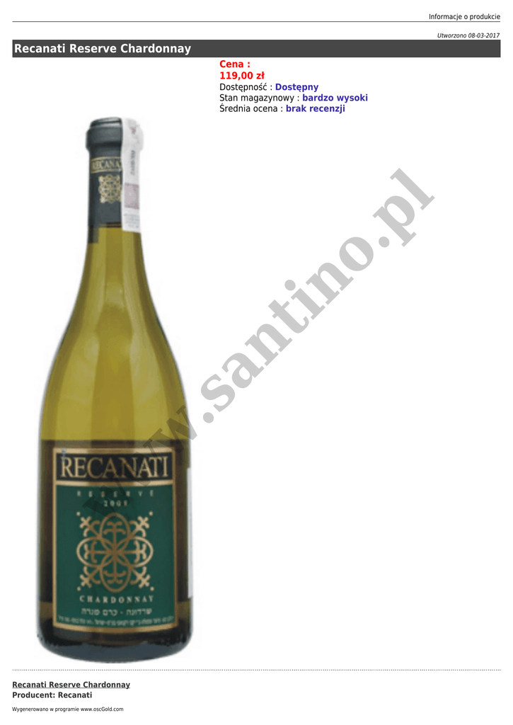 Informacje o produkcie Utworzono 08-03-2017 Recanati Reserve Chardonnay Cena : 119,00 zł w w w .s an t in o. pl Dostępność : Dostępny Stan magazynowy : bardzo wysoki Średnia ocena : brak recenzji Recanati Reserve Chardonnay Producent: Recanati Wygenerowano w programie www.oscGold.com Kraj: Izrael Region: Górna Galilea Alkohol: 13% Pojemność: 0.75l Kolor: białe Smak: Wytrawne w w w .s an t in o. pl Grona użyte do tego Chardonnay pochodzą z najlepszych winnic RECANATI Kerem Ben Zimra oraz Manara i zostały poddane starannej selekcji. Wino leżakowane tradycyjną metodą bordoską przez 9 miesięcy w beczkach z francuskiej dębiny. Podczas procesu dojrzewania wino nabiera kremistości oraz wspaniałych gruszkowych i ananasowych aromatów z subtelnymi nutkami jaśminu, wanilii, miodu oraz kwitnących drzewek cytrynowych w tle. To złożone i delikatne Chardonnay o dobrze wyważonej kwasowości idealnie nadaje się jako aperitif lub kompan do dań z ryb czy drobiu. Wino produkowane w limitowanych ilościach.