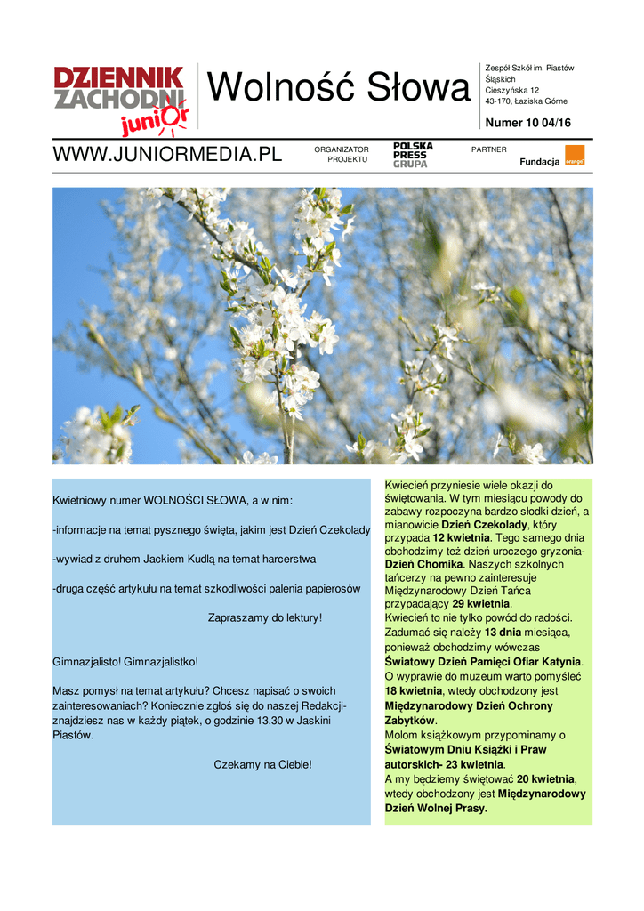Wolność Słowa Zespół Szkół im. Piastów Śląskich Cieszyńska 12 43-170, Łaziska Górne Numer 10 04/16 WWW.JUNIORMEDIA.PL ORGANIZATOR PROJEKTU Kwietniowy numer WOLNOŚCI SŁOWA, a w nim: -informacje na temat pysznego święta, jakim jest Dzień Czekolady -wywiad z druhem Jackiem Kudlą na temat harcerstwa -druga część artykułu na temat szkodliwości palenia papierosów Zapraszamy do lektury! Gimnazjalisto! Gimnazjalistko! Masz pomysł na temat artykułu? Chcesz napisać o swoich zainteresowaniach? Koniecznie zgłoś się do naszej Redakcjiznajdziesz nas w każdy piątek, o godzinie 13.30 w Jaskini Piastów. Czekamy na Ciebie! PARTNER Kwiecień przyniesie wiele okazji do świętowania. W tym miesiącu powody do zabawy rozpoczyna bardzo słodki dzień, a mianowicie Dzień Czekolady, który przypada 12 kwietnia. Tego samego dnia obchodzimy też dzień uroczego gryzoniaDzień Chomika. Naszych szkolnych tańcerzy na pewno zainteresuje Międzynarodowy Dzień Tańca przypadający 29 kwietnia. Kwiecień to nie tylko powód do radości. Zadumać się należy 13 dnia miesiąca, ponieważ obchodzimy wówczas Światowy Dzień Pamięci Ofiar Katynia. O wyprawie do muzeum warto pomyśleć 18 kwietnia, wtedy obchodzony jest Międzynarodowy Dzień Ochrony Zabytków. Molom książkowym przypominamy o Światowym Dniu Ksiąźki i Praw autorskich- 23 kwietnia. A my będziemy świętować 20 kwietnia, wtedy obchodzony jest Międzynarodowy Dzień Wolnej Prasy. Dziennik Zachodni | Numer 10 04/2016 | Strona 2 www.dziennikzachodni.pl Wolność Słowa WWW.JUNIORMEDIA.PL Zachęcamy do przeczytania artykułu poniżej, którego tematem przewodnim jest...CZEKOLADA!!! Czekolada choć nie w formie, którą znamy dzisiaj znana była już w czasach Majów i Azteków. Plemiona te wytwarzały z głównego składnika czekolady - nasion kakaowca- napój dla najbogatszych o nazwie „ gorzka woda”. Nasiona te często łączono też z miodem, kukurydzą albo chili. Do Europy nasiona kakaowca przybyły wraz z Krzysztofem Kolumbem, a pierwsza tabliczka czekolady pojawiła się w XIX w. Czekoladę wytwarza się z miazgi kakaowej, tłuszczu kakaowego i środka słodzącego. Poza tym często dodaje się do niej owoce i bakalie. Sam proces tworzenia wymaga wysokiej temperatury i specjalistycznych narzędzi. Czekolada jest zdrowa! Skutecznie wpływa na utlenianie cholesterolu, chroni przed nowotworami i zawiera wiele składników odżywczych takich jak magnez, wapń czy żelazo. Dodatkowo czekolada przyczynia się do wytwarzania hormonów szczęścia - endorfin. Jedzmy ją jednak ostrożnie - jej nadmierne spożywanie może prowadzić do otyłości. Bez wątpenia czekolada jest smakołykiem znanym i lubianym w wielu częściach świata. Uwielbiają ją pisarze, filmowcy. Wszystkim czekoladoholikom polecamy baśniową opowieść o czekoladzie „Charlie i fabryka czekolady" zarówno w wersji książkowej, jak i jej filmową adaptację z Johny'm Deep'em, a także zapraszamy do odwiedzenia muzeów tego przysmaku. Znajdują się one na całym świecie, jednak najsławniejsze jest w Kolonii w Niemczech. Nie pozostaje nam nic innego jak uczczenie tego słodkiego dnia - kawałkiem pysznej czekolady oczywiście! A teraz trochę faktów...Każda wyprawa kosmiczna jest wyposażona w spory zapas tego produktu. Zapach czekolady wpływa pozytywnie na fale mózgowe odpowiedzialne za relaks. Największa tabliczka czekolady na świecie ważyła 5792,5 kg. Milton Hershey odwołał swoją rezerwację na dziewiczy rejs Titanikiem, bo miał ważne sprawy w swojej firmie produkującej czekoladę! Wynalazca ciasteczka z czekoladą sprzedał pomysł firmie Nestle, w zamian za dożywotni zapas czekolady… born-to-cook.pl born-to-cook.pl www.dziennikzachodni.pl Dziennik Zachodni | Numer 10 04/2016 | Strona 3 Wolność Słowa WWW.JUNIORMEDIA.PL Dziś prezentujemy pierwszy w tym roku wywiad. Zgodził się z nami porozmawiać druh Jacek Kudla– komendant 1 Szczepu Drużyn Harcerskich i Zuchowych w Łaziskach Górnych oraz drużynowy 13 Drużyny Starszo Harcerskiej „Szalona Trzynastka” Redakcja: Jak zaczęła się Druha przygoda z harcerstwem? Dh Jacek: Od rodziców. Sami należeli do harcerstwa i odkąd pamiętam otaczało mnie. Redakcja: A jaka była Druha pierwsza drużyna? Dh Jacek: Ufff…Heh… Szczerze mówiąc to nie pamiętam, ale chyba była to jakaś gromada zuchowa… Niestety nie pamiętam nazwy. Redakcja: Jak wyglądają zbiórki Starszo Harcerzy? Czytelników pewnie to ciekawi. Dh Jacek: W każdej grupie wiekowej jest inaczej. To od wieku zależy to czym zajmujemy się na zbiórkach. Bo przecież nie dam HS na zbiórce historii o krasnoludkach, a zuchom o pierwszej pomocy prawda… Redakcja: No tak… Dh Jacek: Poza tym starszo harcerze to głównie gimnazjaliści, więc mogę im dać więcej swobody dzięki czemu zbiórki przebiegają w luźnej i miłej atmosferze. Redakcja: Czy harcerstwo może czegoś nauczyć? Dh Jacek: Tak może… Uczy jak postępować w razie wypadku czy zasłabnięcia jakiejś osoby. A jak ktoś jest zastępowym uczy się odpowiedzialności z siebie i swój zastęp. Osobiście twierdzę, że harcerstwo uczy cały czas, nawet ja się cały czas uczę od moich harcerzy. Redakcja: Rozumiem… To już ostatnie pytanie. Jak wstąpić do harcerstwa? Dh Jacek: To proste… Wystarczy przyjść na zbiórkę. Redakcja: Dziękuję za wywiad. Dh Jacek: To ja dziękuję. Czuwaj! Specjalnie dla naszych czytelników prezentujemy wyjaśnienie waźnego harcerskiego symbolu Lilijki harcerskiej. O- oznacza ojczyznę N- znaczy naukę C- czyli cnota ZHP- Związek Harcerstwa Polskiego Zaś sam kształt lilijki ma przypominać igłę kompasu mającą wskazywać dobrą drogę w życiu każdego harcerza. Znajduje się ona na mundurach i sztandarach i obok harcerskiego krzyża jest jednym z najbardziej rozpoznawalnych znakow harcerzy. www.pentagon.pl www.pentagon.pl Dziennik Zachodni | Numer 10 04/2016 | Strona 4 Wolność Sło