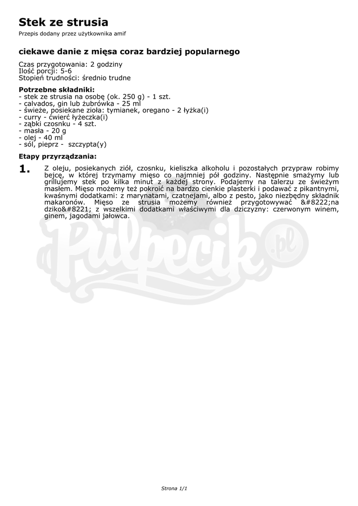 Stek ze strusia Przepis dodany przez użytkownika amif ciekawe danie z mięsa coraz bardziej popularnego Czas przygotowania: 2 godziny Ilość porcji: 5-6 Stopień trudności: średnio trudne Potrzebne składniki: - stek ze strusia na osobę (ok. 250 g) - 1 szt. - calvados, gin lub żubrówka - 25 ml - świeże, posiekane zioła: tymianek, oregano - 2 łyżka(i) - curry - ćwierć łyżeczka(i) - ząbki czosnku - 4 szt. - masła - 20 g - olej - 40 ml - sól, pieprz - szczypta(y) Etapy przyrządzania: 1. Z oleju, posiekanych ziół, czosnku, kieliszka alkoholu i pozostałych przypraw robimy bejcę, w której trzymamy mięso co najmniej pół godziny. Następnie smażymy lub grillujemy stek po kilka minut z każdej strony. Podajemy na talerzu ze świeżym masłem. Mięso możemy też pokroić na bardzo cienkie plasterki i podawać z pikantnymi, kwaśnymi dodatkami: z marynatami, czatnejami, albo z pesto, jako niezbędny składnik makaronów. Mięso ze strusia możemy również przygotowywać „na dziko” z wszelkimi dodatkami właściwymi dla dziczyzny: czerwonym winem, ginem, jagodami jałowca. Strona 1/1