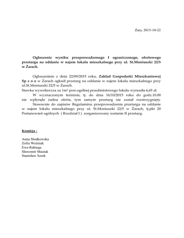 Żary, 2015-10-22 Ogłoszenie wyniku przeprowadzonego I ograniczonego, ofertowego przetargu na oddanie w najem lokalu mieszkalnego przy ul. St.Moniuszki 22/5 w Żarach. Ogłoszeniem z dnia 22/09/2015 roku, Zakład Gospodarki Mieszkaniowej Sp z o o w Żarach ogłosił przetarg na oddanie w najem lokalu mieszkalnego przy ul.St.Moniuszki 22/5 w Żarach. Stawka wywoławcza za 1m² pow.ogólnej przedmiotowego lokalu wynosiła 6,65 zł. W wyznaczonym terminie, tj. do dnia 16/10/2015 roku do godz.10.00 nie wpłynęła żadna oferta, tym samym przetarg nie został rozstrzygnięty. Stosownie do zapisów Regulaminu przeprowadzenia przetargu na oddanie w najem lokalu mieszkalnego przy ul. St.Moniuszki 22/5 w Żarach, tj.pkt 20 Postanowień ogólnych ( Rozdział I ) zorganizowany zostanie II przetarg. Komisja : Anna Słodkowska Zofia Woźniak Ewa Rabiega Sławomir Masiuk Stanisław Szrek