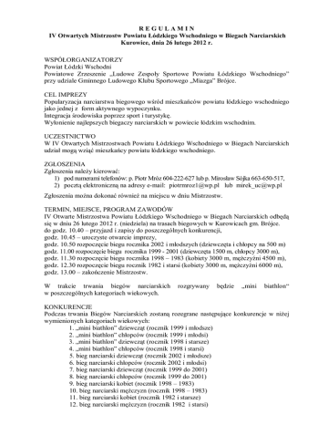REGULAMIN IV Otwartych Mistrzostw Powiatu Łódzkiego Wschodniego w Biegach Narciarskich Kurowice, dnia 26 lutego 2012 r. WSPÓŁORGANIZATORZY Powiat Łódzki Wschodni Powiatowe Zrzeszenie „Ludowe Zespoły Sportowe Powiatu Łódzkiego Wschodniego” przy udziale Gminnego Ludowego Klubu Sportowego „Miazga” Brójce. CEL IMPREZY Popularyzacja narciarstwa biegowego wśród mieszkańców powiatu łódzkiego wschodniego jako jednej z form aktywnego wypoczynku. Integracja środowiska poprzez sport i turystykę. Wyłonienie najlepszych biegaczy narciarskich w powiecie łódzkim wschodnim. UCZESTNICTWO W IV Otwartych Mistrzostwach Powiatu Łódzkiego Wschodniego w Biegach Narciarskich udział mogą wziąć mieszkańcy powiatu łódzkiego wschodniego. ZGŁOSZENIA Zgłoszenia należy kierować: 1) pod numerami telefonów: p. Piotr Mróz 604-222-627 lub p. Mirosław Sójka 663-650-517, 2) pocztą elektroniczną na adresy e-mail: [email protected] lub [email protected] Zgłoszenia można dokonać również na miejscu w dniu Mistrzostw. TERMIN, MIEJSCE, PROGRAM ZAWODÓW IV Otwarte Mistrzostwa Powiatu Łódzkiego Wschodniego w Biegach Narciarskich odbędą się w dniu 26 lutego 2012 r. (niedziela) na trasach biegowych w Kurowicach gm. Brójce. do godz. 10.40 – przyjazd i zapisy do poszczególnych konkurencji, godz. 10.45 – uroczyste otwarcie imprezy, godz. 10.50 rozpoczęcie biegu rocznika 2002 i młodszych (dziewczęta i chłopcy na 500 m) godz. 11.00 rozpoczęcie biegu rocznika 1999 - 2001 (dziewczęta 1500 m, chłopcy 3000 m), godz. 11.30 rozpoczęcie biegu rocznika 1998 – 1983 (kobiety 3000 m, mężczyźni 4500 m), godz. 12.30 rozpoczęcie biegu rocznik 1982 i starsi (kobiety 3000 m, mężczyźni 6000 m), godz. 13.00 – zakończenie Mistrzostw. W trakcie trwania biegów narciarskich w poszczególnych kategoriach wiekowych. rozgrywany będzie „mini biathlon“ KONKURENCJE Podczas trwania Biegów Narciarskich zostaną rozegrane następujące konkurencje w niżej wymienionych kategoriach wiekowych: 1. „mini biathlon” dziewcząt (rocznik 1999 i młodsze) 2. „mini biathlon” chłopców (rocznik 1999 i młodsi) 3. „mini biathlon” dziewcząt (rocznik 1998 i starsze) 4. „mini biathlon” chłopców (rocznik 1998 i starsi) 5. bieg narciarski dziewcząt (rocznik 2002 i młodsze) 6. bieg narciarski chłopców (rocznik 2002 i młodsi) 7. bieg narciarski dziewcząt (rocznik 1999 do 2001) 8. bieg narciarski chłopców (rocznik 1999 do 2001) 9. bieg narciarski kobiet (rocznik 1998 – 1983) 10. bieg narciarski mężczyzn (rocznik 1998 – 1983) 11. bieg narciarski kobiet (rocznik 1982 i starsze) 12. bieg narciarski mężczyzn (rocznik 1982 i starsi) SPOSÓB PRZEPROWADZENIA KONKURENCJI BIEGÓW NARCIARSKICH Sposób przeprowadzenia poszczególnych konkurencji IV Otwartych Mistrzostwach Powiatu Łódzkiego Wschodniego w Biegach Narciarskich zostanie ustalony przez współorganizatora – Powiatowe Zrzeszenie „Ludowe Zespoły Sportowe Powiatu Łódzkiego Wschodniego” po zakończeniu przyjmowania zgłoszeń. ZASADY FINANSOWANIA ORAZ ŚWIADCZENIA WSPÓŁORGANIZATORÓW 1) Koszty organizacyjne IV Otwartych Mistrzostwach Powiatu Łódzkiego Wschodniego w Biegach Narciarskich w tym: przygotowanie tras biegowych, zakup medali i dyplomów dla uczestników, którzy w poszczególnych kategoriach zajmą I, II i III miejsce, sędziowie, opieka przedmedyczna, napoje i ciepły posiłek dla uczestników Mistrzostw – zapewniają współorganizatorzy. 2) Za ubezpieczenie NNW, przyjazd, odjazd i pobyt na Mistrzostwach uczestnicy odpowiadają indywidualnie, a w przypadku dzieci i młodzieży niepełnoletniej odpowiadają opiekunowie. NAGRODY Medale i dyplomy za zajęcie I, II i III miejsca w poszczególnych kategoriach wiekowych. POSTANOWIENIA KOŃCOWE Współorganizatorzy nie ponoszą odpowiedzialności za rzeczy zagubione lub pozostawione przez uczestników podczas trwania Mistrzostw. Wszystkie sprawy sporne oraz nie ujęte w niniejszym regulaminie rozstrzyga współorganizator – Powiatowe Zrzeszenie „Ludowe Zespoły Sportowe Powiatu Łódzkiego Wschodniego” i sędzia główny Biegów Narciarskich. Interpretacja niniejszego regulaminu należy do współorganizatorów.
