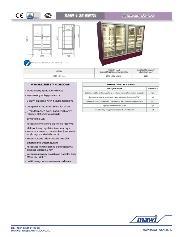 SMR 1.25 BETA O C ZAKRES TEMPERATUR OD - 15 °C DO -18 °C MODEL WYMIARY [mm] (DŁUGOŚĆ,SZEROKOŚĆ, WYSOKOŚĆ) POJEMNOŚĆ KOMORY UŻYTKOWEJ [dm3] SMR 1.25 beta 1250 x 780 x 2050 1110 WYPOSAŻENIE STANDARDOWE • wbudowany agregat mroźniczy • wymuszony obieg powietrza • 2 drzwi przeszklonych z szybą zespoloną • podgrzewana szyba i ościeżnica drzwi • SZAFA MROŹNICZA 8 regulowanych półek siatkowych o wymiarach 600 x 507 mm każda WYPOSAŻENIE OPCJONALNE DOSTĘPNA OPCJA JEDNOSTKA dodatkowa półka siatkowa, stalowa, w kolorze białym z kompletem zaczepów kpl korpus zewnętrzny - możliwość wyboru koloru z dostępnych RAL* szt plafoniera górna podświetlana z możliwością wyboru koloru z dostępnych* mb agregat montowany na górze kpl nakładka na półkę perforowana ze stali nierdzewnej szt • oświetlenie LED • korpus wewnętrzny z blachy nierdzewnej elektroniczny regulator temperatury z • automatycznym rozmrażaniem (termostat z cyfrowym wyświetlaczem) • automatyczne odparowanie skroplin • odszranianie automatyczne • korpus izolowany pianką poliuretanową grubość izolacji 60 mm • korpus malowany proszkowo na kolor biały Mawi RAL 9003* • nóżki do wypoziomowania urządzenia tel: +48 (14) 611 61 06-08 [email protected] WWW.MAWI-POLAND.PL SMR 1.25 BETA O C FREEZING CABINET TEMPERATURE RANGE FROM - 15 °C TO -18 °C MODEL DIMENSIONS [mm] (LxWxH) CAPACITY OF THE CHAMBER [dm3] SMR 1.25 beta 1250 x 780 x 2050 1110 STANDARD EQUIPMENT • refrigeration unit built-in • forced cooling • 2 glass door • heated door frame and glass • 8 x netting shelves 600 x 507 mm ADDITIONAL EQUIPMENT OPTIONS UNIT additional netting shelf with supports set device body powder coated according to RAL * pcs. top troffer fixture with lighting - available colours* metre unit mounted on top metre stainless steel perforated overlay for wire shelf pcs. • LED light • stainless steel interior • thermostat with auto defrost • automatic evaporation of condensate • polyurethane foam insulated body thickness of insulation 60 mm • Mawi RAL 9003* color powder coated body • adjustable levelling legs tel: +48 (14) 611 61 06-08 [email protected] WWW.MAWI-POLAND.PL