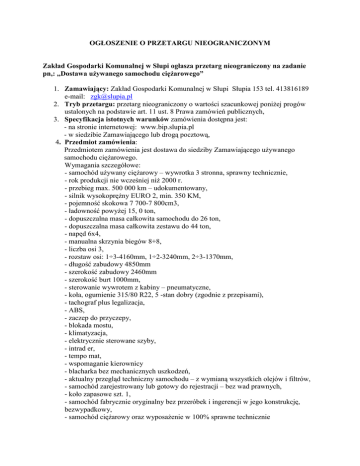 OGŁOSZENIE O PRZETARGU NIEOGRANICZONYM Zakład Gospodarki Komunalnej w Słupi ogłasza przetarg nieograniczony na zadanie pn,: ,,Dostawa uŜywanego samochodu cięŜarowego” 1. Zamawiający: Zakład Gospodarki Komunalnej w Słupi Słupia 153 tel. 413816189 e-mail: [email protected] 2. Tryb przetargu: przetarg nieograniczony o wartości szacunkowej poniŜej progów ustalonych na podstawie art. 11 ust. 8 Prawa zamówień publicznych, 3. Specyfikacja istotnych warunków zamówienia dostępna jest: - na stronie internetowej: www.bip.slupia.pl - w siedzibie Zamawiającego lub drogą pocztową, 4. Przedmiot zamówienia: Przedmiotem zamówienia jest dostawa do siedziby Zamawiającego uŜywanego samochodu cięŜarowego. Wymagania szczegółowe: - samochód uŜywany cięŜarowy – wywrotka 3 stronna, sprawny technicznie, - rok produkcji nie wcześniej niŜ 2000 r. - przebieg max. 500 000 km – udokumentowany, - silnik wysokopręŜny EURO 2, min. 350 KM, - pojemność skokowa 7 700-7 800cm3, - ładowność powyŜej 15, 0 ton, - dopuszczalna masa całkowita samochodu do 26 ton, - dopuszczalna masa całkowita zestawu do 44 ton, - napęd 6x4, - manualna skrzynia biegów 8+8, - liczba osi 3, - rozstaw osi: 1÷3-4160mm, 1÷2-3240mm, 2÷3-1370mm, - długość zabudowy 4850mm - szerokość zabudowy 2460mm - szerokość burt 1000mm, - sterowanie wywrotem z kabiny – pneumatyczne, - koła, ogumienie 315/80 R22, 5 -stan dobry (zgodnie z przepisami), - tachograf plus legalizacja, - ABS, - zaczep do przyczepy, - blokada mostu, - klimatyzacja, - elektrycznie sterowane szyby, - intrad er, - tempo mat, - wspomaganie kierownicy - blacharka bez mechanicznych uszkodzeń, - aktualny przegląd techniczny samochodu – z wymianą wszystkich olejów i filtrów, - samochód zarejestrowany lub gotowy do rejestracji – bez wad prawnych, - koło zapasowe szt. 1, - samochód fabrycznie oryginalny bez przeróbek i ingerencji w jego konstrukcję, bezwypadkowy, - samochód cięŜarowy oraz wyposaŜenie w 100% sprawne technicznie 5. 6. 7. 8. 9. Wspólny słownik zamówień; CPV 34142300-7 – pojazdy samowyładowcze . Zamawiający nie dopuszcza moŜliwości składania ofert częściowych. Zamawiający nie dopuszcza moŜliwości składania oferty wariantowej. Termin wykonania zamówienia: do 7 dni od daty podpisania umowy. Opis wariantów udziału w postępowaniu oraz sposobu dokonywania oceny tych warunków. Do udziału w postępowaniu dopuszczeni będą wyłącznie Wykonawcy, którzy złoŜą waŜną ofertę ze wszystkimi załącznikami wymienionymi w specyfikacji istotnych warunków zamówienia oraz spełnią wszystkie wymagane przez ustawę prawo zamówień publicznych warunki tj; 1. Nie podlegają wykluczeniu na podstawie art.24 ust.1 i 2 ustawy pzp, 2. Spełniają warunki określone w art.22 ust.1 ustawy pzp, 3. PrzedłoŜą aktualny odpis właściwego rejestru albo aktualne zaświadczenie o wpisie do ewidencji działalności gospodarczej, jeŜeli odrębne przepisy wymagają wpisu do rejestru lub zgłoszenia do ewidencji działalności gospodarczej, wystawionego nie wcześniej niŜ 6 miesięcy przed upływem okresu składania ofert, 4. Warunkiem udziału w postępowaniu jest złoŜenie oferty z wymaganymi załącznikami w wyznaczonym przez Zamawiającego terminie. 5. Ocena spełnienia warunków udziału w postępowaniu dokonana zostanie na podstawie przedłoŜonych dokumentów, zaświadczeń wymaganych w specyfikacji istotnych warunków zamówienia. 10. Wadium. nie jest wymagane 11. Kryteria oceny oferty i ich znaczenie: - cena- 80% - przebieg – 10% - wiek pojazdu – 10% 12. Oferty naleŜy składać w siedzibie Zamawiającego, w terminie do dnia 27.04.2010 r. do godz . 10.00. 13. Otwarcie ofert nastąpi w dniu 27.04.2010 r. godz. 11.00 w siedzibie Zamawiającego. 14. Termin związania ofertą: do czasu zawarcia umowy z wybranym Wykonawcą, lecz nie dłuŜej niŜ 30 dni. 15. Zamawiający nie zamierza zawierać umowy ramowej. 16. Zamawiający nie zamierza ustanowić dynamicznego systemu zakupów. 17. Zamawiający nie zamierza zastosować aukcji elektronicznej. 18. Zamawiający nie przewiduje udzielenia zamówienia z art.67. Słupia, dnia 16-04-2010 r. Kierownik ZGK Sławomir Stachura