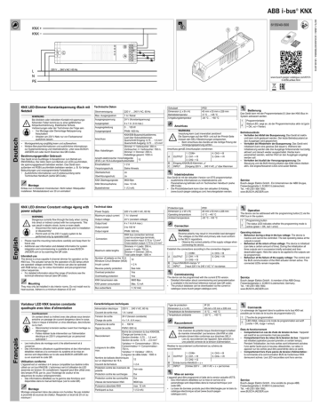 Pos: 2 /Faltblatt 35x42/00_FB-Kopf/FB-Köpfe in Anleitungen/6155/40 @ 44\mod_1443519714632_0.docx @ 395078 @ @ 1 www.busch-jaeger-catalogue.com/61510-0256,artikel.html === Ende der Liste für Textmarke Titel === Pos: 4 /Faltblatt 35x42/KNX/Installationsbus/6155/6155/40 @ 44\mod_1442504190004_1.docx @ 378992 @ 12222222 @ 1 Deutsch KNX LED-Dimmer Konstantspannung 4fach mit Netzteil WARNUNG Bei direktem oder indirektem Kontakt mit spannungsführenden Teilen kommt es zu einer gefährlichen Körperdurchströmung. Elektrischer Schock, Verbrennungen oder der Tod können die Folge sein. – Vor Montage oder Demontage Netzspannung freischalten! – Arbeiten am 230 V-Netz nur von Fachpersonal ausführen lassen. ■ ■ Montageanleitung sorgfältig lesen und aufbewahren. Weitere Benutzerinformationen und ausführliche Informationen zur Systemeinbindung und Inbetriebnahme unter www.BUSCHJAEGER.com oder durch Scannen des QR-Codes. Bestimmungsgemäßer Gebrauch Das Gerät ist ein busfähiger 4-Kanaldimmer zum Betrieb am KNX/EIB-Bus. Der Aktor dient zum Betrieb von LED-Leuchtmitteln, die spannungsgesteuert betrieben werden. Das Gerät kann außerdem mit RGB-Leuchtmitteln betrieben werden, z. B. für farbige Beleuchtungen und vorprogrammierte Farbabläufe. ■ Ausführliche Informationen zum Funktionsumfang siehe Technisches Handbuch (siehe QR-Code). Montage Einbau nur in trockenen Innenräumen. Nicht neben Hitzequellen installieren. Mindestabstand von 20 cm einhalten! Technische Daten Stromversorgung 220 V … 240 V AC, 60 Hz Max. Ausgangsstrom 1 A / Kanal Ausgangsspannung 24 V (Konstantspannung) Ausgangslast 4 x 1 A (4 A max.) Ausgangsleistung 0 … 100 W PWM / 600 Hz KNX/EIB-Busanschlussklemme, Last über Schraubklemmen, Anschluss Querschnitt Eingang: 0,75 … 1,5 mm2, Querschnitt Ausgang: 0,75 … 2,5 mm2 Dimmer <> Verbraucher: 350 m, Verbraucher <> Verbraucher: 700 m, Max. Kabellängen Dimmer <> Dimmer: 200 m, Kabellänge gesamt: 1000 m Anzahl elektronischer Vorschaltgeräte 12 (EVG ) an 16 A-Leitungsschutzschalter Einschaltstrom <2A Schutzart Dimension (L x B x H) Betriebstemperatur Umgebungstemperatur WARNUNG Verpolung kann Last irreversibel zerstören! Die Spannungen auf der KNX- und auf der Primär-Seite müssen den SELV-Bestimmungen entsprechen. – Beim Anschluss des Geräts auf die richtige Polung der Versorgungsspannung achten. Siehe Hinweis Überlastschutz Ja Überhitzungsschutz Ja KNX Übertragungsrate 9600 Bps KNX Stromaufnahme max. 12 mA Busteilnehmer 1 (12 mA) Anschluss gemäß Anschlussplan vornehmen: A B C Bedienung Das Gerät kann mit der Programmiertaste [1] über den KNX-Bus im System adressiert werden. 1 2 Anschluss Ausgangssignal Verpolungsschutz IP20 45 mm x 53 mm x 226 mm -5 °C … +45 °C -20 °C … +50 °C 1. COM+ 4. CH3- = B 2. CH1- = R 5. CH4- = W 3. CH2- = G Eingang KNX/BUS-Klemmen „±“ INPUT Eingang 220 V … 240 V AC „±“ über Klemmen OUTPUT Programmiertaste Status-LED, zeigt an, ob der Programmiermodus aktiv ist (grün = OK, rot = Fehler) Betriebszustände ■ Verhalten bei Abfall der Busspannung: Das Gerät ist inaktiv und kann nicht gesteuert werden. Der letzte Betriebszustand an den Ausgängen wird gespeichert. ■ Verhalten bei Wiederkehr der Busspannung: Das Gerät wird initialisiert (kann eine gewisse Zeit dauern). Während der Initialisierung werden alle drei Ausgänge hintereinander kurzzeitig aktiviert und danach wieder ausgeschaltet. Hierbei kann parametriert werden, welcher Wert an den Ausgängen angelegt werden soll. ■ Verhalten bei Ausfall der Versorgungsspannung: Die Steuerung und die BUS-Kommunikation des KNX-Aktors bleiben aktiv. Die angeschlossenen LEDs sind außer Betrieb. Inbetriebnahme Das Gerät ist mit der aktuellen Version von ETS programmierbar. ■ Ausführliche Informationen zu Inbetriebnahme und Parametrierung befinden sich im Technischen Handbuch (siehe QR-Code). ■ Die Produktdatenbank kann über den aktuellen E-Katalog (www.busch-jaeger-catalogue.com) heruntergeladen werden. Service Busch-Jaeger Elektro GmbH - Ein Unternehmen der ABB Gruppe, Freisenbergstraße 2, D-58513 Lüdenscheid, Tel.: +49 2351 956-1600; www.BUSCH-JAEGER.com Pos: 5 /Faltblatt 35x42/KNX/Installationsbus/6155/6155/40 @ 44\mod_1442504190004_15.docx @ 378993 @ 12222222 @ 1 English KNX LED dimmer Constant voltage 4gang with power adaptor WARNING Dangerous currents flow through the body when coming into direct or indirect contact with live components. This can result in electric shock, burns or even death. – Disconnect the mains power supply prior to installation or disassembly! – Permit work on the 230 V supply system to be performed only by specialist staff. ■ ■ Please read the mounting instructions carefully and keep them for future use. Additional user information and detailed information for system integration and commissioning is available at www.BUSCHJAEGER.com or by scanning the QR code. Intended use The device is a bus-capable 4-channel dimmer for operation on the KNX bus. The actuator serves for the operation of LED lamps which are operated voltage-controlled. The device can also be operated with RGB lamps, e.g. for colour illumination and pre-programmed colour sequences. ■ For detailed information about the range of functions see the technical reference manual (see QR code). Mounting They may only be installed in dry interior rooms. Do not install next to heat sources. Adhere to a minimum distance of 20 cm! Technical data Power Supply 220 V to 240 V AC, 60 Hz Maximum output current 1 A / channel Output voltage 24 V (constant voltage) Output load 4 x 1 A (4 A max.) Output power 0 to 100 W PWM / 600 Hz KNX bus connection terminal, Load via screw-type terminals, Connection Cross-section input: 0.75 to 1.5 mm2, Cross-section output: 0.75 to 2.5 mm2 Dimmers <> Loads: 350 m, Loads <> Loads: 700 m, Maximum cable lengths Dimmer <> Dimmer: 200 m, Total cable length: 1000 m Number of ballasts on the 16 A 12 Miniature Circuit Breaker (MCB) Inrush cur