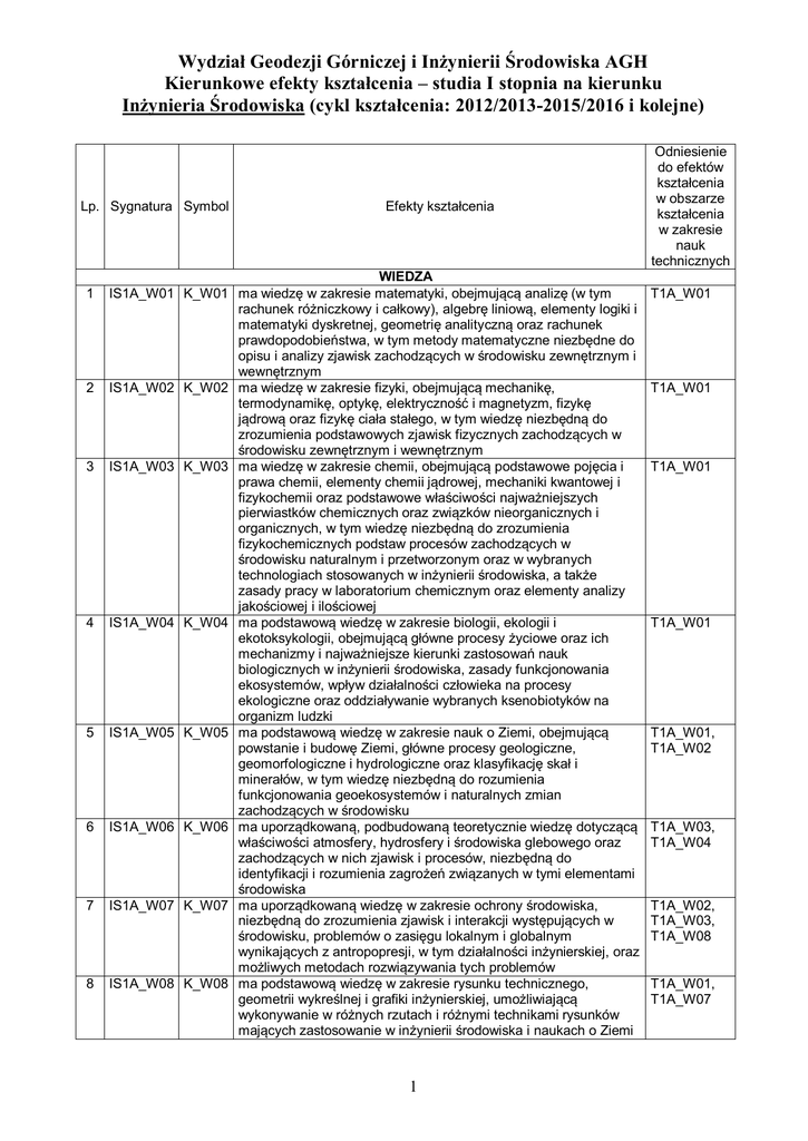 Wydział Geodezji Górniczej i Inżynierii Środowiska AGH Kierunkowe efekty kształcenia – studia I stopnia na kierunku Inżynieria Środowiska (cykl kształcenia: 2012/2013-2015/2016 i kolejne) Lp. Sygnatura Symbol 1 2 3 4 5 6 7 8 Efekty kształcenia WIEDZA IS1A_W01 K_W01 ma wiedzę w zakresie matematyki, obejmującą analizę (w tym rachunek różniczkowy i całkowy), algebrę liniową, elementy logiki i matematyki dyskretnej, geometrię analityczną oraz rachunek prawdopodobieństwa, w tym metody matematyczne niezbędne do opisu i analizy zjawisk zachodzących w środowisku zewnętrznym i wewnętrznym IS1A_W02 K_W02 ma wiedzę w zakresie fizyki, obejmującą mechanikę, termodynamikę, optykę, elektryczność i magnetyzm, fizykę jądrową oraz fizykę ciała stałego, w tym wiedzę niezbędną do zrozumienia podstawowych zjawisk fizycznych zachodzących w środowisku zewnętrznym i wewnętrznym IS1A_W03 K_W03 ma wiedzę w zakresie chemii, obejmującą podstawowe pojęcia i prawa chemii, elementy chemii jądrowej, mechaniki kwantowej i fizykochemii oraz podstawowe właściwości najważniejszych pierwiastków chemicznych oraz związków nieorganicznych i organicznych, w tym wiedzę niezbędną do zrozumienia fizykochemicznych podstaw procesów zachodzących w środowisku naturalnym i przetworzonym oraz w wybranych technologiach stosowanych w inżynierii środowiska, a także zasady pracy w laboratorium chemicznym oraz elementy analizy jakościowej i ilościowej IS1A_W04 K_W04 ma podstawową wiedzę w zakresie biologii, ekologii i ekotoksykologii, obejmującą główne procesy życiowe oraz ich mechanizmy i najważniejsze kierunki zastosowań nauk biologicznych w inżynierii środowiska, zasady funkcjonowania ekosystemów, wpływ działalności człowieka na procesy ekologiczne oraz oddziaływanie wybranych ksenobiotyków na organizm ludzki IS1A_W05 K_W05 ma podstawową wiedzę w zakresie nauk o Ziemi, obejmującą powstanie i budowę Ziemi, główne procesy geologiczne, geomorfologiczne i hydrologiczne oraz klasyfikację skał i minerałów, w tym wiedzę niezbędną do rozumienia funkcjonowania geoekosystemów i naturalnych zmian zachodzących w środowisku IS1A_W06 K_W06 ma uporządkowaną, podbudowaną teoretycznie wiedzę dotyczącą właściwości atmosfery, hydrosfery i środowiska glebowego oraz zachodzących w nich zjawisk i procesów, niezbędną do identyfikacji i rozumienia zagrożeń związanych w tymi elementami środowiska IS1A_W07 K_W07 ma uporządkowaną wiedzę w zakresie ochrony środowiska, niezbędną do zrozumienia zjawisk i interakcji występujących w środowisku, problemów o zasięgu lokalnym i globalnym wynikających z antropopresji, w tym działalności inżynierskiej, oraz możliwych metodach rozwiązywania tych problemów IS1A_W08 K_W08 ma podstawową wiedzę w zakresie rysunku technicznego, geometrii wykreślnej i grafiki inżynierskiej, umożliwiającą wykonywanie w różnych rzutach i różnymi technikami rysunków mających zastosowanie w inżynierii środowiska i naukach o Ziemi 1 Odniesienie do efektów kształcenia w obszarze kształcenia w zakresie nauk technicznych T1A_W01 T1A_W01 T1A_W01 T1A_W01 T1A_W01, T1A_W02 T1A_W03, T1A_W04 T1A_W02, T1A_W03, T1A_W08 T1A_W01, T1A_W07 9 10 11 12 13 14 15 16 17 18 19 IS1A_W09 K_W09 ma podstawową wiedzę w zakresie budowy i użytkowania sprzętu komputerowego, programowania aplikacji i posługiwania się komputerem do wprowadzania, gromadzenia i analizy informacji, w tym informacji o charakterze przestrzennym oraz wykonywania obliczeń inżynierskich, projektowania i wizualizacji wybranych rozwiązań inżynierskich za pomocą technik informatycznych; zna techniczne aspekty użytkowania sieci Internet oraz rodzaje i przeznaczenie edytorów tekstów, arkuszy kalkulacyjnych, baz danych i wyspecjalizowanych programów obliczeniowych i prezentacyjnych IS1A_W10 K_W10 ma podstawową wiedzę z zakresu geodezji i kartografii oraz systemów informacji przestrzennej, zna wybrane możliwości wykorzystania tej wiedzy w pozyskiwaniu, analizie i przedstawianiu danych o środowisku naturalnym i antropogenicznym IS1A_W11 K_W11 ma podstawową wiedzę w zakresie materiałów stosowanych w inżynierii środowiska oraz mechaniki i wytrzymałości materiałów, niezbędną do projektowania i wykonawstwa obiektów i instalacji budowlanych, a także wiedzę na temat wzajemnych oddziaływań środowiska i materiału oraz zużycia technicznego urządzeń, obiektów i systemów technicznych IS1A_W12 K_W12 ma uporządkowaną, podbudowaną teoretycznie wiedzę z mechaniki płynów, umożliwiającą rozumienie zjawisk i praw rządzących przepływem płynów oraz ocenę funkcjonowania i projektowanie wybranych urządzeń inżynierii środowiska IS1A_W13 K_W13 ma uporządkowaną, podbudowaną teoretycznie wiedzę z zakresu termodynamiki technicznej, obejmującą prawa oraz procesy dotyczące przekazywania energii, spalania i przemian termodynamicznych, niezbędną do rozumienia i rozwiązywania problemów techniki cieplnej, miernictwa przemysłowego, inżynierii procesowej oraz inżynierii ochrony powietrza IS1A_W14 K_W14 ma elementarną wiedzę w zakresie budownictwa, obejmującą rozwiązania konstrukcyjne, wykończeniowe oraz instalacje stosowane w budynkach, a także podstawowe warunki techniczne ich projektowania i budowy IS1A_W15 K_W15 ma uporządkowaną, podbudowaną teoretycznie wiedzę z zakresu ogrzewnictwa, wentylacji i klimatyzacji obiektów budowlanych o charakterze mieszkalnym i usługowym, w tym wiedzę umożliwiającą określenie parametrów technicznych oraz ocenę ekonomicznych, energetycznych i ekologicznych efektów pracy danej instalacji IS1A_W16 K_W16 zna wybrane rodzaje budowli i obiektów inżynierskich oraz wymogi, jakie muszą spełniać; zna i rozumie zasady ich projektowania i wykonawstwa IS1A_W17 K_W17 ma wiedzę pozwalającą na dobór właściwych metod pomiarowych stosowanych w miernictwie przemysłowy