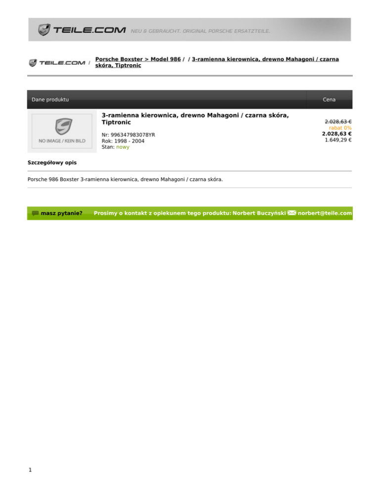 Porsche Boxster > Model 986 / / 3-ramienna kierownica, drewno Mahagoni / czarna skóra, Tiptronic Dane produktu Cena 3-ramienna kierownica, drewno Mahagoni / czarna skóra, Tiptronic Nr: 996347983078YR Rok: 1998 - 2004 Stan: nowy 2.028,63 € rabat 0% 2.028,63 € 1.649,29 € Szczegółowy opis Porsche 986 Boxster 3-ramienna kierownica, drewno Mahagoni / czarna skóra. masz pytanie? 1 Prosimy o kontakt z opiekunem tego produktu: Norbert Buczyński [email protected]
