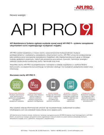 Nowa wersja: API Maintenance Systems ogłasza wydanie nowej wersji API PRO 9 – systemu zarządzania utrzymaniem ruchu wspierającego wydajność majątku. API PRO został rozszerzony o nowe cechy i zaawansowane funkcjonalności służące profesjonalnemu i wydajnemu zarządzaniu utrzymaniem ruchu. API PRO umacnia swoją pozycję jako preferowane rozwiązanie zarządzania majątkiem dla międzynarodowych grup w różnego rodzaju gałęziach przemysłu, takich jak produkcja procesowa, żywność, farmacja, energia i zakłady użyteczności publicznej, porty i terminale oraz inne. Wszystkie cechy API PRO są projektowane i rozwijane w bliskiej współpracy z użytkownikami końcowymi, co zapewnia koncentrację na łatwości obsługi i na wydajnym przepływie zadań oraz informacji. Kluczowe cechy API PRO 9: Planowanie Wizualne Wieloodziałowość Moduł Mobile Analytics + raporty Integracja z ERP Wydajne planowanie prac serwisowych z graficznym przeglądem obciążenia i dostępnych zasobów Obsługa wielu fabryk w różnych krajach z różnymi walutami, strefami czasowymi, językami i konfiguracją. Dostęp do informacji, możliwość rejestracji prac w trybie on/offline przy pomocy smartfona. Elastyczne i przyjazne narzędzie analityczne oparte o QlikView do wspierania usprawnień. Elastyczne narzędzia do integracji z ERP i zbierania danych z maszyn lub urządzeń pomiarowych. Aby uzyskać więcej informacji lub umówić się na prezentację, wyślij email na adres: [email protected] lub odwiedź naszą stronę www.apipro.com. API Maintenance Systems rozwija, dostarcza i serwisuje oprogramowanie API PRO Enterprise Asset Management („API PRO EAM”). Za pomocą naszego oprogramowania organizacje z różnych branż na całym świecie zarządzają istotnymi składnikami majątku (m.in. obiektami, maszynami i urządzeniami). API Polska · Puławska 38· 05-500 Piaseczno · Telefon +48 882 664 872 · E-mail: [email protected]