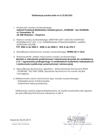 Deklaracja producenta nr 6/12/SK/SOL 1. Producent wyrobu budowlanego: Zakład Produkcji Materiałów Instalacyjnych „GORGIEL” Jan GORGIEL ul. Poznańska 10 64-200 Wolsztyn – Karpicko. 2. Nazwa wyrobu budowlanego: SKRZYNKI SGP i SGN DO MONTAŻU ROZDZIELACZY DO C.O i OGRZEWANIA PODŁOGOWEGO, MARKA DOMOWA SOLTER. TYP: SNN-A do SNN-F, SNW-A do SNW-F, SPU-A do SPU-F 3. Klasyfikacja statystyczna wyrobu budowlanego: PKWiU 25.11.23.0 4. Przeznaczenie i zakres stosowania wyrobu budowlanego: Montaż w zabudowie podtynkowej i natynkowej skrzynek do rozdzielaczy C.O. i ogrzewania podłogowego w sanitariatach budynków mieszkalnych i użyteczności publicznej, przemysłowej i rekreacyjnej. 5. Specyfikacja techniczna: zgodnie z dokumentacją techniczną ZPMI „GORGIEL” ISO 9001:2008, Aprobata techniczna na wyrób nie jest wymagana. 6. Deklarowane cechy techniczne typu wyrobu budowlanego: - Zabezpieczone antykorozyjnie, - Malowane farbą proszkową. Deklarację z pełną odpowiedzialnością, że wyrób budowlany jest zgodny ze specyfikacją techniczną wskazaną w pkt 5. Karpicko 06.05.2012 …….……………… Janusz Smoleń …………………………………… (miejsce i data wystawienia) (imię, nazwisko i podpis osoby upoważnionej)