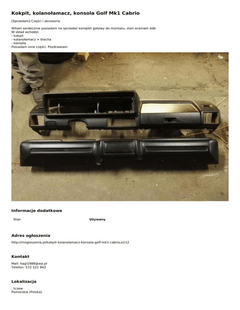 Kokpit, kolanołamacz, konsola Golf Mk1 Cabrio [Sprzedam] Części i akcesoria Witam serdecznie posiadam na sprzedaż komplet gotowy do montażu, stan oceniam bdb W skład wchodzi: - kokpit - kolanołamacz + blacha - konsola Posiadam inne części. Pozdrawiam Informacje dodatkowe Stan Używany Adres ogłoszenia http://mogloszenia.pl/kokpit-kolanolamacz-konsola-golf-mk1-cabrio,o112 Kontakt Mail: [email protected] Telefon: 572 521 942 Lokalizacja , tczew Pomorskie (Polska) Ogłoszenie dodano: 2016-12-13 15:10:20 Ogłoszenie wygasa: 2017-02-11 15:10:20 Powered by TCPDF (www.tcpdf.org)