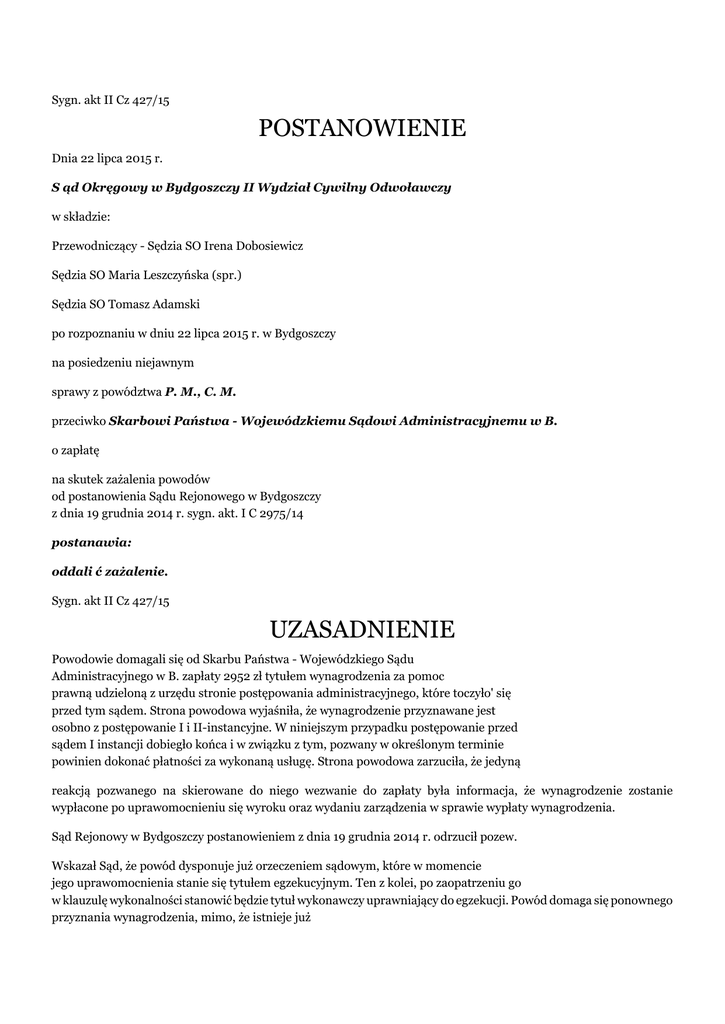 Sygn. akt II Cz 427/15 POSTANOWIENIE Dnia 22 lipca 2015 r. S ąd Okręgowy w Bydgoszczy II Wydział Cywilny Odwoławczy w składzie: Przewodniczący - Sędzia SO Irena Dobosiewicz Sędzia SO Maria Leszczyńska (spr.) Sędzia SO Tomasz Adamski po rozpoznaniu w dniu 22 lipca 2015 r. w Bydgoszczy na posiedzeniu niejawnym sprawy z powództwa P. M., C. M. przeciwko Skarbowi Państwa - Wojewódzkiemu Sądowi Administracyjnemu w B. o zapłatę na skutek zażalenia powodów od postanowienia Sądu Rejonowego w Bydgoszczy z dnia 19 grudnia 2014 r. sygn. akt. I C 2975/14 postanawia: oddali ć zażalenie. Sygn. akt II Cz 427/15 UZASADNIENIE Powodowie domagali się od Skarbu Państwa - Wojewódzkiego Sądu Administracyjnego w B. zapłaty 2952 zł tytułem wynagrodzenia za pomoc prawną udzieloną z urzędu stronie postępowania administracyjnego, które toczyło' się przed tym sądem. Strona powodowa wyjaśniła, że wynagrodzenie przyznawane jest osobno z postępowanie I i II-instancyjne. W niniejszym przypadku postępowanie przed sądem I instancji dobiegło końca i w związku z tym, pozwany w określonym terminie powinien dokonać płatności za wykonaną usługę. Strona powodowa zarzuciła, że jedyną reakcją pozwanego na skierowane do niego wezwanie do zapłaty była informacja, że wynagrodzenie zostanie wypłacone po uprawomocnieniu się wyroku oraz wydaniu zarządzenia w sprawie wypłaty wynagrodzenia. Sąd Rejonowy w Bydgoszczy postanowieniem z dnia 19 grudnia 2014 r. odrzucił pozew. Wskazał Sąd, że powód dysponuje już orzeczeniem sądowym, które w momencie jego uprawomocnienia stanie się tytułem egzekucyjnym. Ten z kolei, po zaopatrzeniu go w klauzulę wykonalności stanowić będzie tytuł wykonawczy uprawniający do egzekucji. Powód domaga się ponownego przyznania wynagrodzenia, mimo, że istnieje już i nieprawomocne orzeczenie Wojewódzkiego Sądu Administracyjnego w tym przedmiocie. Zasadą jest, że wynagrodzenie pełnomocnika ustanowionego z urzędu wypłacane jest po uprawomocnieniu się wyroku zawierającego postanowienie w tym przedmiocie, na podstawie tego właśnie orzeczenia. Pozew złożony przez stronę powodową jest zatem niejako obejściem trybu wypłaty wynagrodzenia. Stosownie do art. 209 ustawy z dnia 30 sierpnia 2002 r. Prawo o postępowaniu przed sądami administracyjnymi wniosek strony o zwrot kosztów sąd rozstrzyga w każdym orzeczeniu uwzględniającym skargę oraz w orzeczeniu, o którym mowa w art. 201, art. 203 i art. 204. Nie ma możliwości dochodzenia kosztów postępowania sądowoadministracyjnego przed sądem powszechnym. Należy podkreślić, że sądy powszechne nie dysponują uprawnieniami nadzorczymi nad sądami administracyjnymi, zatem niedopuszczalny jest pozew, którego żądanie zmierza do nakazania sądowi administracyjnemu realizację wydanego przez niego orzeczenia. W myśl art. 199 § 1 pkt 1 k.p.c. Sąd odrzuci pozew, jeśli droga sądowa jest niedopuszczalna. W niniejszej sprawie istnieje nieprawomocne orzeczenie sądu administracyjnego, którego wypłata winna nastąpić w stosownym dla postępowania przed sądami administracyjnymi trybie, ewentualnie w drodze egzekucji wszczętej po uzyskaniu klauzuli wykonalności. Rozstrzygnięcie sprawy, co do istoty nie leży zatem w kognicji sądu cywilnego. Mając na uwadze powyższe orzeczono jak w sentencji. Zażalenie na powyższe postanowienie wnieśli powodowie. Zarzucali naruszenie art. 199 § 1 pkt 1 k.p.c. Domagali się uchylenia zaskarżonego postanowienia. S ąd Okręgowy zważył, co następuje: Zażalenie powodów jako bezzasadne podlegało oddaleniu. Na wstępie wskazać należy, że wbrew twierdzeniom powodów, którzy twierdzili, że w przedmiotowej sprawie domagali się oni jedynie „nakazania zapłaty przyznanych przez WSA i zafakturowanych kosztów nieopłaconej pomocy prawnej, a nie ich ustalenia", z pozwu złożonego w przedmiotowej sprawie wynikało, że powodowie wnieśli o zasądzenie od pozwanego kwoty 2952 zł wraz z odsetkami. Jako dowód w sprawie skarżący przedłożyli fakturę nr (...) za wykonaną usługę, czyli świadczenie pomocy prawnej w postępowaniu administracyjnym. Innymi słowy roszczenie powodów o zapłatę kwoty 2952 zł związane było z sytuacją, w której w postępowaniu sądowoadministracyjnym udzielili oni pomocy stronie jako doradcy podatkowi. Zgodnie z treścią art. 243 ustawy „Prawo o postępowaniu przed sądami administracyjnymi" (Dz.U. Nr 153, poz. 1270, z późn. zm.) w toku postępowania przed sądem administracyjnym stronie na jej wniosek, złożony przed wszczęciem postępowania lub w toku, może być przyznane prawo pomocy. Prawo pomocy obejmuje zwolnienie od kosztów sądowych oraz ustanowienie adwokata, radcy prawnego, doradcy podatkowego lub rzecznika patentowego. Zgodnie z art. 250 wyżej cytowanej ustawy wyznaczony adwokat, radca prawny, doradca podatkowy albo rzecznik patentowy otrzymuje wynagrodzenie odpowiednio według zasad określonych w przepisach o opłatach za czynności adwokatów, radców prawnych, doradców podatkowych albo rzeczników patentowych w zakresie ponoszenia kosztów nieopłaconej pomocy prawnej oraz zwrotu niezbędnych i udokumentowanych wydatków. W przypadku dowodów podatkowych zasady przyznawania wynagrodzenia reguluje Rozporządzenie Ministra Sprawiedliwości z dnia 31 stycznia 2011 r. w sprawie wynagrodzenia za czynności doradcy podatkowego w postępowaniu przed sądami administracyjnymi oraz szczegółowych zasad ponoszenia kosztów pomocy prawnej udzielonej przez doradcę podatkowego z urzędu. Sąd administracyjny bierze przy ustaleniu wysokości tego wynagrodzenia pod uwagę przesłanki wynikające z wyżej cytowanego rozporządzenia. Wynagrodzenie to wypłacane jest z kasy sądu I instancji. Powyższe szczegółowe regulacje dotyczące udzielania prawa pomocy i zasad wypłacania wynagrodzenia doradcom podatkowym w sądowym postępowaniu administracyjnym pozwalają na postawienie j