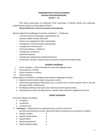 PRZEDMIOTOWY SYSTEM OCENIANIA EDUKACJI WCZESNOSZKOLNEJ (KLASY 1 - 3) PSO został opracowany na podstawie WSO zawartego w Statucie Szkoły oraz podstawy programowej zawartej w rozporządzeniu MEN-u. Ocena śródroczna i roczna ucznia jest oceną opisową. Obszary aktywności podlegające ocenianiu w klasach 1 - 3 obejmują: rozumienie słowa mówionego, wypowiadanie się czytanie, odbiór tekstów literackich pisanie oraz redagowanie zdań i wypowiedzi umiejętności w zakresie języka nowożytnego umiejętności matematyczne treści przyrodniczo – społeczne umiejętności artystyczne sprawność fizyczną umiejętności podstawowej obsługi komputera zachowanie, wartości i postawy etyczne zawarte w podstawie programowej SPOSOBY OCENIANIA I. Ocena werbalna – ukierunkowywanie ucznia do osiągnięcia celu; II. Ocena gestem i mimiką; III. Ocena wyrażona w stopniu; IV. Ocena opisowa; Ocena opisowa w kształceniu zintegrowanym spełnia następujące funkcje: diagnostyczną (na jakim etapie rozwoju jest uczeń); informacyjną (przekazuje informację o tym, co dziecko wie, rozumie, potrafi, mówi o tym jaki jest jego wysiłek i wkład pracy); korekcyjną (wskazuje nad czym jeszcze dziecko powinno popracować); motywacyjną (zachęca do dalszej pracy i wysiłku, daje możliwość osiągnięcia sukcesu); FORMY OCENIANIA Ocenianie odbywać się będzie: na bieżąco na półrocze na koniec roku Na bieżąco – bezpośrednio po wykonanej pracy w formie ustnej lub pisemnej skierowanej do ucznia. Nauczyciel będzie stosować oceny wyrażone w stopniu: Stopień celujący -6 Stopień bardzo dobry -5 Stopień dobry -4 Stopień dostateczny -3 Stopień dopuszczający -2 1 Stopień niedostateczny -1 W ocenianiu bieżącym możliwe jest stosowanie znaku + i – po ocenie. Przy ustalaniu oceny z wychowania fizycznego, techniki, plastyki, muzyki, nauczyciel w szczególności bierze pod uwagę wysiłek i zaangażowanie ucznia. a) Przyjmuje się następujące ogólne kryteria oceniania osiągnięć edukacyjnych: 6 – Uczeń celująco opanował pełen zakres wiadomości i umiejętności określonych programem nauczania. Samodzielnie inicjuje rozwiązania konkretnych problemów w czasie lekcji, jak i w pracy pozalekcyjnej. Aktywnie bierze udział w konkursach szkolnych i pozaszkolnych, wykazuje postawę twórczą lub szczególne umiejętności. 5 – Uczeń bardzo dobrze opanował pełen zakres wiadomości i umiejętności określonych programem nauczania, biegle posługuje się zdobytymi wiadomościami, rozwiązuje samodzielnie problemy teoretycznie i praktyczne, potrafi prawidłowo zastosować posiadaną wiedzę do rozwiązywania zadań i problemów w nowych sytuacjach. 4 – Uczeń dobrze opanował zdecydowaną większość wiadomości i umiejętności określonych programem nauczania, poprawnie rozwiązuje typowe zadania teoretyczne i praktyczne. Korzysta z poznanych w czasie zajęć źródeł informacji, potrafi zastosować zdobytą wiedzę w typowych sytuacjach. 3 – Uczeń wystarczająco i zadowalająco opanował podstawowe wiadomości i umiejętności określone programem nauczania, stara się rozwiązywać typowe zadania teoretyczne lub praktyczne o niewielkim stopniu trudności. Potrafi pod kierunkiem nauczyciela skorzystać z podstawowych informacji. 2 – Uczeń słabo opanował wiadomości i umiejętności określone programem nauczania, nie jest w stanie samodzielnie rozwiązać większości zadań o elementarnym stopniu trudności. Posiada poważne braki w wiedzy, które jednak można nadrobić w dłuższym okresie czasu. 1 – Uczeń nie opanował wiadomości i umiejętności określonych programem nauczania. Nie potrafi rozwiązać prostych zadań i problemów o elementarnym stopniu trudności nawet przy pomocy nauczyciela. Nie wykazuje zaangażowania i chęci do zmiany postawy wobec obowiązków szkolnych. Ocena z religii jest oceną cyfrową w ciągu całego roku szkolnego ze skalą oceniania: celujący, bardzo dobry, dobry, dostateczny, dopuszczający, niedostateczny. Na półrocze – ocena śródroczna przedstawiona opisowo, opublikowana w dzienniku elektronicznym. Na koniec roku – w formie świadectwa szkolnego zawierającego opis stopnia opanowania zrealizowanych treści programowych obowiązujących w danej klasie. a) b) c) d) e) NARZĘDZIA I METODY OCENIANIA Czytanie – sprawdzające technikę czytania. Odpowiedzi ustne – sprawdzające aktualne umiejętności i wiedzę ucznia. Karty pracy – sprawdzające bieżącą wiedzę i umiejętności. Sprawdziany – pisemne sprawdziany wiadomości z większej partii materiału, po dziale programowym, po utrwaleniu. Prace pisemne – sprawdzające umiejętność stosowania poprawnych form wypowiedzi pisemnych. 2 f) g) h) i) Prace domowe – zadania obowiązkowe umożliwiające kontrolę umiejętności zastosowania wiedzy zdobytej w czasie lekcji do samodzielnego rozwiązywania zadań. Prezentowanie samodzielnie przygotowanych przez uczniów (lub zespołowo) projektów tematów służących do sprawdzania umiejętności korzystania przez uczniów z rożnych źródeł wiedzy (słowniki, encyklopedie, internet, itp.). Prowadzenie zeszytu przedmiotowego. O wprowadzeniu zeszytów do poszczególnych edukacji decyduje nauczyciel. Jeśli będą prowadzone, podlegają kontroli i ocenie. Prace dodatkowe (prace praktyczne, wytwory własne, itp.) – za wykonanie prac dodatkowych uczeń otrzymuje ocenę pozytywną. OCENIANIE ZACHOWANIA UCZNIÓW 1. Ocena z zachowania w klasach 1 - 3 również ma charakter opisowy. Ustala ją nauczyciel – wychowawca, uwzględniając w tej kwestii opinie kolegów i innych nauczycieli prowadzących zajęcia w danej klasie. 2. Przy formułowaniu oceny zachowania nauczyciel uwzględnia w szczególności: a) wywiązywanie się z obowiązków ucznia; b) postępowanie zgodne z dobrem społeczności szkolnej; c) dbałość o honor i tradycje szkoły; d) dbałość o piękno mowy ojczystej; e) dbałość o bezpieczeńs
