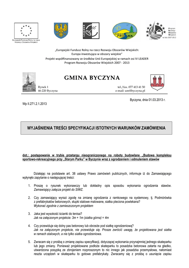 „Europejski Fundusz Rolny na rzecz Rozwoju Obszarów Wiejskich: Europa inwestująca w obszary wiejskie” Projekt współfinansowany ze środków Unii Europejskiej w ramach osi IV LEADER Program Rozwoju Obszarów Wiejskich 2007 - 2013 GMINA BYCZYNA Rynek 1 46-220 Byczyna tel./fax. 077 413 41 50 e-mail: [email protected] Byczyna, dnia 01.03.2013 r. Wp II.271.2.1.2013 WYJAŚNIENIA TREŚCI SPECYFIKACJI ISTOTNYCH WARUNKÓW ZAMÓWIENIA dot.: postępowanie w trybie przetargu nieograniczonego na roboty budowlane „Budowa kompleksu sportowo-rekreacyjnego przy „Starym Parku” w Byczynie wraz z ogrodzeniem i odmuleniem stawów Działając na podstawie art. 38 ustawy Prawo zamówień publicznych, informuje iŜ do Zamawiającego wpłynęło zapytanie o następującej treści: 1. Proszę o rysunek wykonawczy lub dokładny opis sposobu wykonania ogrodzenia stawów. Zamawiający załącza projekt do SIWZ. 2. Czy zamawiający wyrazi zgodę na zmianę ogrodzenia z ramkowego na systemowy, tj. Podmórówka z prefabrykatów betonowych, słupki stalowe malowane, siatka pleciona powlekana? Wykonać zgodnie z zamieszczonym projektem 3. Jaka jest wysokość ścianki do tenisa? Jak na załączonym projekcie: 3m + 1m (siatka górna) = 4m 4. Czy przewiduje się dolny pas betonowy lub obrzeŜe pod siatkę ogrodzeniową? Jak na załączonym projekcie, nie przewiduje się. Prosze zwrócić uwagę, Ŝe projektowana jest siatka w ramach stalowych, a nie tylko siatka ogrodzeniowa. 5. Zwracam się z prośbą o zmianę zapisu specyfikacji, dotyczącej wykonania przynajmniej jednego skateparku lub jego zmiany. PoniewaŜ projektowane podłoŜe skateparku to posadzka betonowa zatarta na gładko, utwardzona posypką ze zbrojeniem rozproszonym to nic innego jak posadzka przemysłowa, natomiast reszta urządzeń w skateparku to gotowe prefabrykaty. Zwracamy się z prośbą o usunięcie zapisu dotyczących referencji wykonania jednego skyteparki lub zmianę na wykonanie przynajmniej jednej posadzki przemysłowej, o wielkości nie mniejszej niŜ projektowany skatepark. Informuję, Ŝe Zamawiający nie zmieni wymagań dotyczących doświadczenia wykonawcy przy realizacji inwestycji gdyŜ Zamawiający Ŝąda doświadczenia adekwatnego do zamawianych przez niego zadań (produktów operacji). Ponadto z uwagi na zapisy z art. 26 ust. 2b ustawy Pzp (w brzmieniu „Wykonawca moŜe polegać na wiedzy i doświadczeniu, potencjale technicznym, osobach zdolnych do wykonania zamówienia lub zdolnościach finansowych innych podmiotów, niezaleŜnie od charakteru prawnego łączących go z nim stosunków. Wykonawca w takiej sytuacji zobowiązany jest udowodnić zamawiającemu, iŜ będzie dysponował zasobami niezbędnymi do realizacji zamówienia, w szczególności przedstawiając w tym celu pisemne zobowiązanie tych podmiotów do oddania mu do dyspozycji niezbędnych zasobów na okres korzystania z nich przy wykonywaniu zamówienia.”) Zamawiający Ŝądając doświadczenia przy budowie wskazanych w ogłoszeniu zadań (produktów operacji) w Ŝaden nie ogranicza konkurencyjności postępowania. 6. W 2011 r. moja firma wykonała inwestycję pt. “Wykonanie projektów oraz budowa szkolnych placów zabaw w ramach Programu Unijnego “Radosna Szkoła” na terenie Publicznej Szkoły Podstawowej nr 2 w Kluczborku i Publicznej Szkoły Podstawowej w Bogacicy wraz z dostawą i montaŜem wyposaŜenia” na łączną wartość 328 771,84 zł. W związku z powyŜszym mam pytanie do inwestora w/w zadania czy referencje uzyskane po wykonaniu placów zabaw mogą zostać zaakceptowane do: “Budowa kompleksu sportowo-rekreacyjnego przy Starym Parku w Byczynie wraz z ogrodzeniem i odmuleniem stawów” tj. Na budowę kortów do tenisa ziemnego oraz skateparku. W załaczeniu dołączam referencje otrzymane po wykonaniu zadania: “Wykonanie projektów oraz budowa budowa szkolnych placów zabaw w ramach Programu Unijnego “Radosna Szkoła” na terenie Publicznej Szkoły Podstawowej nr 2 w Kluczborku i Publicznej Szkoły Podstawowej w Bogacicy wraz z dostawą i montaŜem wyposaŜenia” z zakresem wykonanych prac budowlanych. Myślę, Ŝe zakres prac poszczególnych branŜ z obu zadaniach jest bardzo podobny co powoduje moŜliwość zaakceptowania moich referencji.” Zamawiający zmienia treść SIWZ w rozdziale 6.2.ppkt 2). i ogłoszenia w punkcie III.3.2) w zakresie: 1) Warunek posiadania wiedzy i doświadczenia będzie spełniony jeŜeli Wykonawca wykaŜe iŜ wykonał: zgodnie z zasadami sztuki budowlanej i prawidłowo ukończył w okresie ostatnich pięciu lat przed upływem terminu składania ofert, a jeŜeli okres prowadzenia działalności jest krótszy - w tym okresie, co najmniej co najmniej następujące roboty: − Wykonała co najmniej 2 korty tenisowe lub 2 boiska wielofunkcyjne lub 2 roboty w zakresie pokrycia powierzchni szkolnego placu zabaw wykonane w ramach Rządowego programu „Radosna Szkoła” oraz − Wykonał co najmniej 1 skatepark oraz − Wykonał co najmniej jedno odmulanie stawu lub innego zbiornika wodnego. W związku z tym, Zamawiający akceptuje propozycje dla wymagań: − Wykonała co najmniej 2 korty tenisowe lub 2 boiska wielofunkcyjne lub 2 roboty w zakresie pokrycia powierzchni szkolnego placu zabaw wykonane w ramach Rządowego programu „Radosna Szkoła” Lecz nie dla wymagania: − oraz Wykonał co najmniej 1 skatepark.