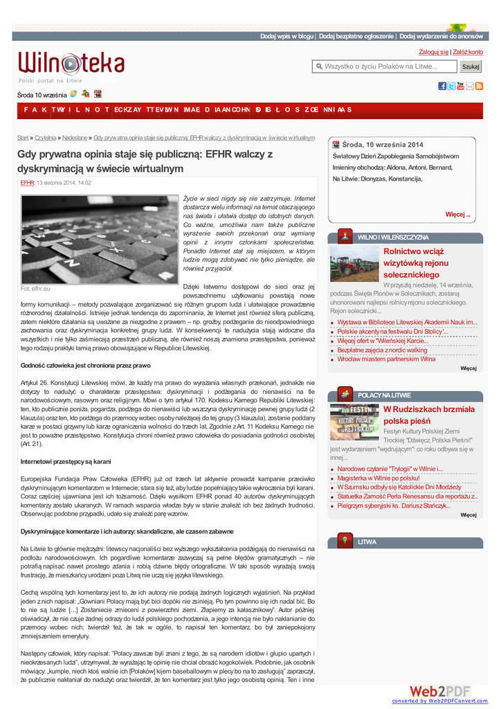 Dodaj wpis w blogu | Dodaj bezpłatne ogłoszenie | Dodaj wydarzenie do anonsów Zaloguj się | Załóż konto Wszystko o życiu Polaków na Litwie... Szukaj Środa 10 września F A K T WY I L N O T EC KZ AY TT EV LW N IM AE D IA AN CO HN S O EG Ł O S Z OE NN I AA S Start » Czytelnia » Nadesłane » Gdy prywatna opinia staje się publiczną: EFHR walczy z dyskryminacją w świecie wirtualnym Środa, 10 września 2014 Gdy prywatna opinia staje się publiczną: EFHR walczy z dyskryminacją w świecie wirtualnym Światowy Dzień Zapobiegania Samobójstwom Imieniny obchodzą: Aldona, Antoni, Bernard, Na Litwie: Dionyzas, Konstancija, EFHR, 13 sierpnia 2014, 14:02 Życie w sieci nigdy się nie zatrzymuje. Internet dostarcza wielu informacji na temat otaczającego nas świata i ułatwia dostęp do istotnych danych. Co ważne, umożliwia nam także publiczne wyrażenie swoich przekonań oraz wymianę opinii z innymi członkami społeczeństwa. Ponadto Internet stał się miejscem, w którym ludzie mogą zdobywać nie tylko pieniądze, ale również przyjaciół. Dzięki łatwemu dostępowi do sieci oraz jej powszechnemu użytkowaniu powstają nowe formy komunikacji – metody pozwalające zorganizować się różnym grupom ludzi i ułatwiające prowadzenie różnorodnej działalności. Istnieje jednak tendencja do zapominania, że Internet jest również sferą publiczną, zatem niektóre działania są uważane za niezgodne z prawem – np. groźby, podżeganie do nieodpowiedniego zachowania oraz dyskryminacja konkretnej grupy ludzi. W konsekwencji te nadużycia stają widoczne dla wszystkich i nie tylko zaśmiecają przestrzeń publiczną, ale również noszą znamiona przestępstwa, ponieważ tego rodzaju praktyki łamią prawo obowiązujące w Republice Litewskiej. Fot. efhr.eu Więcej ... WILNO I WILEŃSZCZYZNA Rolnictwo wciąż wizytówką rejonu solecznickiego W przyszłą niedzielę, 14 września, podczas Święta Plonów w Solecznikach, zostaną uhonorowani najlepsi rolnicy rejonu solecznickiego. Rejon solecznicki... Wystawa w Bibliotece Litewskiej Akademii Nauk im... Polskie akcenty na festiwalu Dni Stolicy '... Więcej ofert w ''Wileńskiej Karcie... Bezpłatne zajęcia z nordic walking Wrocław miastem partnerskim Wilna Godność człowieka jest chroniona przez prawo Artykuł 26. Konstytucji Litewskiej mówi, że każdy ma prawo do wyrażania własnych przekonań, jednakże nie dotyczy to nadużyć o charakterze przestępstwa: dyskryminacji i podżegania do nienawiści na tle narodowościowym, rasowym oraz religijnym. Mówi o tym artykuł 170. Kodeksu Karnego Republiki Litewskiej: ten, kto publicznie poniża, pogardza, podżega do nienawiści lub wszczyna dyskryminację pewnej grupy ludzi (2 klauzula) oraz ten, kto podżega do przemocy wobec osoby należącej do tej grupy (3 klauzula), zostanie poddany karze w postaci grzywny lub karze ograniczenia wolności do trzech lat. Zgodnie z Art. 11 Kodeksu Karnego nie jest to poważne przestępstwo. Konstytucja chroni również prawo człowieka do posiadania godności osobistej (Art. 21). Internetowi przestępcy są karani Europejska Fundacja Praw Człowieka (EFHR) już od trzech lat aktywnie prowadzi kampanie przeciwko dyskryminującym komentarzom w Internecie; stara się też, aby ludzie popełniający takie wykroczenia byli karani. Coraz częściej ujawniana jest ich tożsamość. Dzięki wysiłkom EFHR ponad 40 autorów dyskryminujących komentarzy zostało ukaranych. W ramach wsparcia władze były w stanie znaleźć ich bez żadnych trudności. Obserwując podobne przypadki, udało się znaleźć parę wzorów. Więcej POLACY NA LITWIE W Rudziszkach brzmiała polska pieśń Festyn Kultury Polskiej Ziemi Trockiej "Dźwięcz, Polska Pieśni!" jest wydarzeniem "wędrującym": co roku odbywa się w innej... Narodowe czytanie "Trylogii" w Wilnie i... Magisterka w Wilnie po polsku! W Szumsku odbyły się Katolickie Dni Młodzieży Statuetka Zamość Perła Renesansu dla reportażu z... Pielgrzym syberyjski ks. Dariusz Stańczyk... Więcej Dyskryminujące komentarze i ich autorzy: skandaliczne, ale czasem zabawne LITWA Na Litwie to głównie mężczyźni: litewscy nacjonaliści bez wyższego wykształcenia podżegają do nienawiści na podłożu narodowościowym. Ich pogardliwe komentarze zazwyczaj są pełne błędów gramatycznych – nie potrafią napisać nawet prostego zdania i robią dziwne błędy ortograficzne. W taki sposób wyrażają swoją frustrację, że mieszkańcy urodzeni poza Litwą nie uczą się języka litewskiego. Cechą wspólną tych komentarzy jest to, że ich autorzy nie podają żadnych logicznych wyjaśnień. Na przykład jeden z nich napisał: „Gówniani Polacy mają być bici dopóki nie zsinieją. Po tym powinno się ich nadal bić. Bo to nie są ludzie […] Zostaniecie zmieceni z powierzchni ziemi. Złapiemy za kałasznikowy”. Autor później oświadczył, że nie czuje żadnej odrazy do ludzi polskiego pochodzenia, a jego intencją nie było nakłanianie do przemocy wobec nich; twierdził też, że tak w ogóle, to napisał ten komentarz, bo był zaniepokojony zmniejszeniem emerytury. Następny człowiek, który napisał: ”Polacy zawsze byli znani z tego, że są narodem idiotów i głupio upartych i nieokrzesanych ludzi”, utrzymywał, że wyrażając tę opinię nie chciał obrazić kogokolwiek. Podobnie, jak osobnik mówiący: „kumple, niech ktoś walnie ich [Polaków] kijem baseballowym w plecy bo na to zasługują” zaprzeczył, że publicznie nakłaniał do nadużyć oraz twierdził, że ten komentarz jest tylko jego osobistą opinią. Ten i inne converted by W eb2PDFConvert.com komentarze, w których mówi o Polakach z Wilna, sugerując, że powinni być zabrani do obozu koncentracyjnego w Auschwitz, zostały napisane z powodu wściekłości na Polaków za to, że nie uczą się języka litewskiego. Jednak sam pisał bez używania litewskich liter oraz nie potrafił poprawnie napisać wie