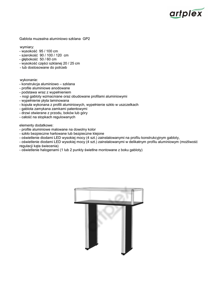 Gablota muzealna aluminiowo szklana GP2 wymiary: - wysokość 95 / 100 cm - szerokość 90 / 100 / 120 cm - głębokość 50 / 60 cm - wysokość części szklanej 20 / 25 cm - lub dostosowane do potrzeb wykonanie: - konstrukcja aluminiowo – szklana - profile aluminiowe anodowane - podstawa wraz z wypełnieniem - nogi gabloty wzmacniane oraz obudowane profilami aluminiowymi - wypełnienie płyta laminowana - kopuła wykonana z profili aluminiowych, wypełnienie szkło w uszczelkach - gablota zamykana zamkami patentowymi - drzwi otwierane z przodu, boków lub góry - całość na stopkach regulowanych elementy dodatkowe: - profile aluminiowe malowane na dowolny kolor - szkło bezpieczne hartowane lub bezpieczne klejone - oświetlenie diodami LED wysokiej mocy (4 szt.) zainstalowanymi na profilu konstrukcyjnym gabloty, - oświetlenie diodami LED wysokiej mocy (4 szt.) zainstalowanymi w delikatnym profilu aluminiowym (możliwość regulacji kąta świecenia) - oświetlenie halogenami (1 lub 2 punkty świetlne montowane z boku gabloty)