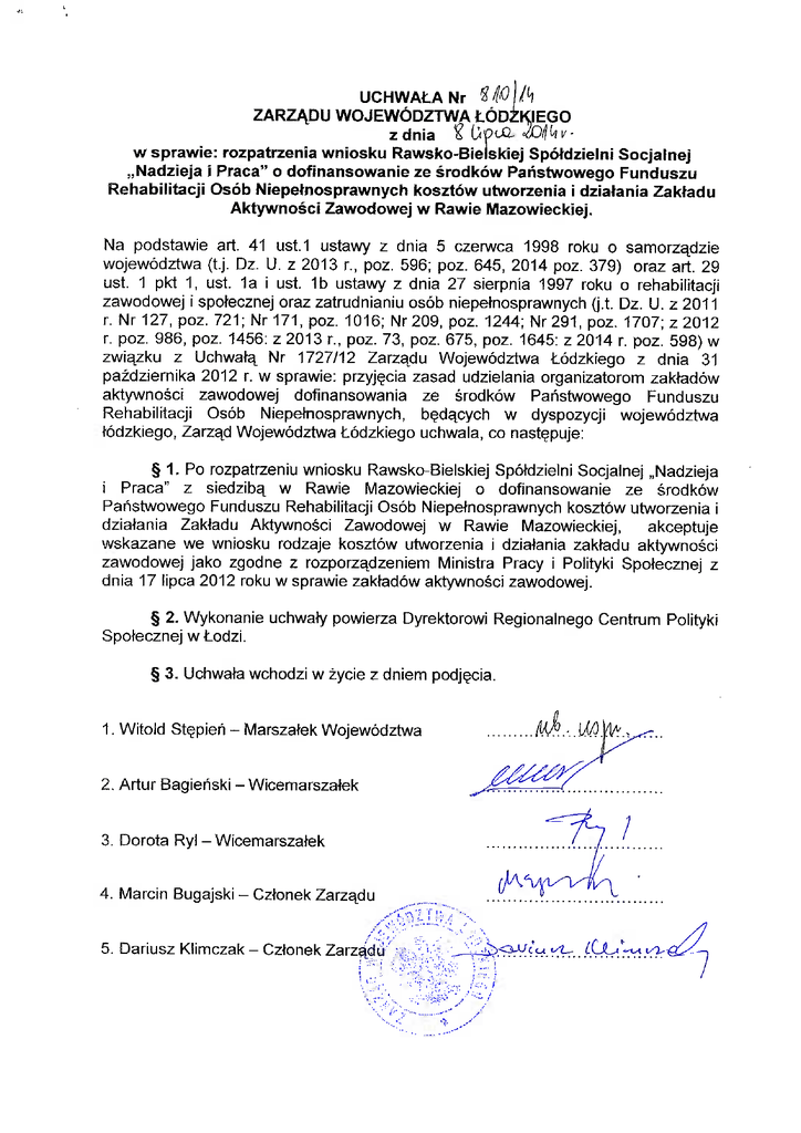 UcHWALANr ZARZApUWOJEWeDZnNA zdnia g WSpraWie:roZpatrZeniawnioskuRawsko−B 園田器 ”NadziejaiPraca”odofinansowarliezeSrodk6wPalistwowegoFurIduszu RehabiiitacjiOsdbNiepeJnosprawnychkoszt6wutworzeniaidziaAaniaZakねdu AktywnoSciZawodowejwRawieMazowieckiej. Na podstawie a正41ustl ustawyz dn−a5czerwca1998roku o samorzadzie WOjewddztwa(t・」Dz・∪・Z2013rっpoz596;POZ.645,2014poz.379)0raZah29 ustl pktl,uSt・1aIuSt・1bustawzdnla27sierpnia1997rokuorehab冊aql ZaWOdoweJispolecznqorazzatrudnianiuos6bniepeinosprawnych陣Dz U。Z2011 r Nr127iPOZ−721;Nr171,POZ・1016;Nr209,POZ・1244;Nr291,POZ.1707;Z2012 r POZ・986,POZ・1456:Z2013「っpoz・73,POZ・675,POZ.1645:Z2014「.poz.598)w ZWiazku z Uchwala Nr1727/12Zarzadu Wqewddztwa Lddzkiego z dnia 31 PaZdziernika2012r・WSPraWie:PrZyJeCiaZaSadudzielaniaorganizatoromzakねd6w aktywnoSci zawodowej dofinansowania ze SrodkOw Pahstwowego Funduszu Rehab冊acji Osdb Niepehosprawnych,bedacych w dyspozyql WqJeWddztwa Iddzkiego,ZarzadWqjewddztwaLbdzkiegouchwala,COnaStePuje〃 §1“PorozpatrzeniuwnioskuRawsko−BielskiejSpOIdzieiniSoqaInej”Nadzieja i Praca’’z siedziba w Rawie Mazowieckiej o dofinansowanie ze Srodkdw PahstwowegoFunduszuRehabiiitaBiOsdbNlePetnosprawnychkosztOwutworzeniai dzIaねnia ZakJadu AktywnoScI Zawodowei W Rawle Mazowieckiej,akceptuJe WSkazanewewniosku rodzaJekosztdwutworzeniaidziaねniazakねduaktywnoSci ZaWOdoweJJakozgodnezrozporzadzeniem Mi…Stra PracyiPolitykiSpoleczneJZ dma17ilPCa2012rokuwsprawiezakねddwaktywnoScizawodowq. §2・Wykonanieuchwa母POWierzaDyrektorowiRegionalnegoCentrumPoiityki SpolecznejwLodzi. §3°UchwalawchodziwZyciezdniempodjecia. 1.W,t。一dStepi。h−Ma。SZa..kWq。Wddztwa .誰.LP 2−AHurBagiehski−Wicemarszaiek 3.DorotaRyl−WicemarszaIek 4・MarcinBugajski−CzlonekZarzaqu 5.DariuszKilmCZak−CzbnekZarz Uzasadnienle W dniu O9・042014 roku w sledzibie Regionainego Centrum Politykl SpoleczneJWLodziZOStalzirOZonywniosekRawsko−BiaisklejSp61dzieInlSocjaInei ”Nadziejai Praca”o dofinansowanie ze Srodkdw PFRON kosztdw utworzenia idzialaniaZakねduAktywnoSciZawodowejwRawieMazowieck画 Zgodnie z Zasadaml udzieiania organizatorom zakAad6w aktywnoSci ZaWOdowejdofinansowaniazeSrodkdwPahstwowegoFunduszuRehab冊aqiOs6b Niepelnosprawnych,bedacychwdyspozyqIWqiew6dztwaLbdzkjego,StanOWlaCyml Zalacznik do UchwaIy Nr1727/12 Zarzadu Wqjewbdztwa Lddzkiego z dnia 31・10・2012roku w sprawie:PrZyJeCia zasad udzielania organizatorom zakIadew aktywnoSci zawodowej dofinansowania ze Srodk6w Pahstwowego Funduszu Rehabilitacji Osbb Niepehosprawnych,bedacych w dyspozyqi Wqjewddztwa Lddzkiego,Zarzad Wqiewbdztwa Lddzkiego akceptuje Wniosek pod wzgiedem PraWidJowoScIPianowanych kosztdwutworzenjaidziaJaniaZakkldu,PO uPrZedmm ZaPOZnaniu sIe Z OPlnia Komkji ds.zaopiniowania Wnioskdw o dof,nanSOWanie kosztOwutrzymaniaidziaねniazakTadbwaktywnOSciZaWOdoweJnt PrZedmlOtOWegO Wniosku− Przedstawionyprqjektuchwa巾Znajdujeswqieuzasadnieniewobowiazujacym Stanieprawnym.